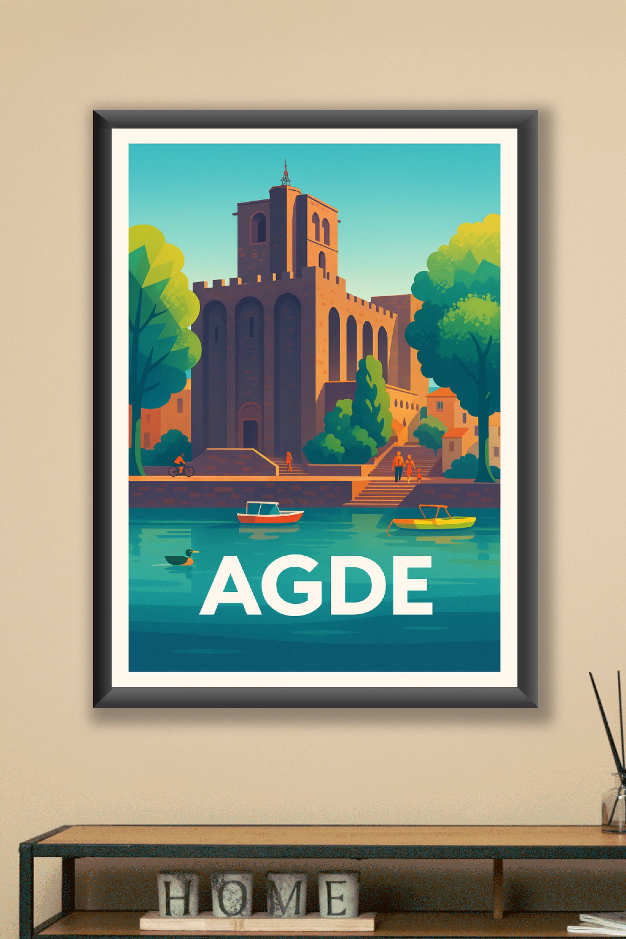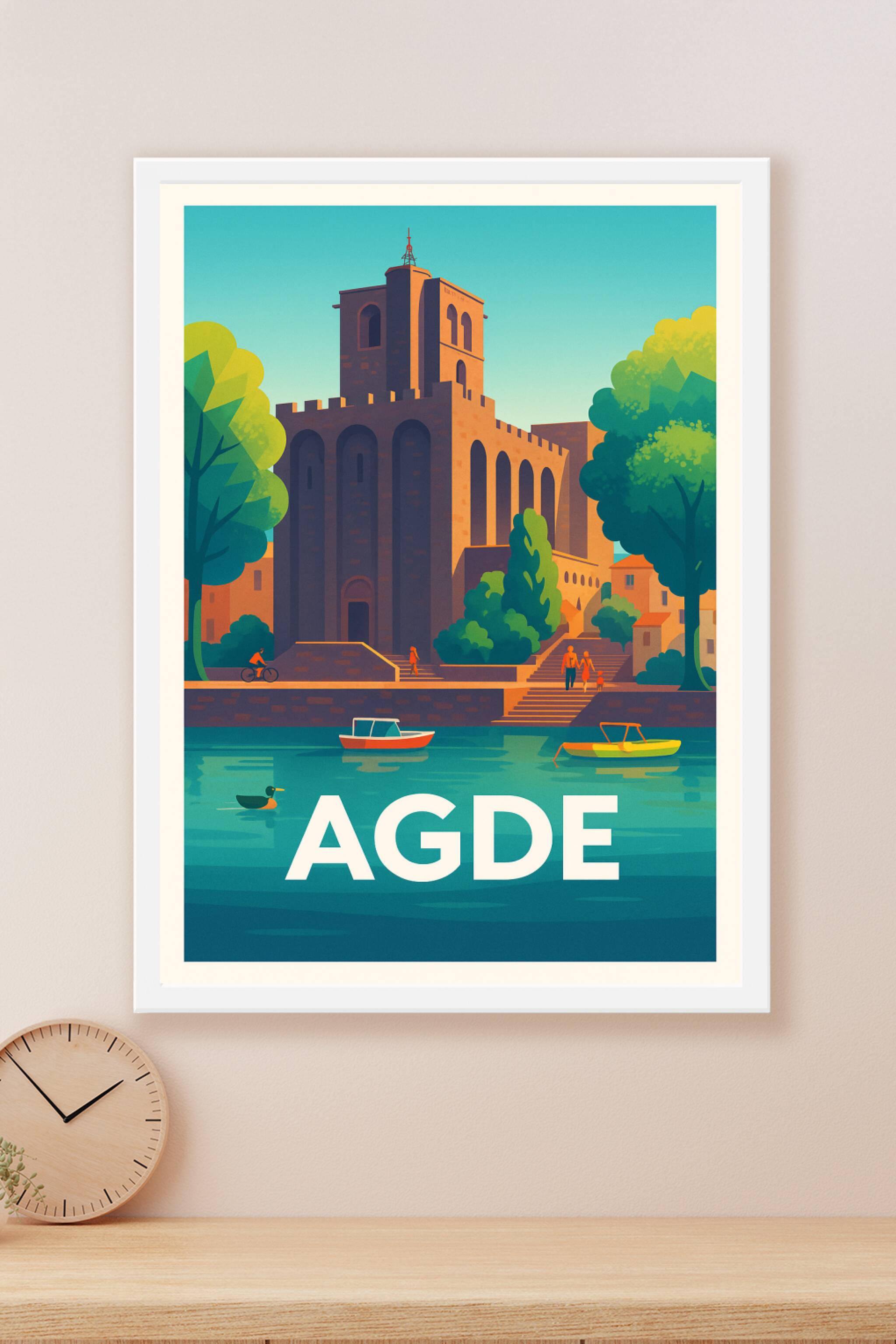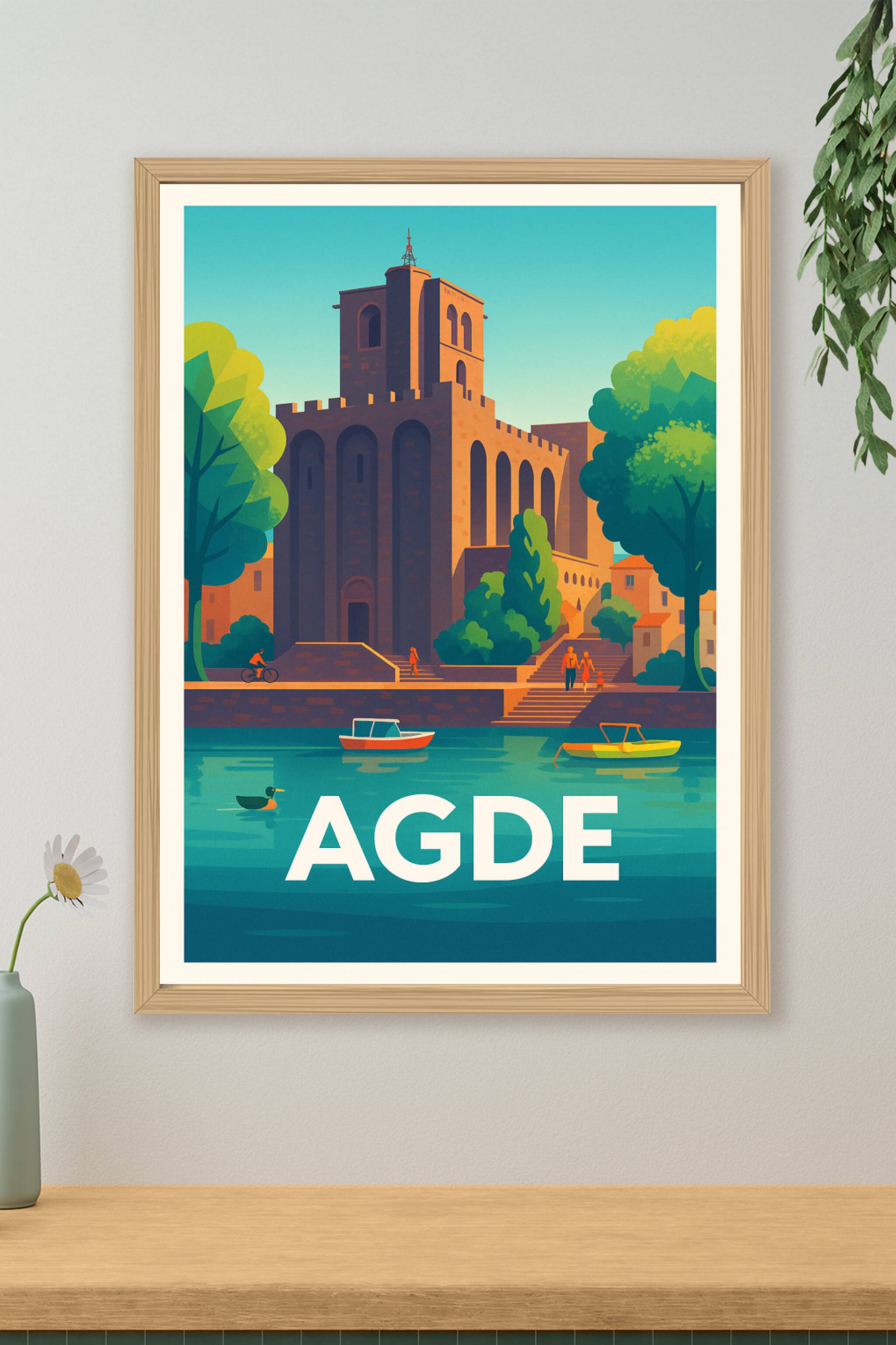 Découvrez la ville d'Agde à travers cette magnifique affiche illustrée au style rétro-moderne. Le cœur historique, avec son église emblématique en pierre volcanique, se détache majestueusement sur les rives de l’Hérault, dans une scène baignée de lumière et de sérénité. Ce poster capture de manière artistique l’essence méditerranéenne et patrimoniale de la ville. Chaque tirage est imprimé en qualité "Fine Art" sur papier 305g en coton pour un rendu riche en couleurs et en détails. Disponible en formats A1 à A4, avec ou sans cadre, cette affiche est idéale pour sublimer votre décoration ou pour offrir un souvenir chaleureux aux amoureux du Sud de la France. Fabrication 100% française et impression premium garantie.