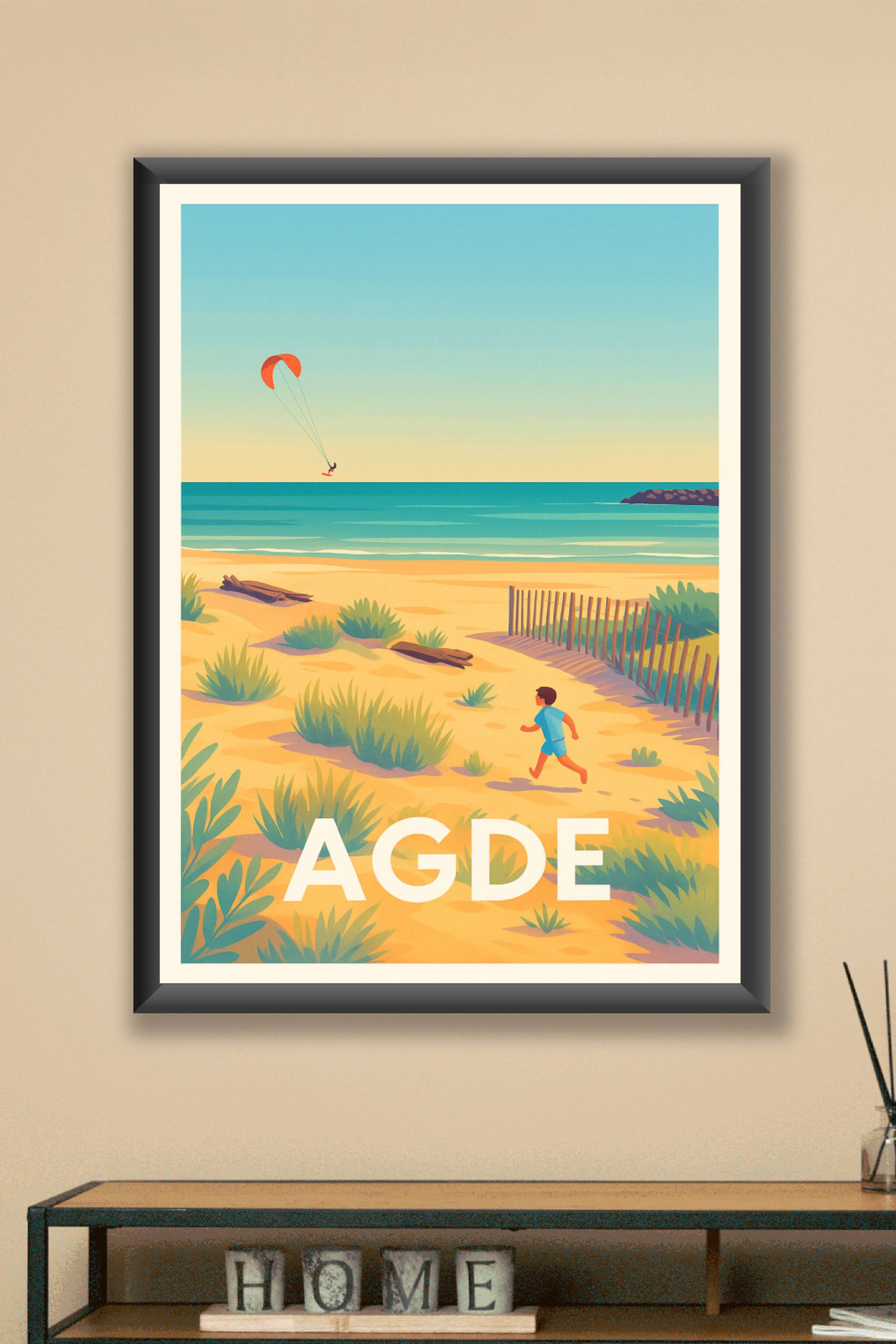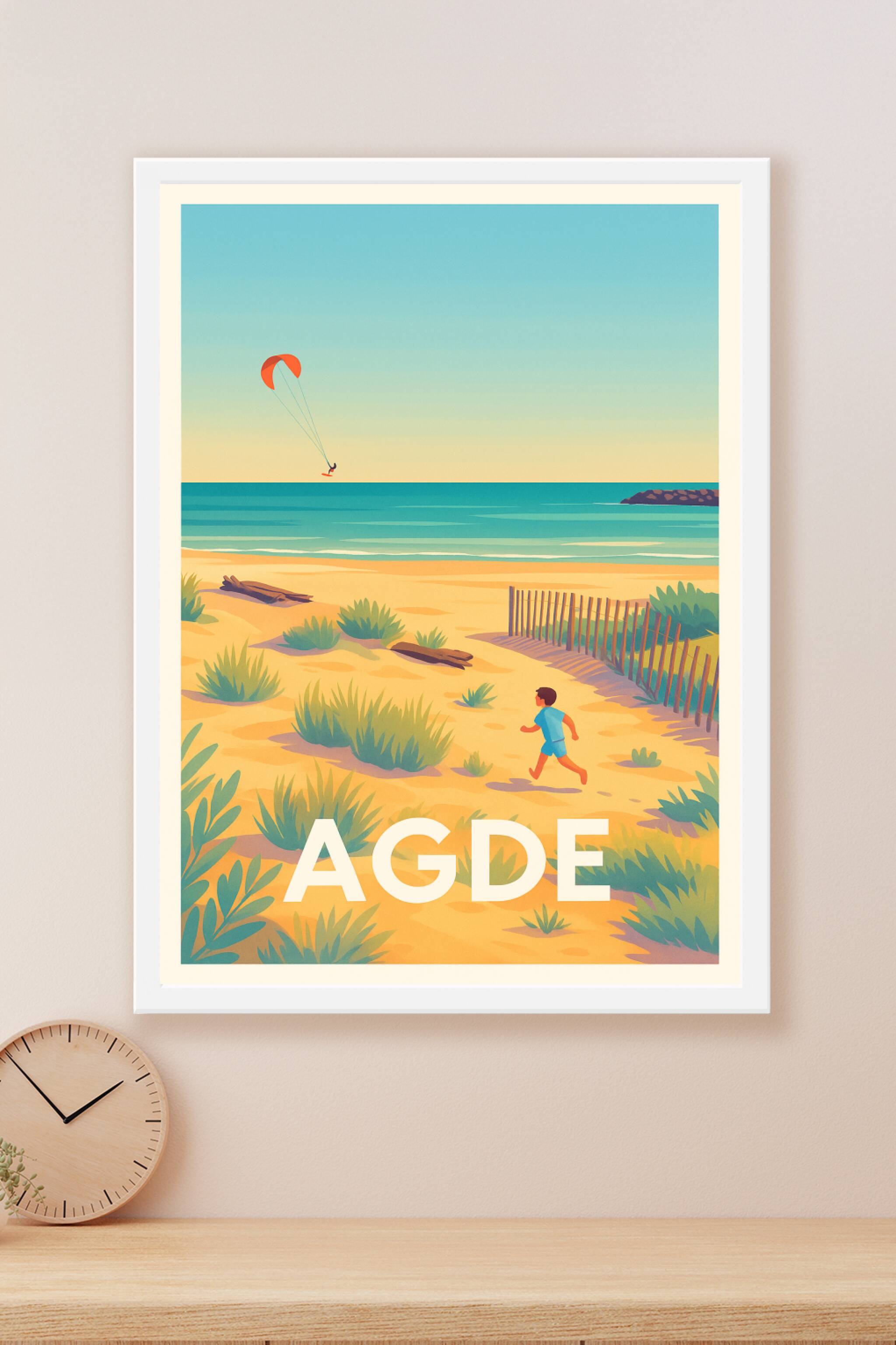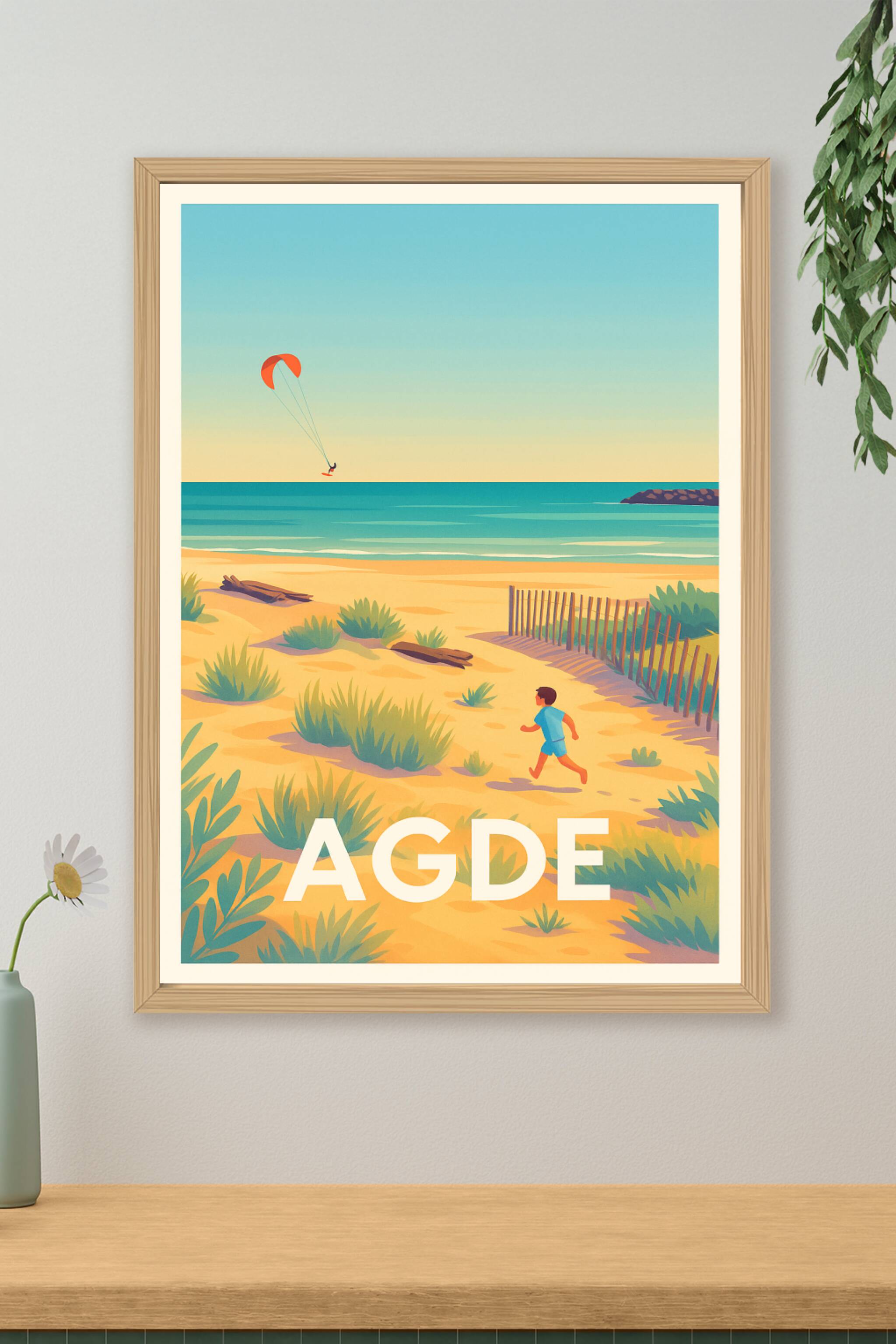Cette affiche colorée capture toute la douceur de vivre d’Agde, entre dunes dorées, végétation sauvage et horizon maritime. Avec son style néo-rétro, ce poster illustré transporte instantanément en vacances, entre balades sur le sable chaud et escapades sportives en kitesurf. Imprimée en tirage Fine Art sur papier 305g 100% coton, cette œuvre bénéficie d’une qualité d’impression supérieure, idéale pour embellir un intérieur avec élégance et chaleur. Disponible au format A1, A2, A3 et A4, avec ou sans cadre, ce poster est une parfaite idée cadeau ou un souvenir raffiné de la Méditerranée à afficher fièrement chez soi. Impression française haut de gamme.