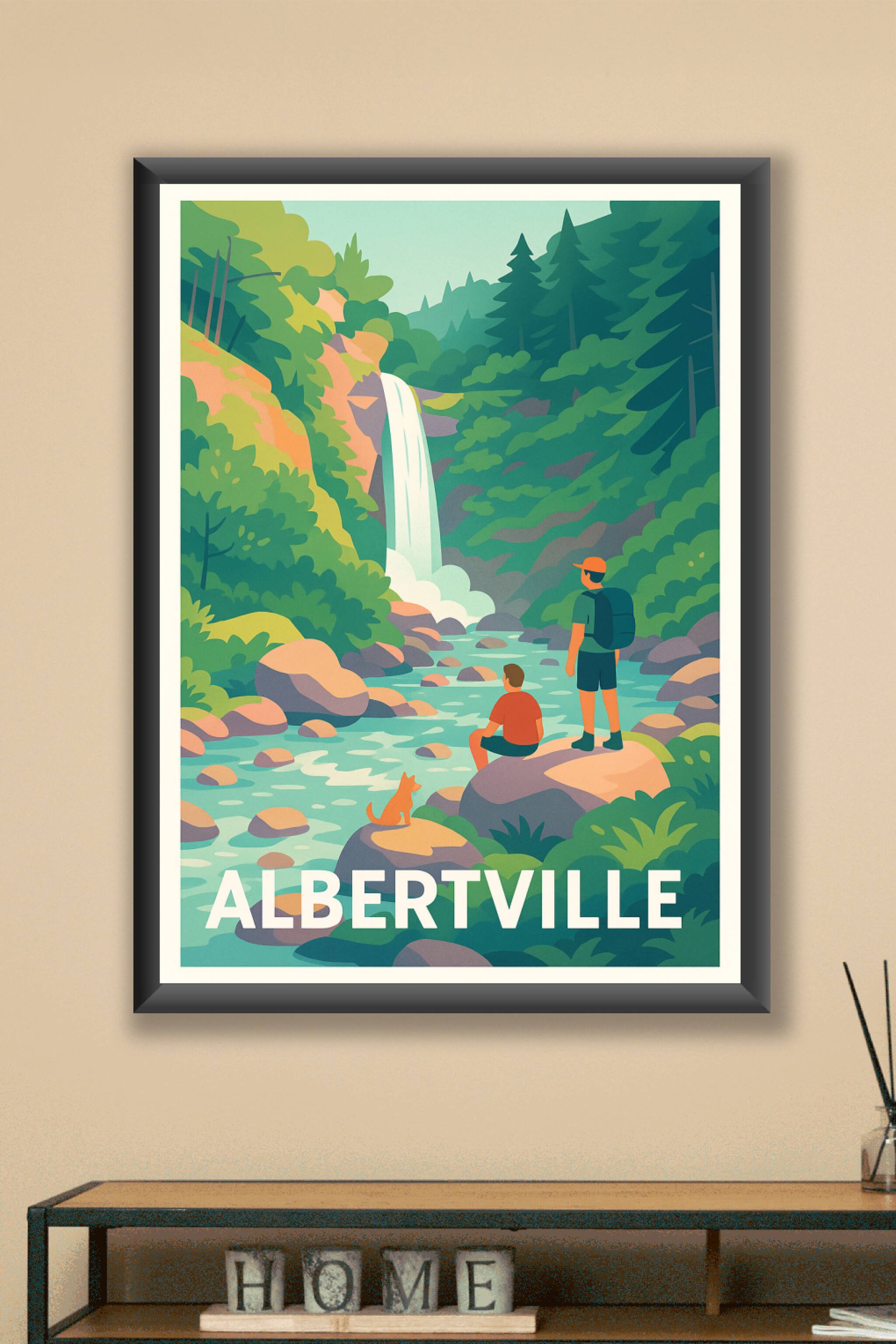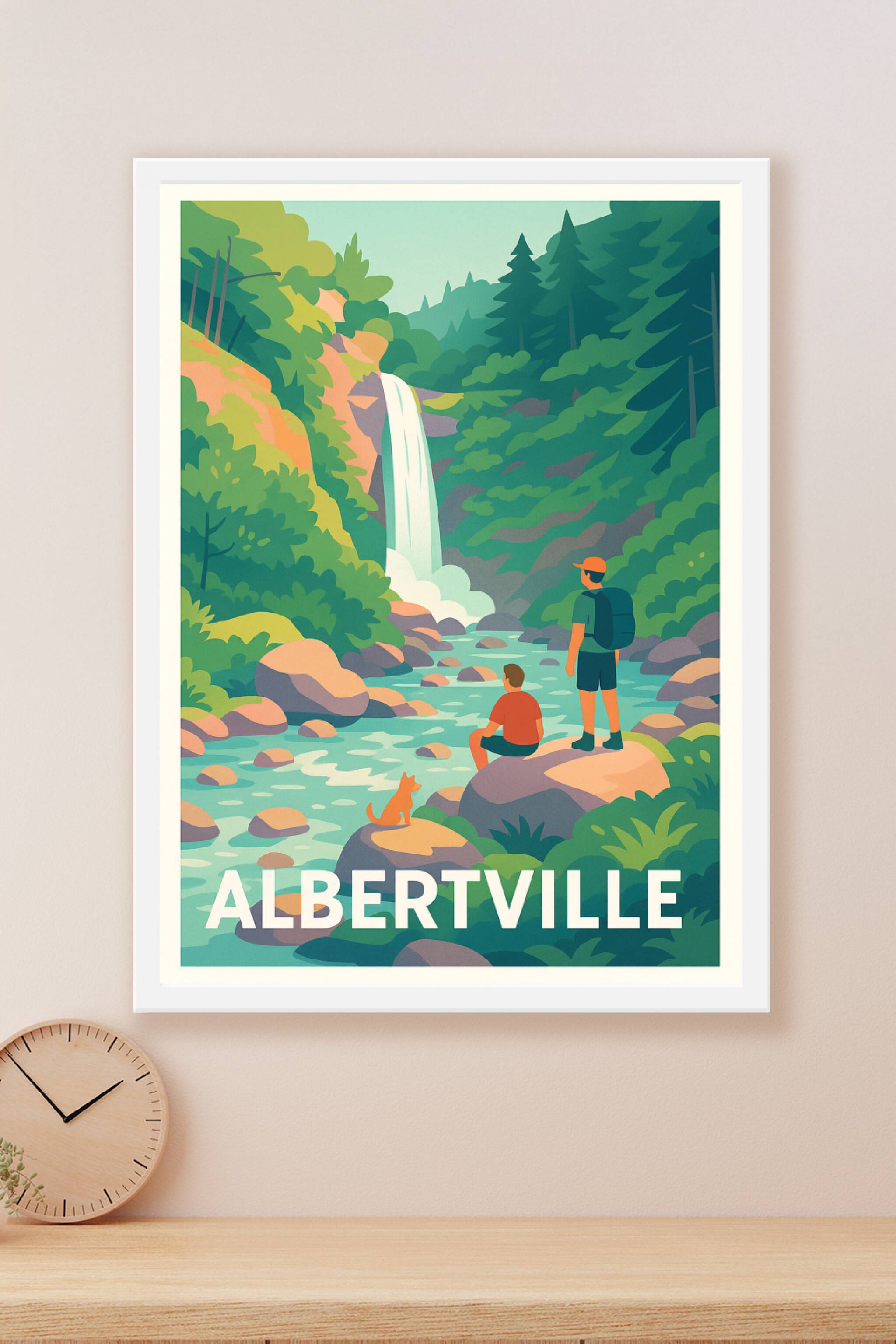 Découvrez la beauté sauvage d'Albertville avec cette affiche au style illustratif doux et coloré, qui met en scène une cascade en pleine nature ent...