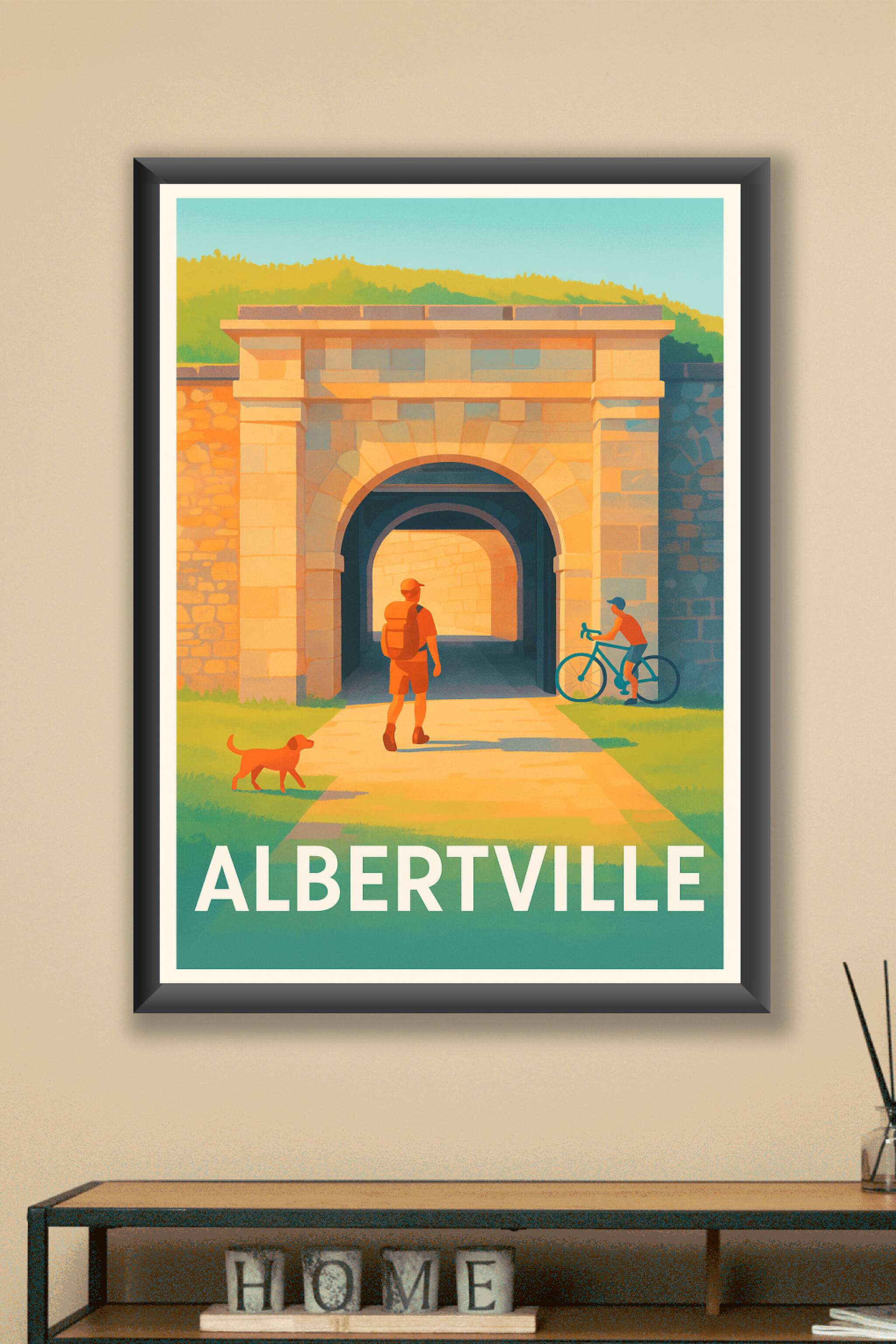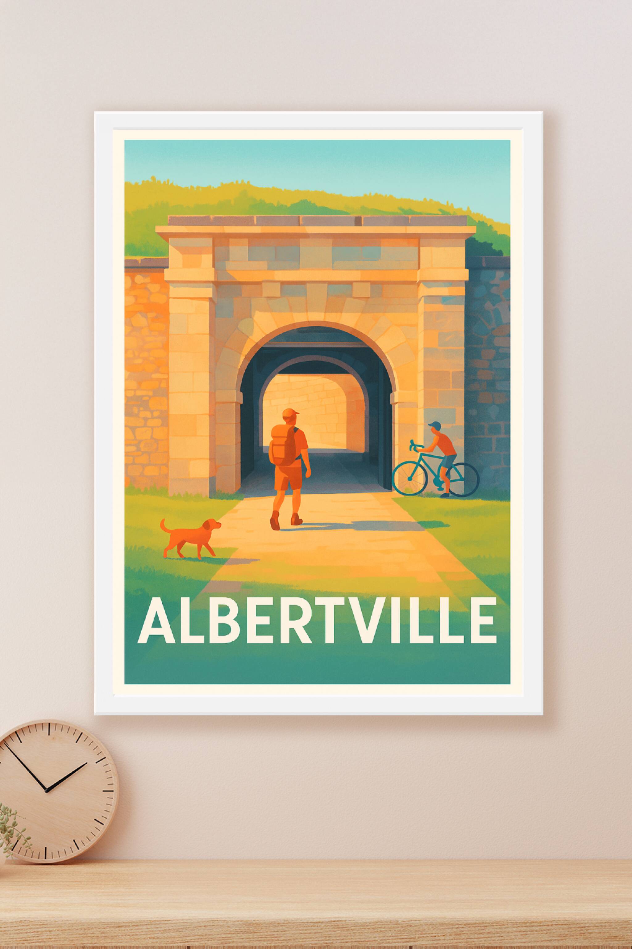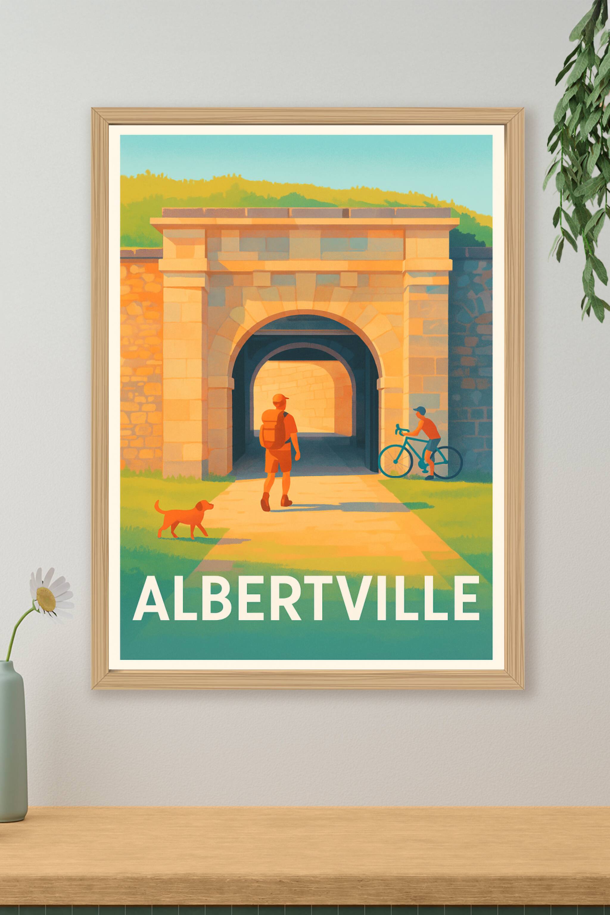 Découvrez l'atmosphère paisible et chaleureuse d'Albertville avec cette affiche illustrée mettant en scène une porte monumentale baignée par la lum...