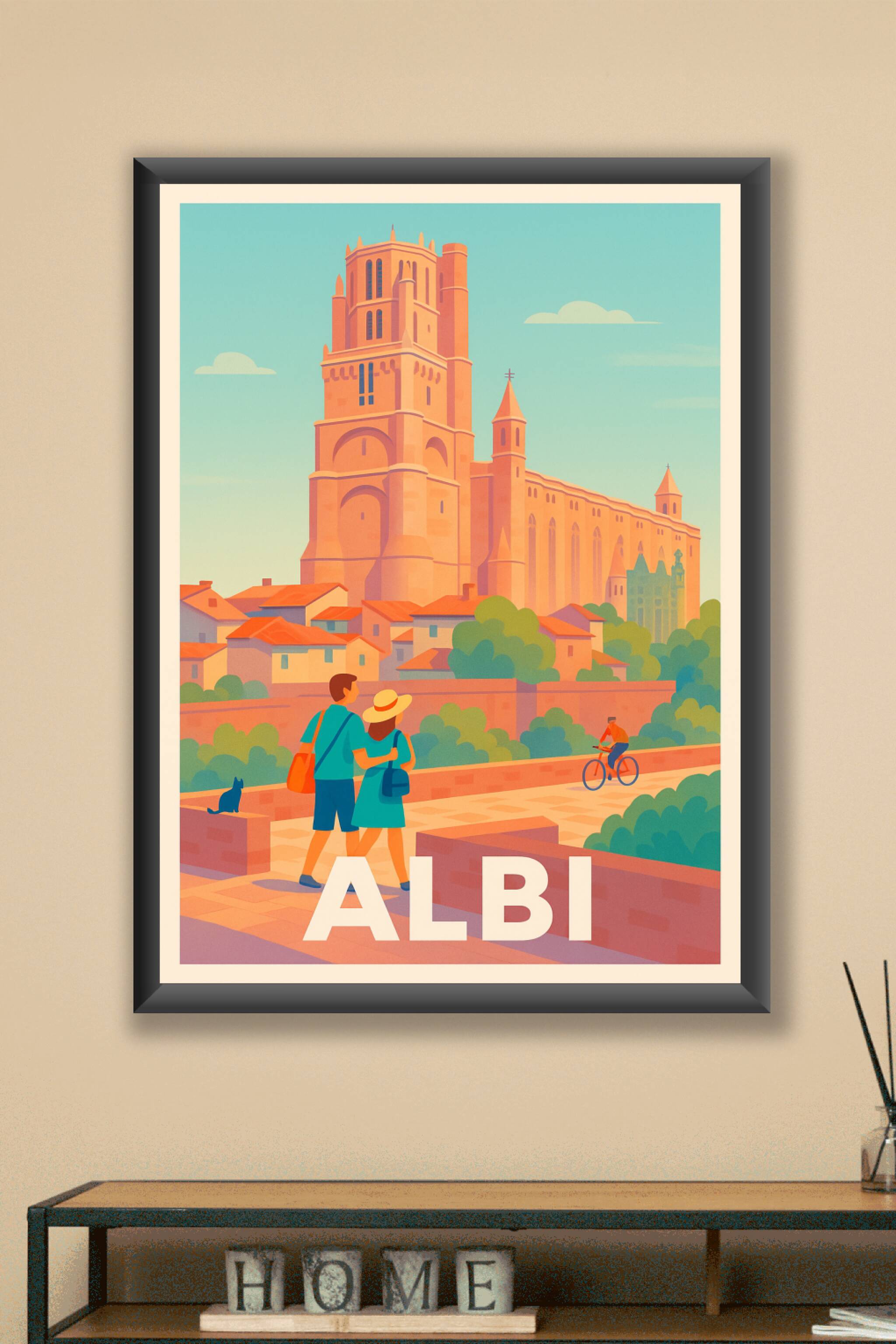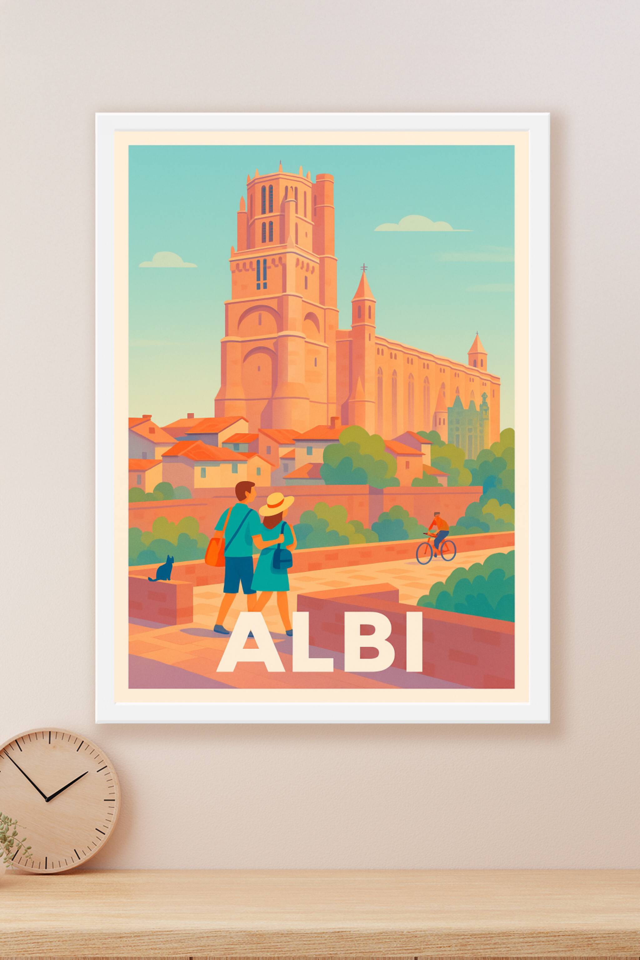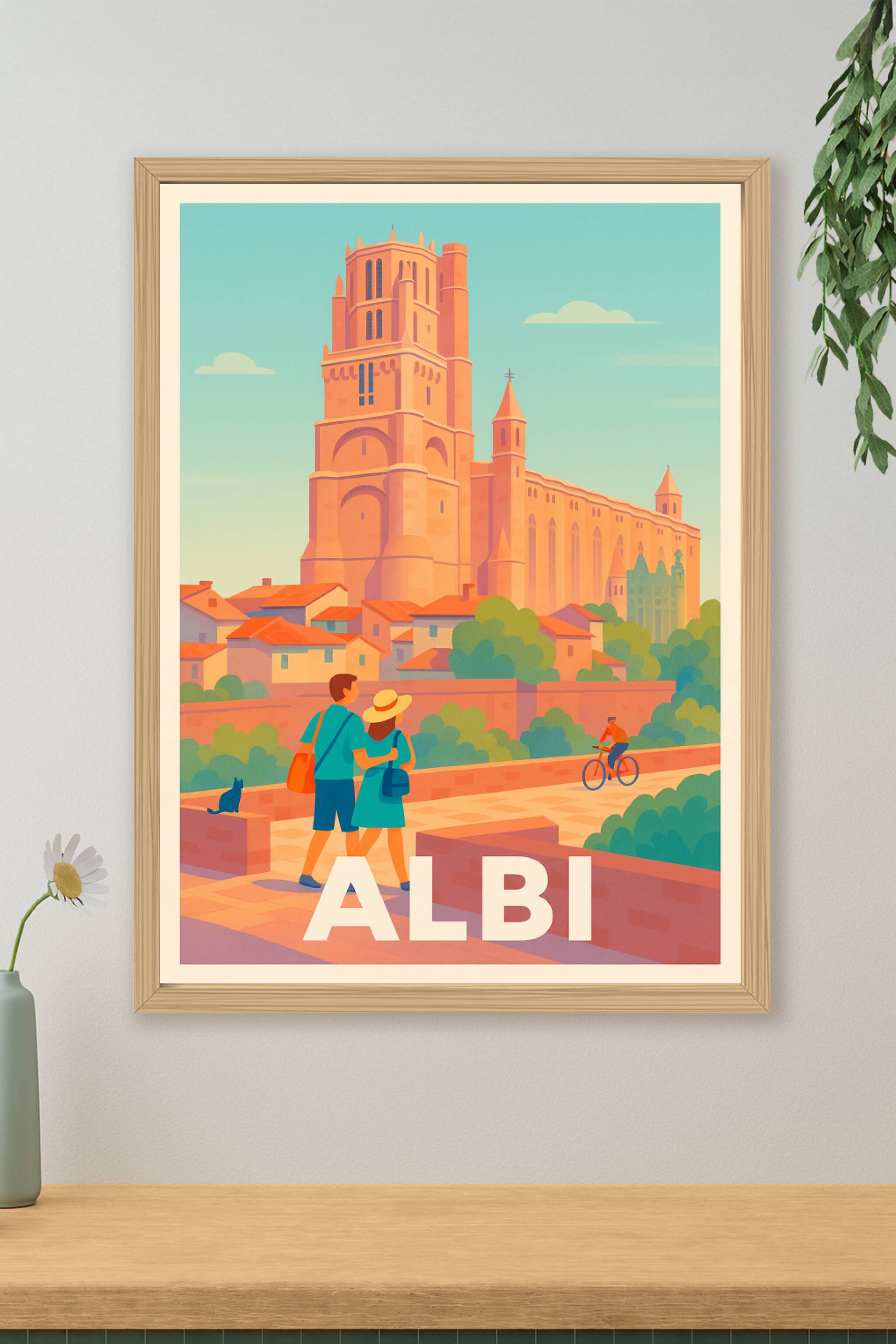 Laissez-vous transporter par l’atmosphère chaleureuse du Sud-Ouest avec cette affiche illustrée mettant en lumière la majestueuse cathédrale Sainte-Cécile d'Albi. Le style néo-rétro et les couleurs douces évoquent à merveille l’ambiance paisible de cette ville classée au patrimoine mondial de l’UNESCO. Ce poster est une invitation au voyage et à la découverte de l’architecture unique de la cité albigeoise. Imprimée en tirage Fine Art sur papier coton 305g, cette affiche assure une qualité d’impression exceptionnelle. Disponible en formats A1 à A4, avec ou sans cadre, elle s'intégrera parfaitement à toutes les décorations intérieures. Offrez-vous ou offrez un souvenir raffiné d’Albi, 100% fabriqué en France.