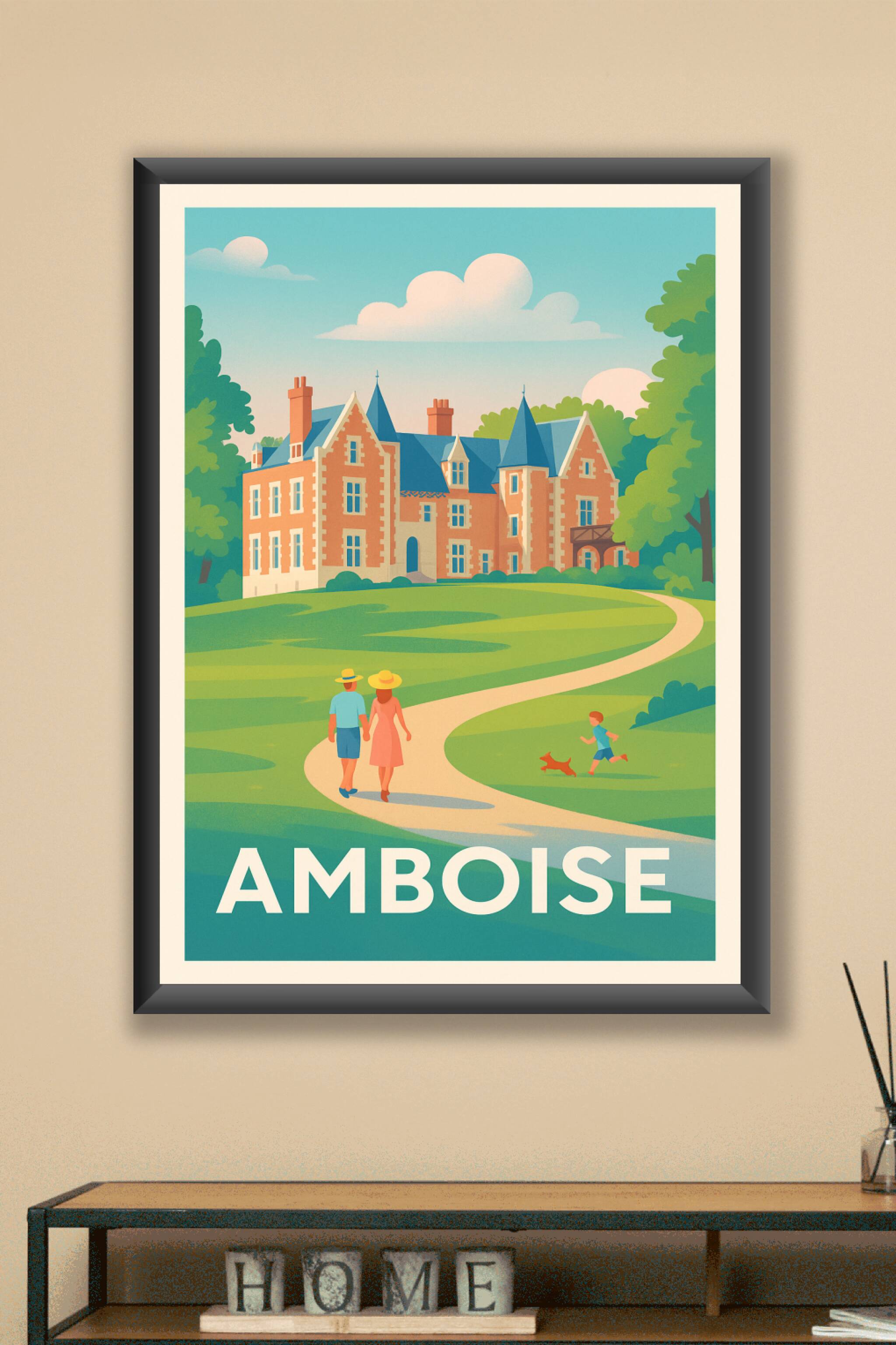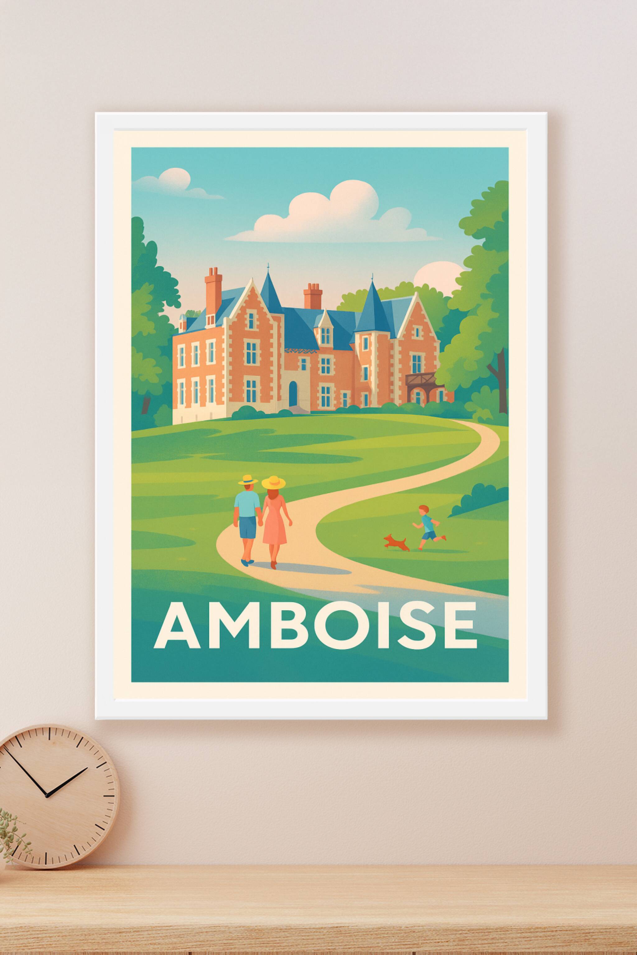 Offrez-vous un voyage dans le temps avec cette affiche illustrée d’Amboise, capturant la douce atmosphère d'une journée ensoleillée autour du célèb...