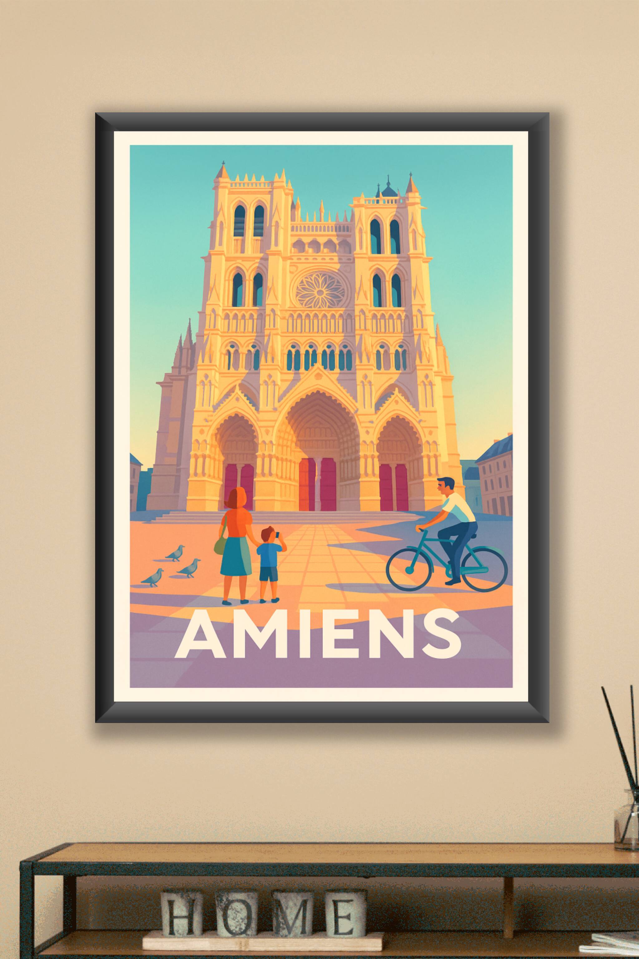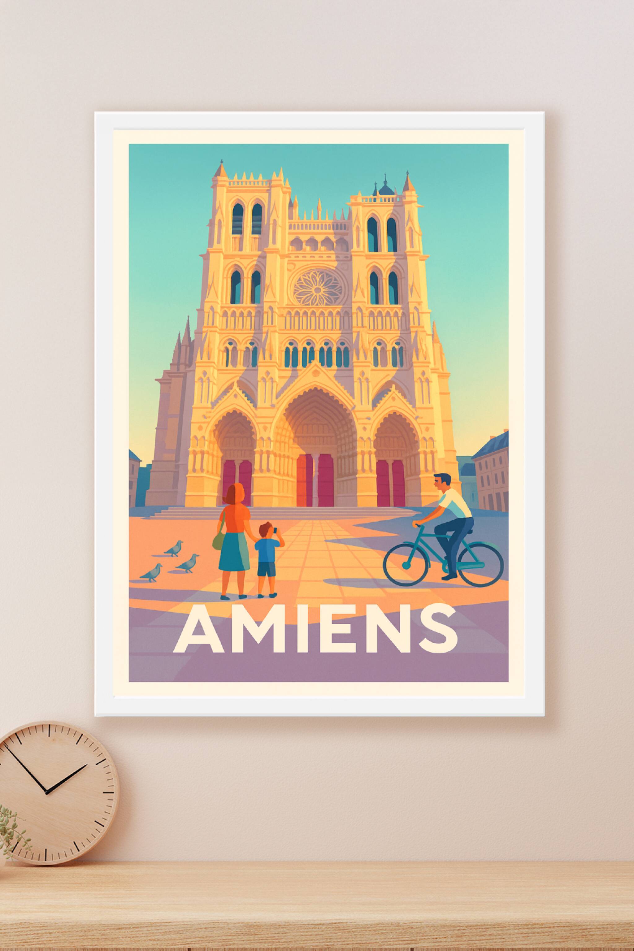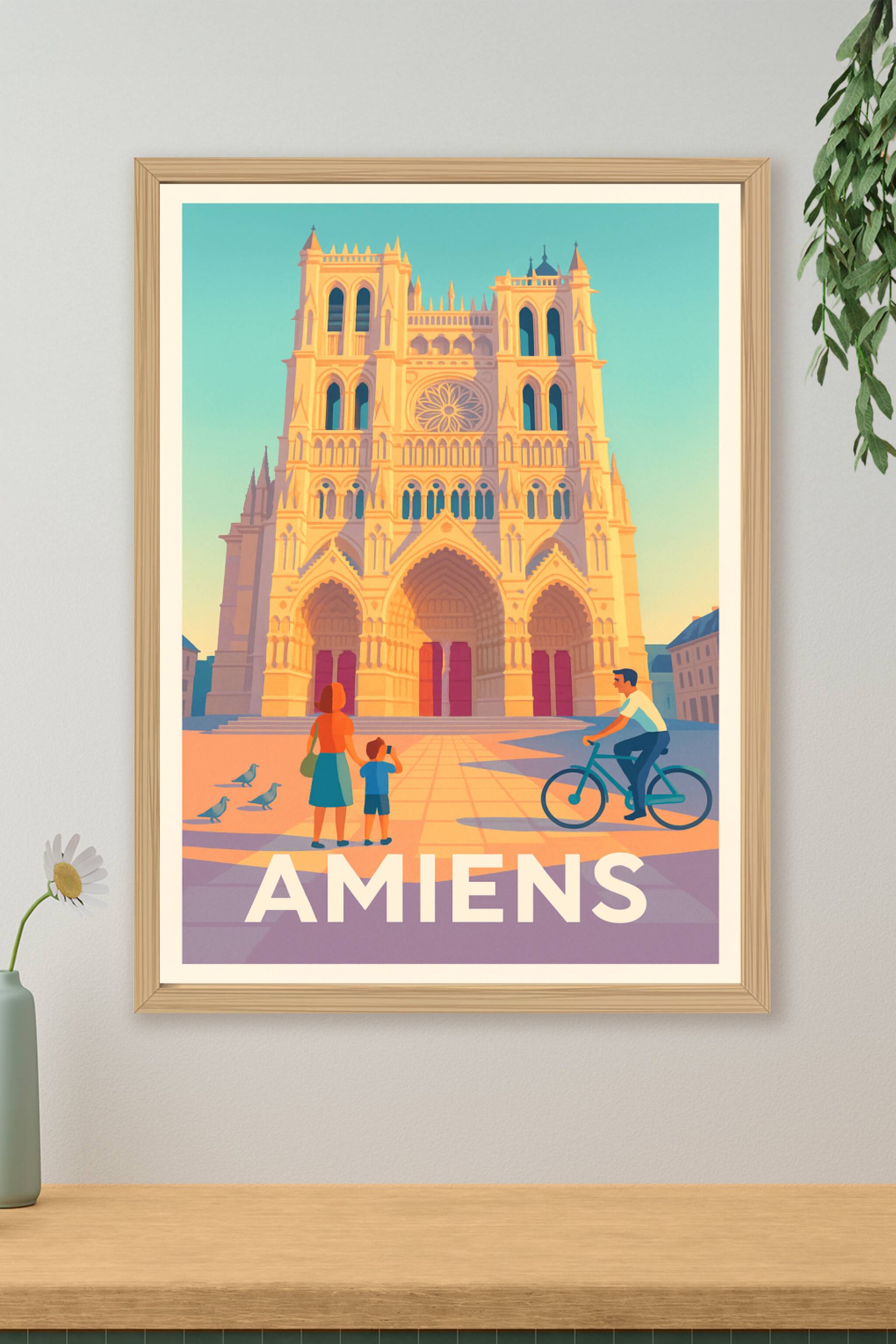 Découvrez la majesté de la Cathédrale Notre-Dame d'Amiens à travers cette affiche illustrée aux couleurs chaudes du coucher de soleil. Ce poster capture parfaitement l'architecture gothique emblématique et l'ambiance paisible de la place, où visiteurs et habitants se croisent. Imprimée en tirage "Fine Art" sur papier 305g coton haut de gamme, cette affiche assure une qualité d'impression exceptionnelle avec des couleurs vives et des détails soignés. Disponible en plusieurs formats du A1 au A4, avec ou sans cadre, elle s'adapte à tous les styles d'intérieur. Apportez une touche d'histoire et d'art à votre décoration ou offrez un cadeau unique aux amoureux d'Amiens.