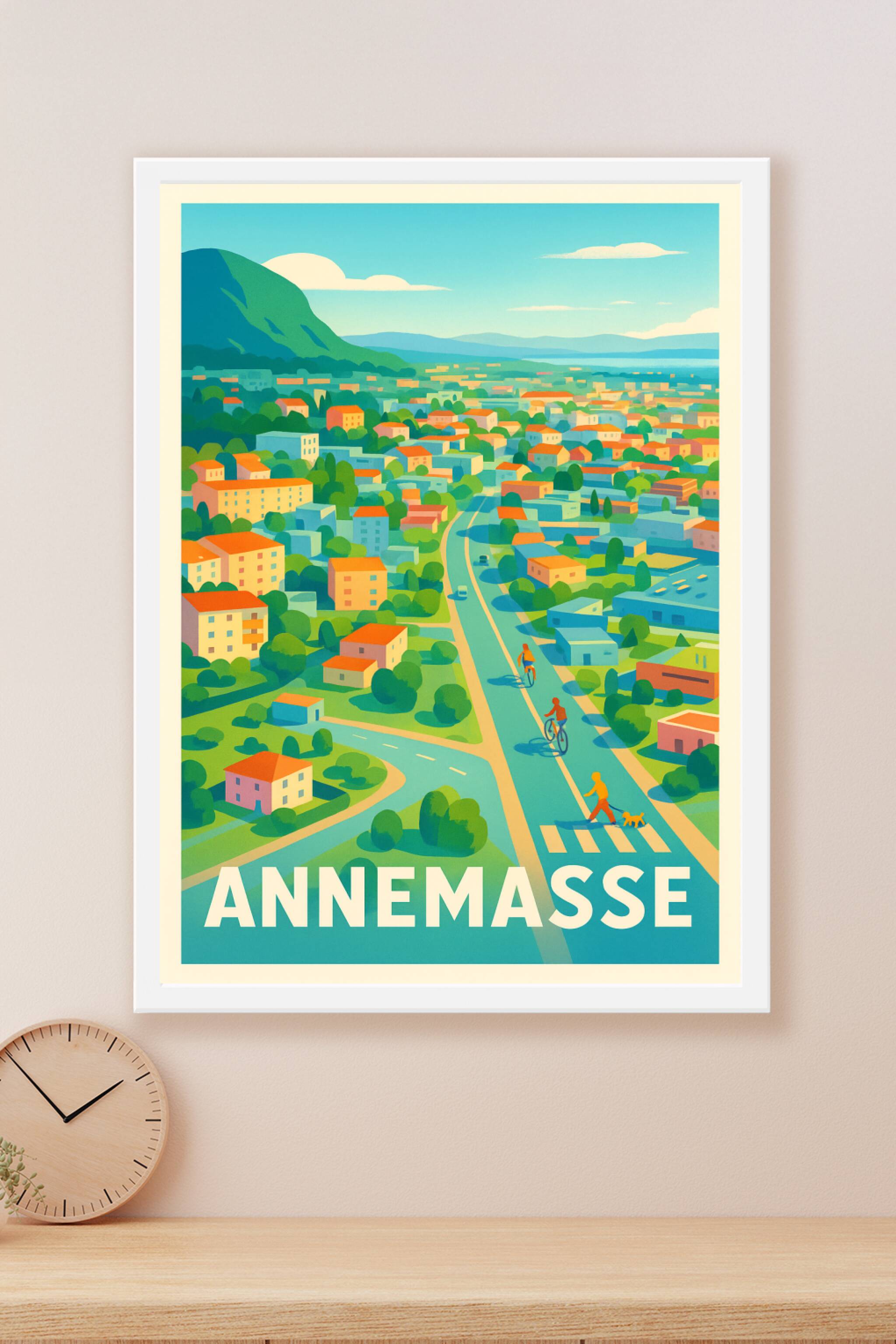 Découvrez l'atmosphère apaisante et le charme verdoyant d'Annemasse à travers cette affiche illustrée aux couleurs vives et harmonieuses. Ce poster...