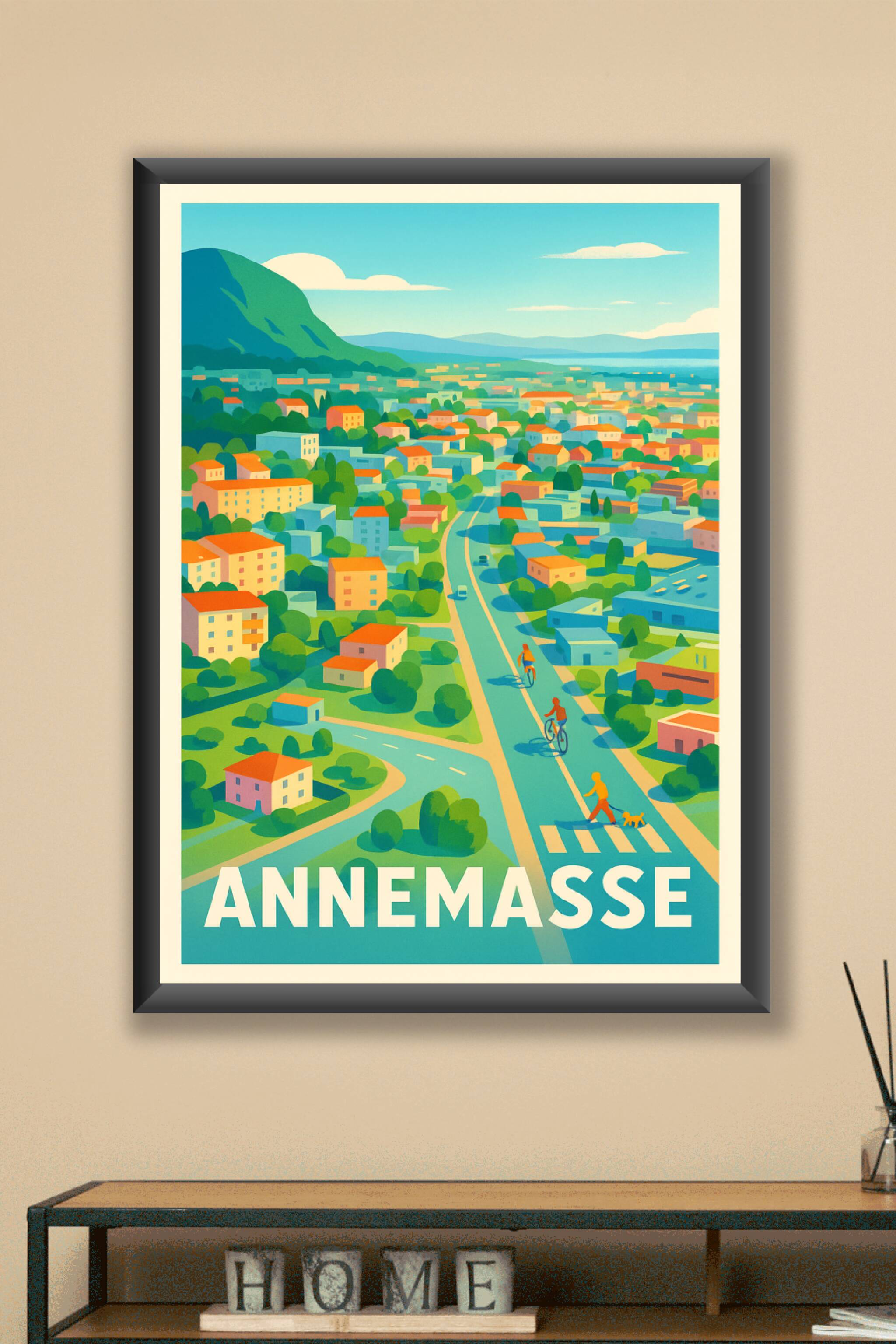 Découvrez l'atmosphère apaisante et le charme verdoyant d'Annemasse à travers cette affiche illustrée aux couleurs vives et harmonieuses. Ce poster met en valeur le paysage urbain, avec ses toits orangés, ses nombreux espaces verts, et une dynamique douce de vie locale entre cyclistes et promeneurs. Idéal pour apporter une touche de sérénité et de fraîcheur à votre intérieur, cette affiche est imprimée en tirage "Fine Art" sur papier coton 305g, garantissant une qualité d'impression haut de gamme et une durabilité exceptionnelle. Disponible en formats A1 à A4, avec ou sans cadre, ce poster allie esthétisme et finesse pour ravir les amateurs de décoration contemporaine ou les amoureux d'Annemasse. Profitez d'un produit 100% fabriqué en France, parfait pour sublimer votre espace ou offrir un cadeau unique et élégant.