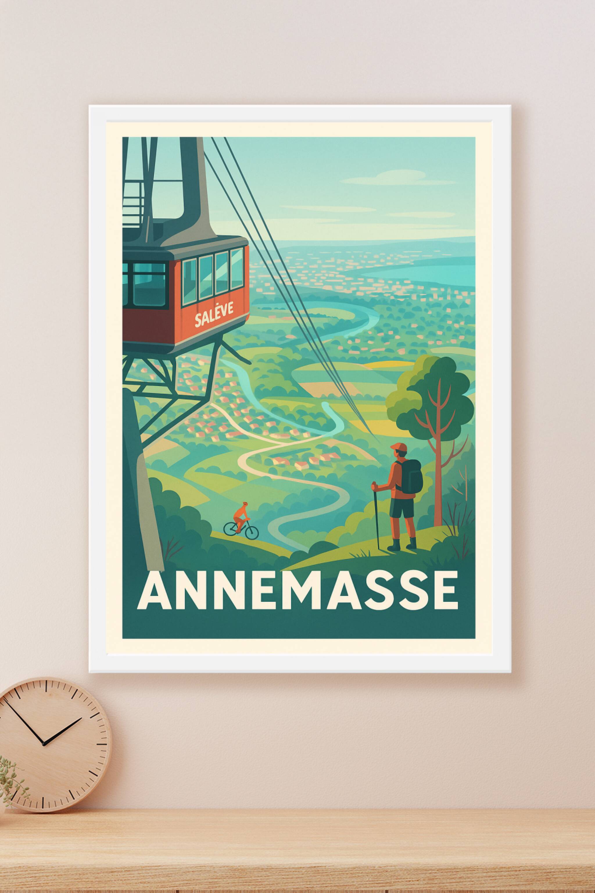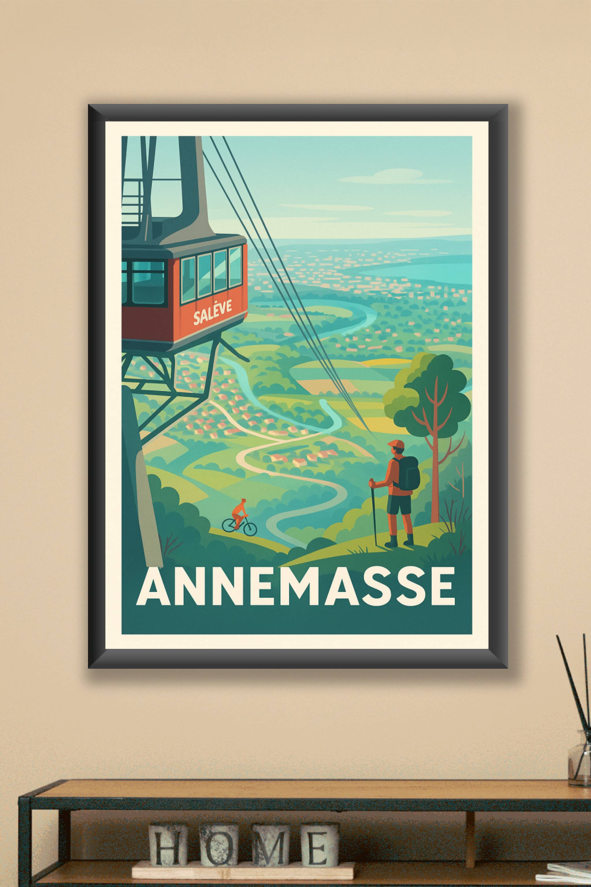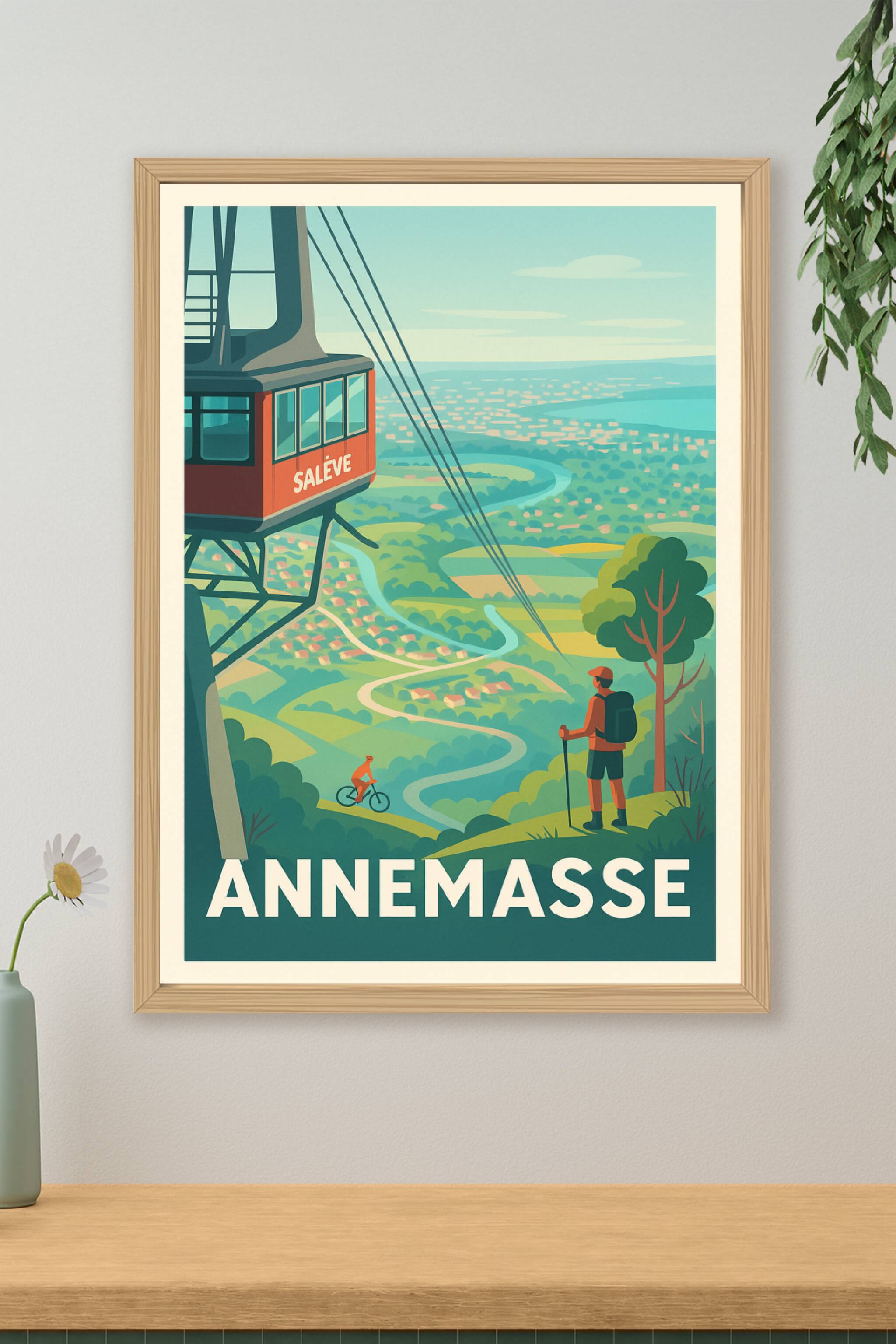 Découvrez la beauté d'Annemasse et ses alentours avec cette affiche illustrée mettant en scène le célèbre téléphérique du Salève et un paysage apai...