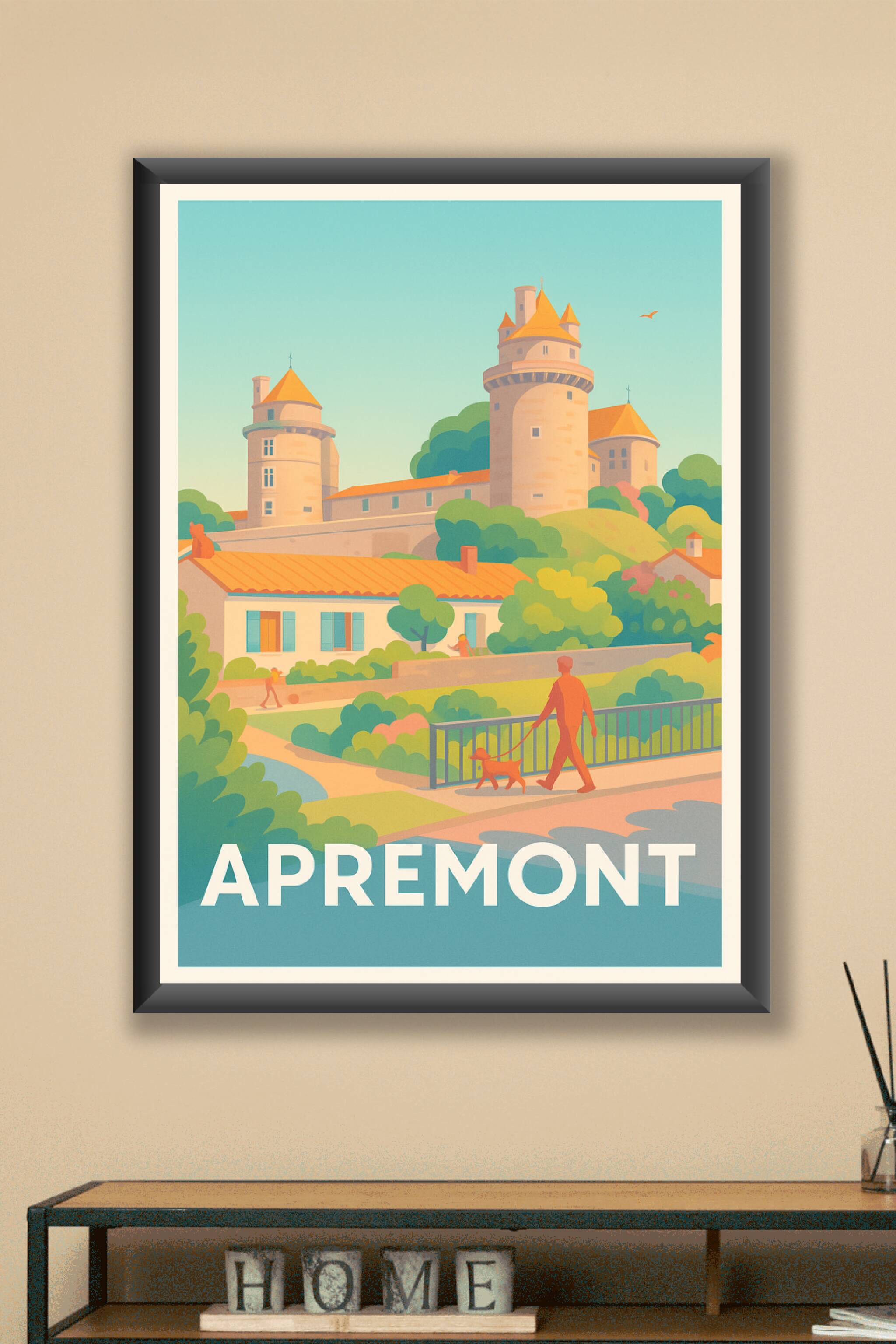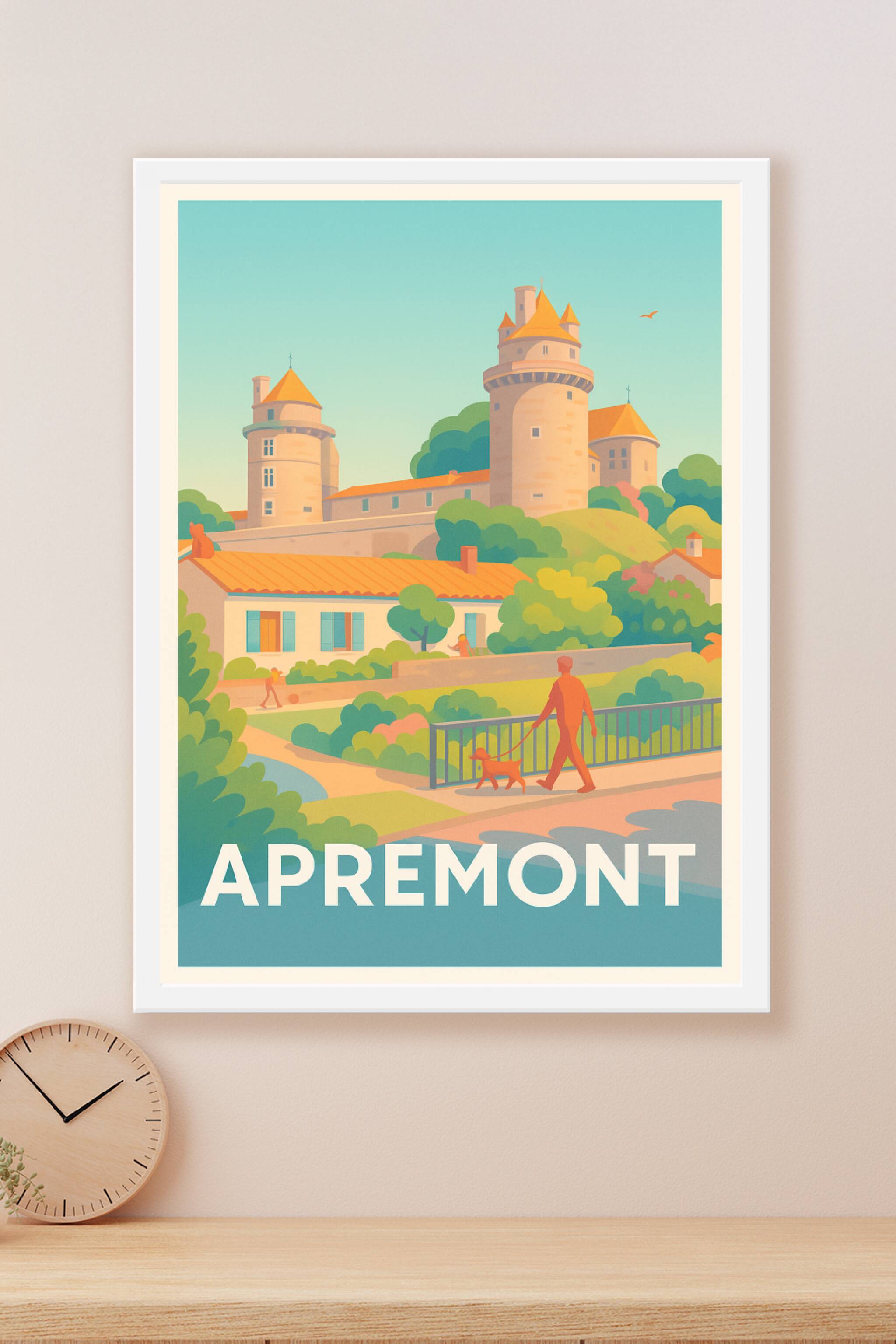 Découvrez l'élégance paisible d'Apremont avec cette affiche illustrée représentant ses célèbres tours médiévales et ses paysages verdoyants baignés...