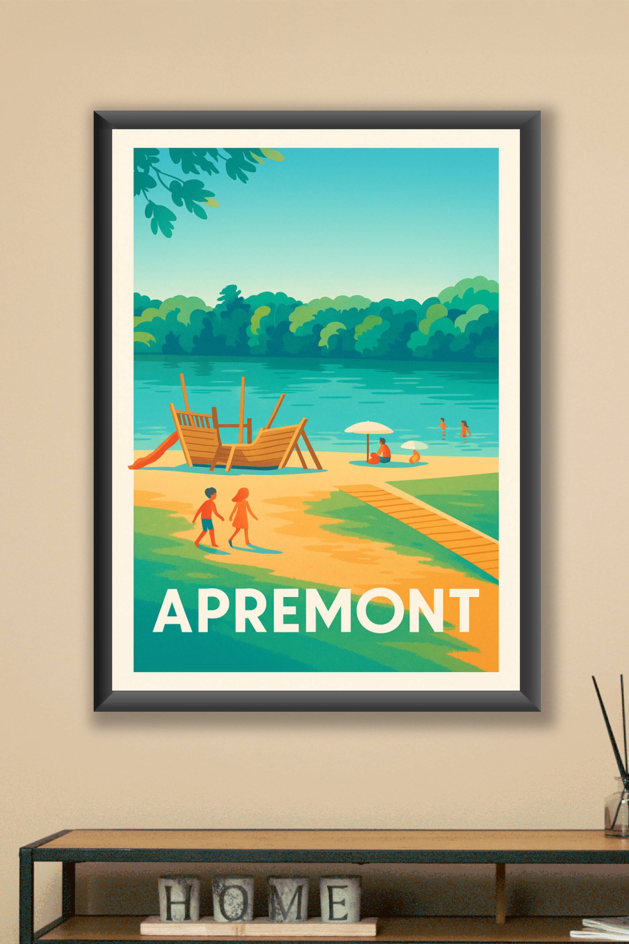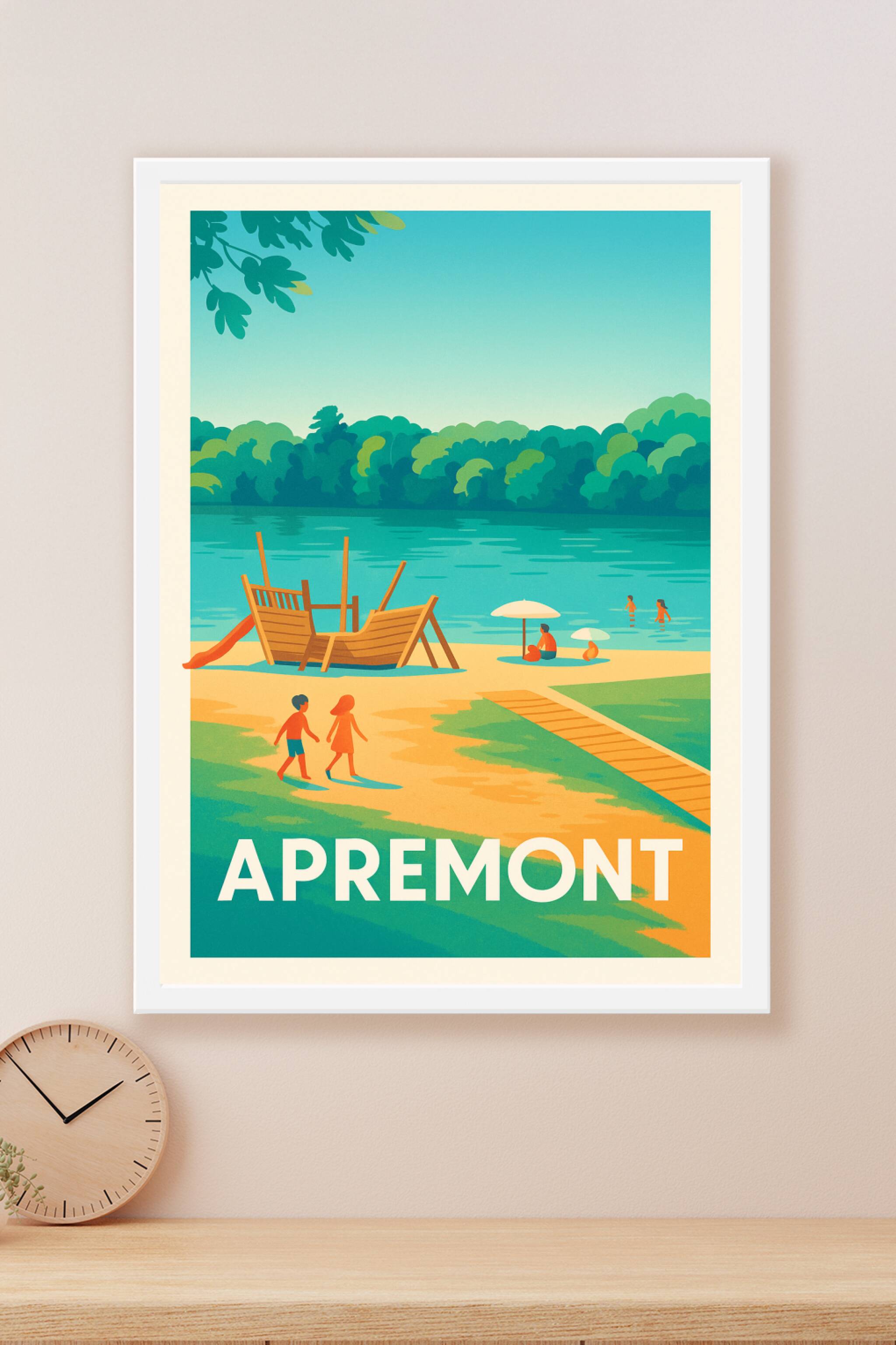 Découvrez l'atmosphère paisible et joyeuse d'Apremont avec cette affiche vintage représentant une journée ensoleillée au bord du lac, où petits et ...