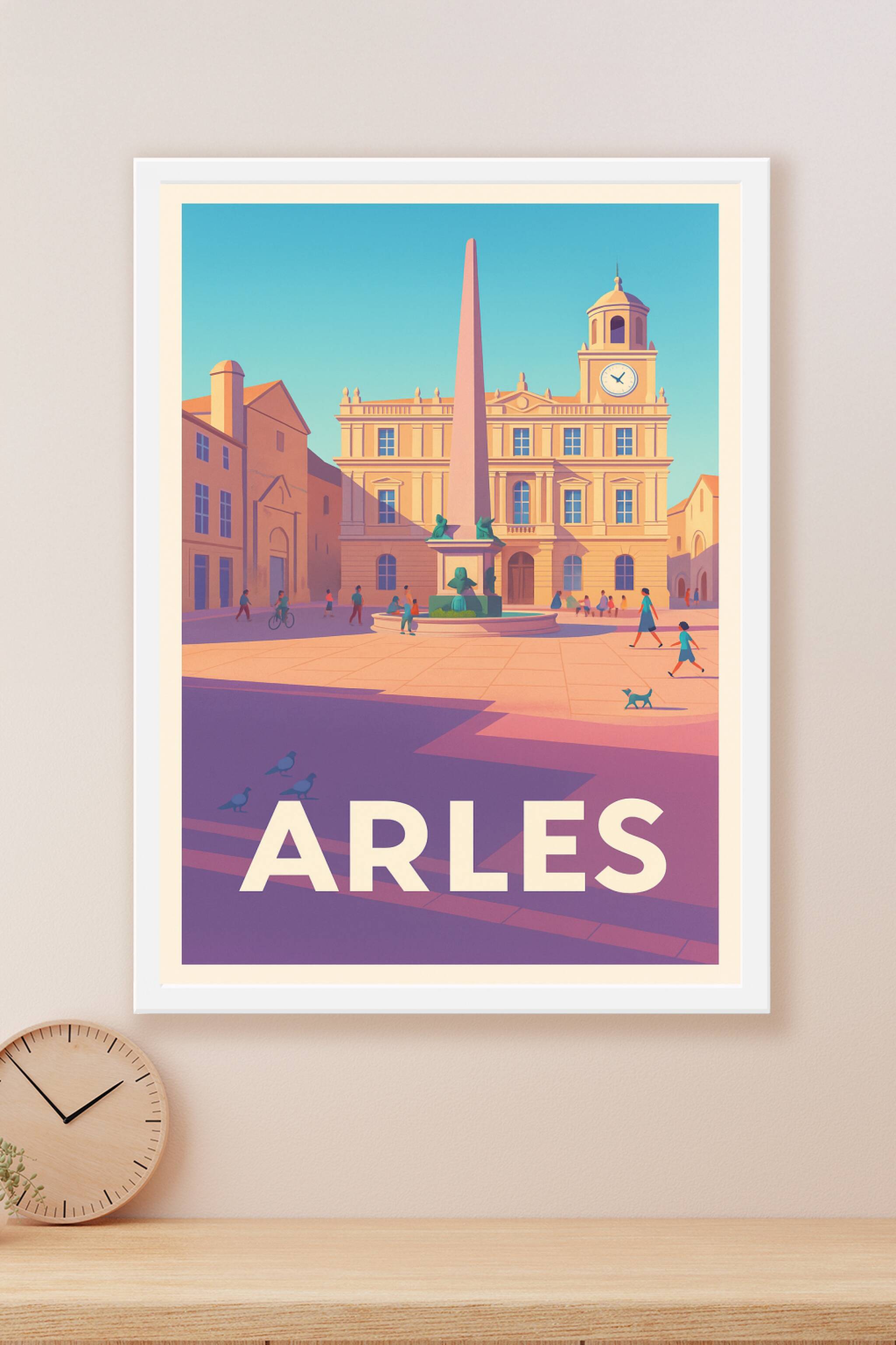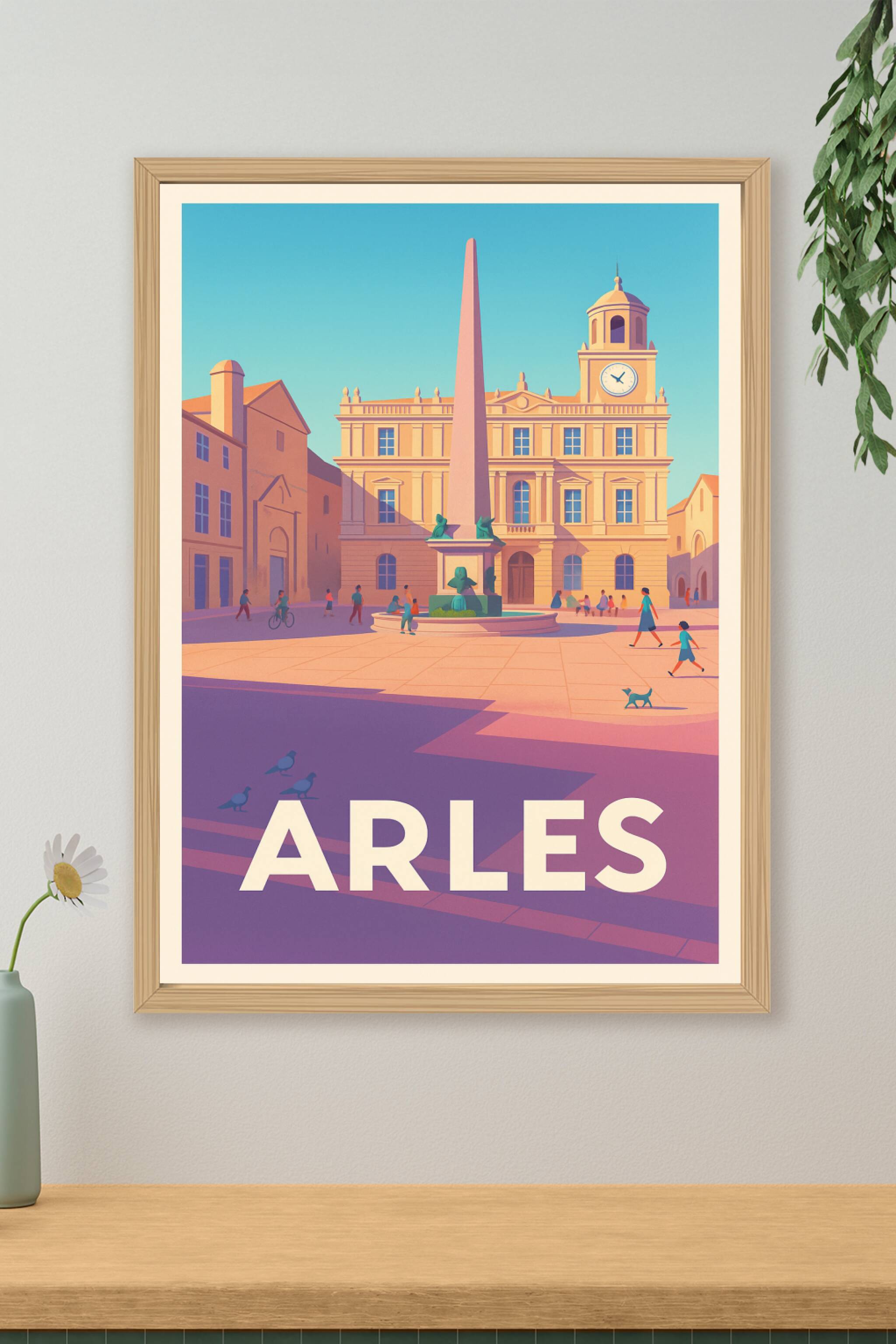 Découvrez l'élégance intemporelle d'Arles avec cette affiche illustrée mettant en scène la célèbre place de la République baignée par une lumière d...