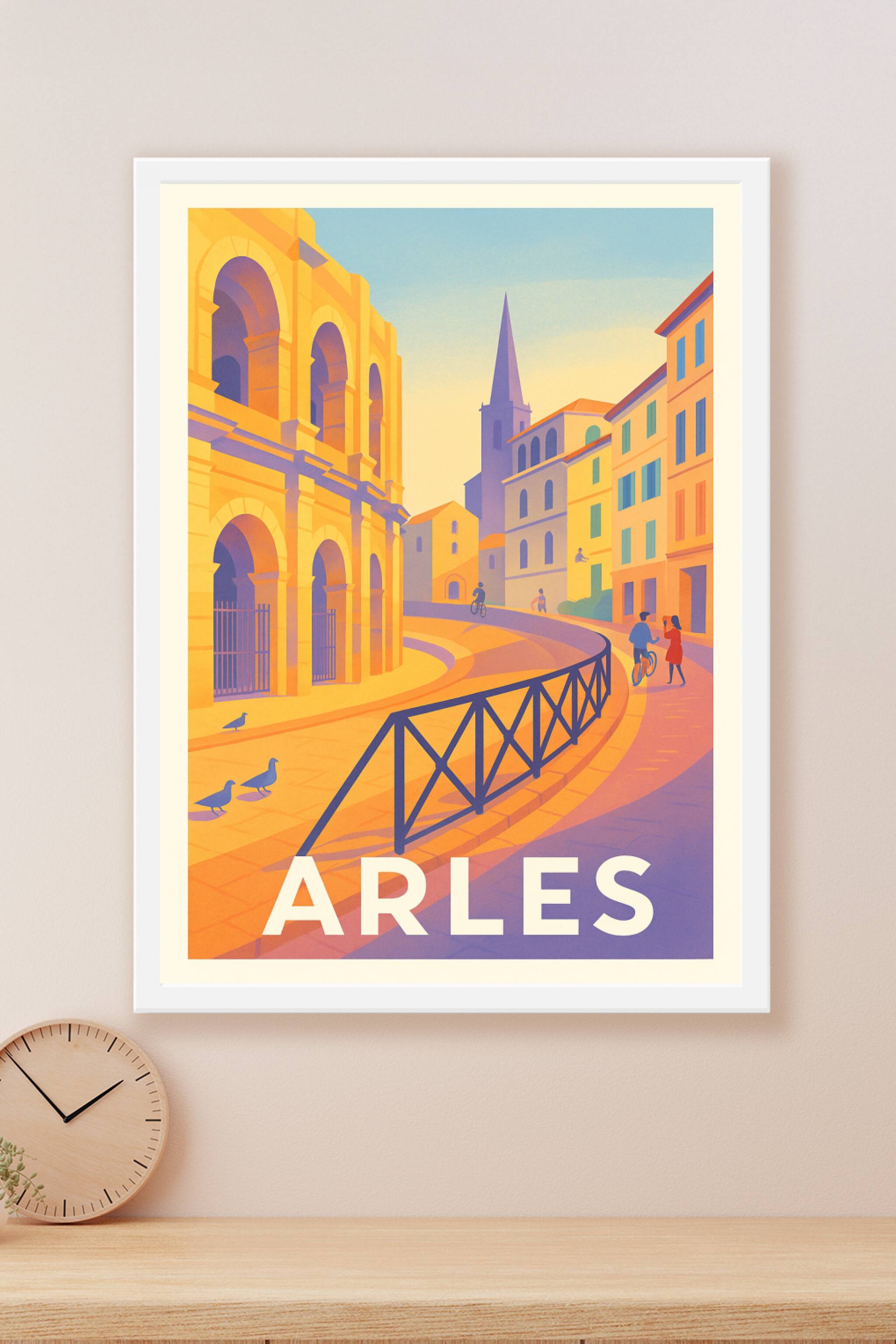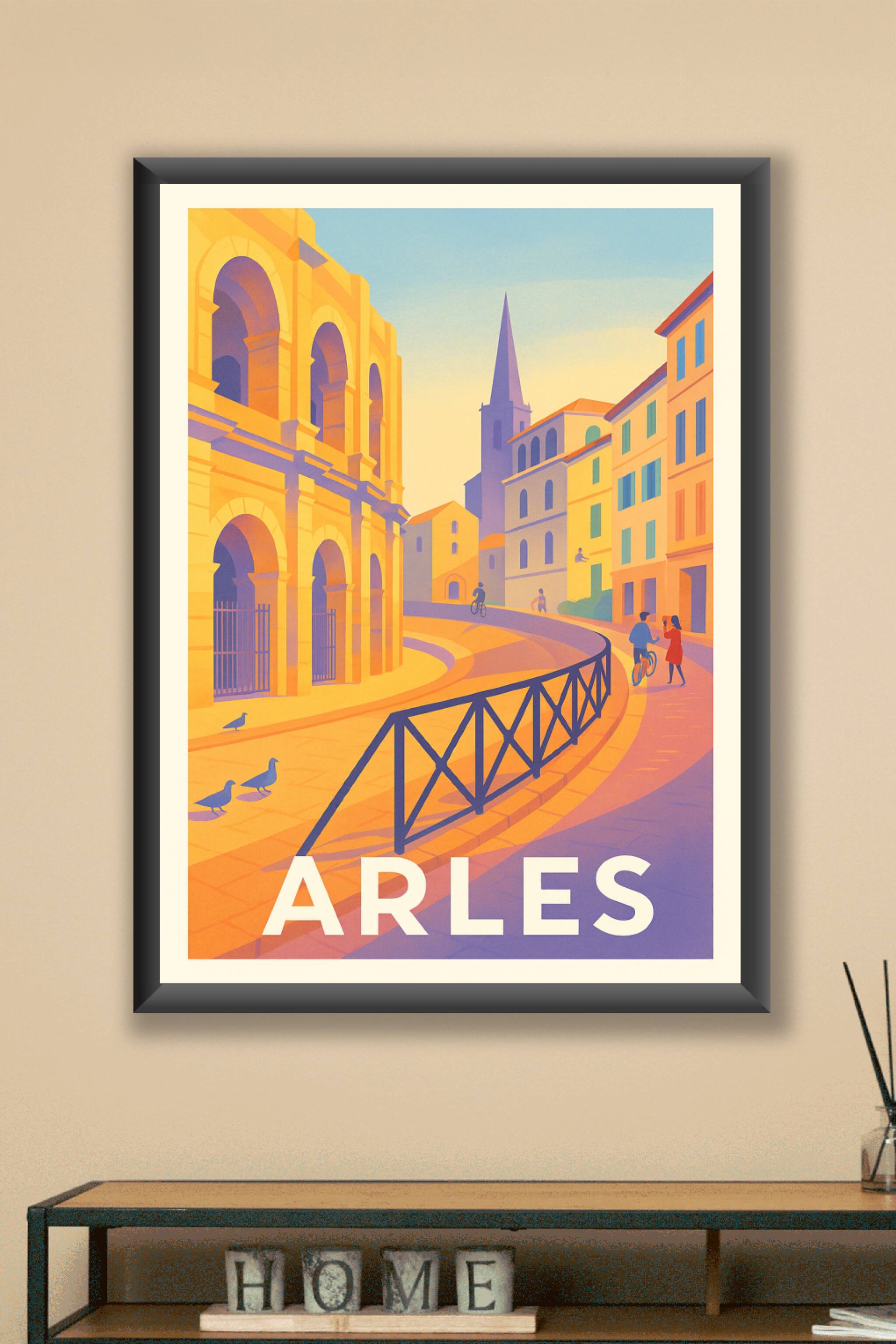 Découvrez la magie d'Arles avec cette affiche aux couleurs chaudes qui capture l'authenticité et le charme unique de ses ruelles bordées de bâtimen...