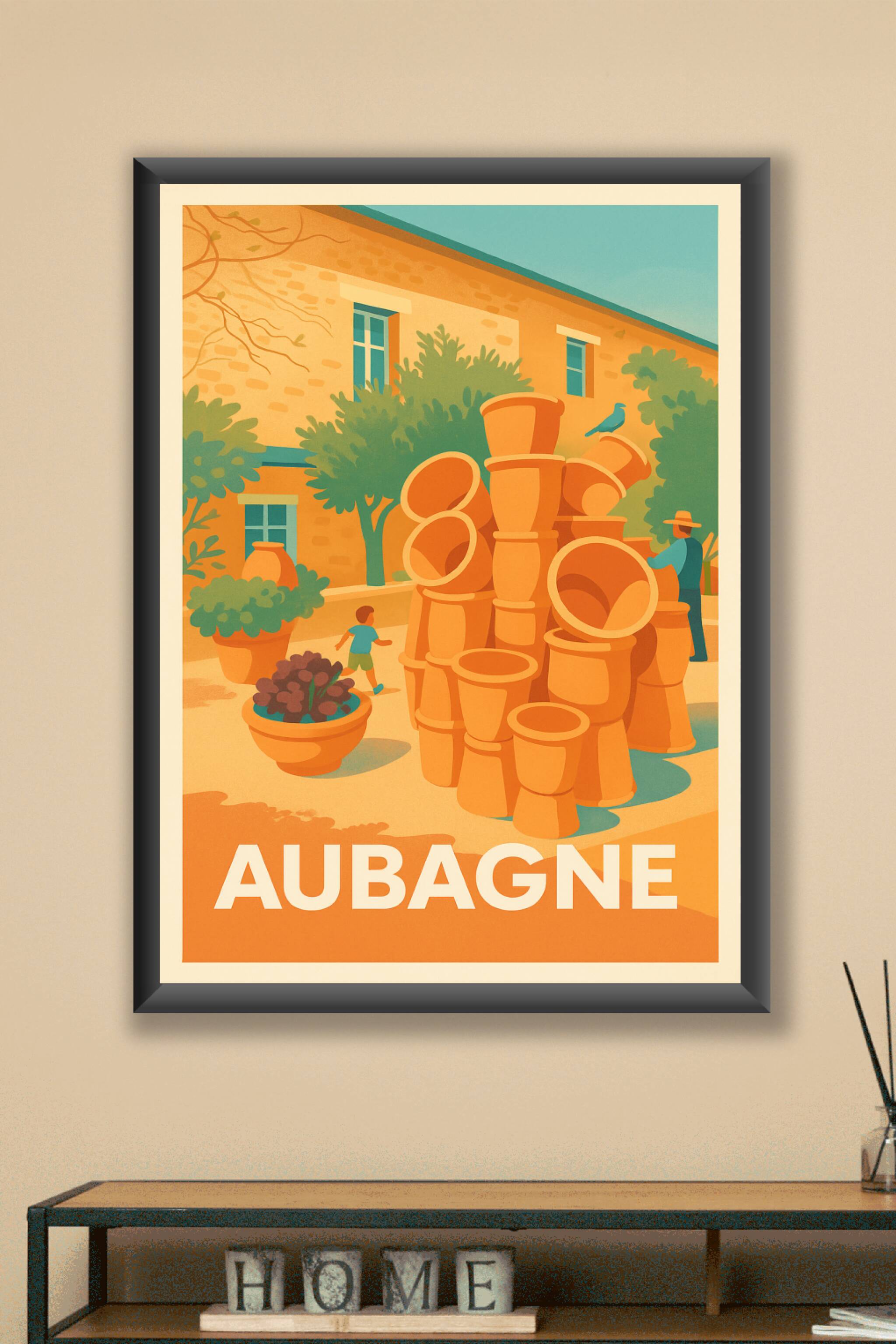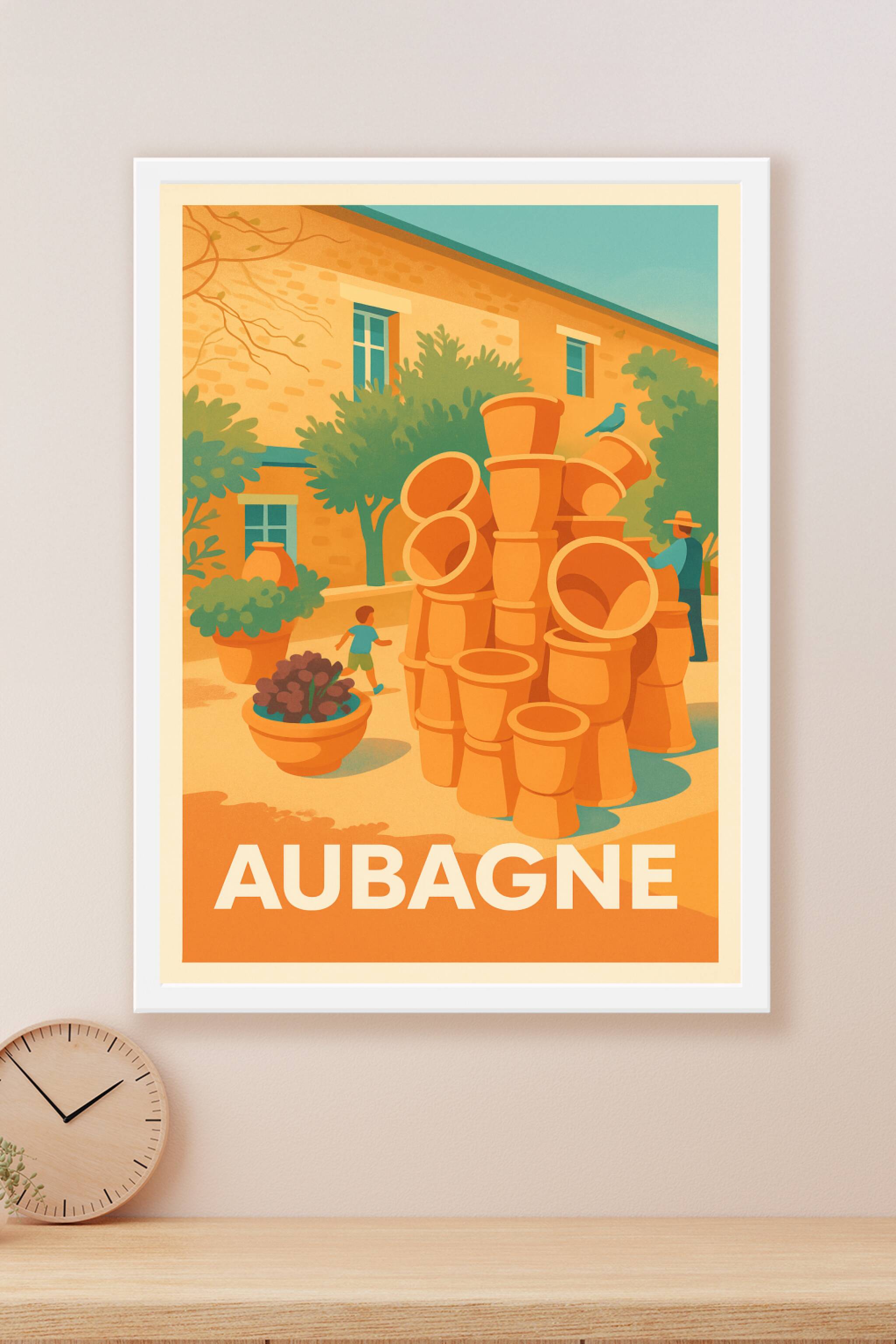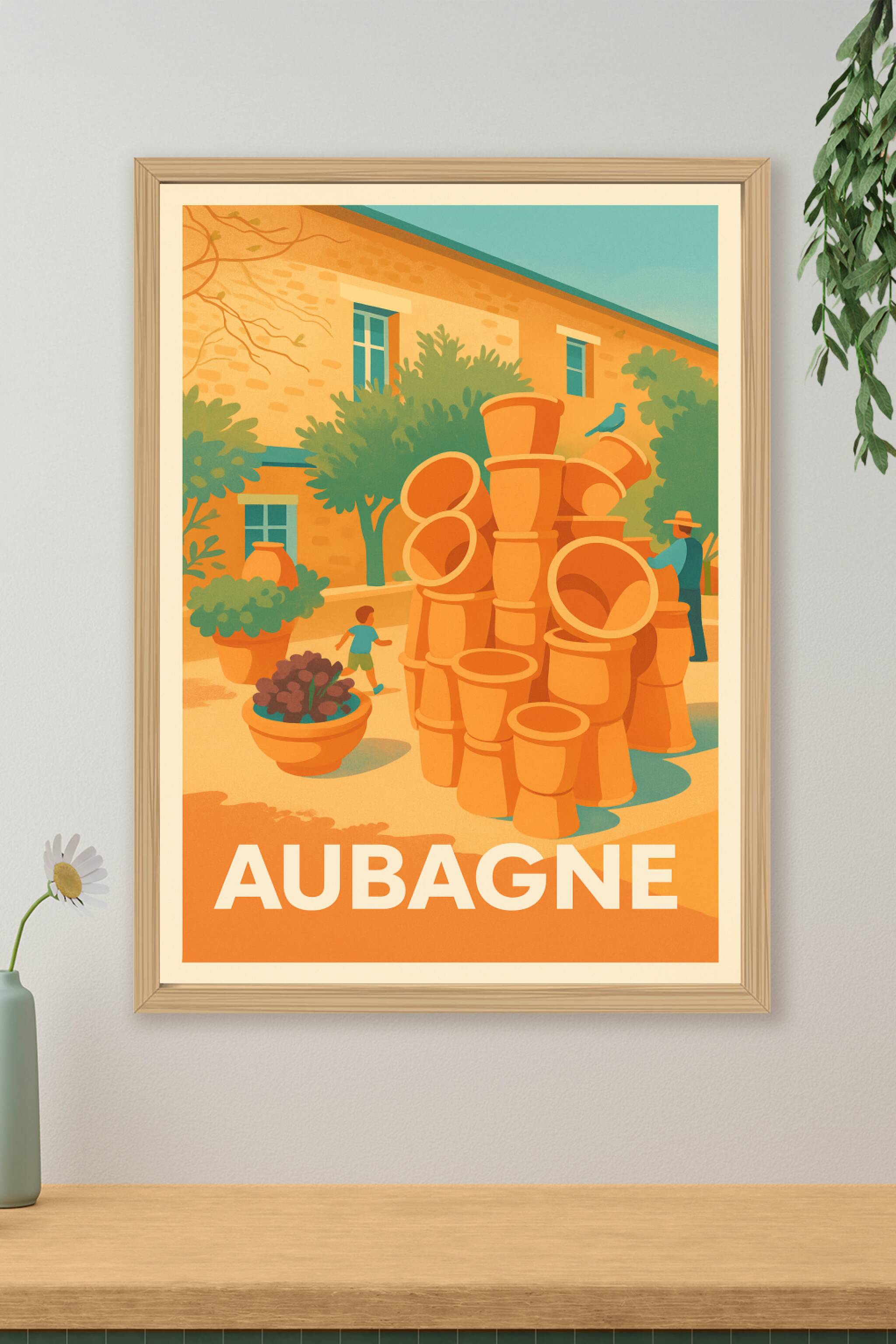 Redécouvrez le charme artisanal du sud avec ce poster illustré d’Aubagne, ville emblématique du savoir-faire céramique. Cette affiche néo-rétro met...