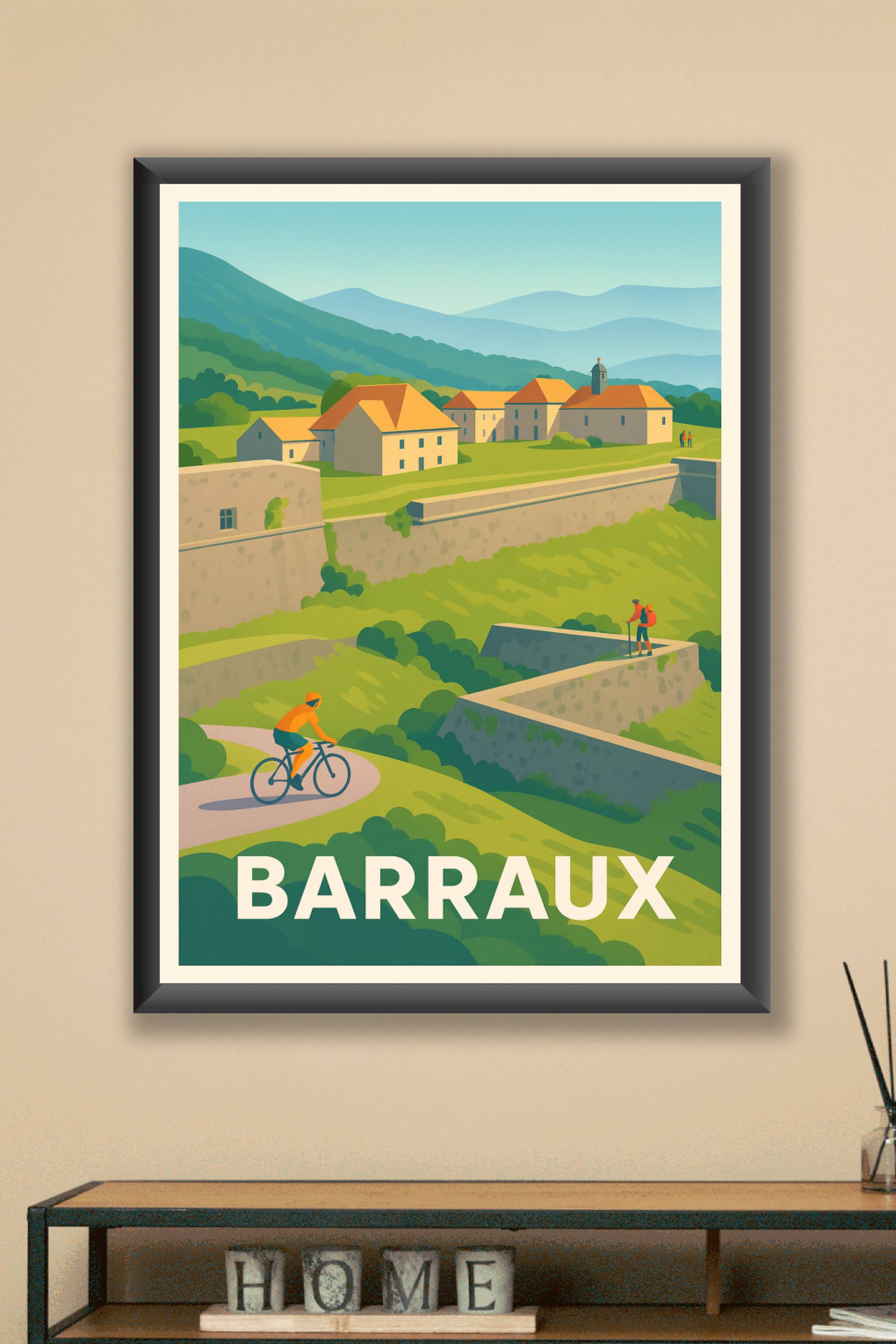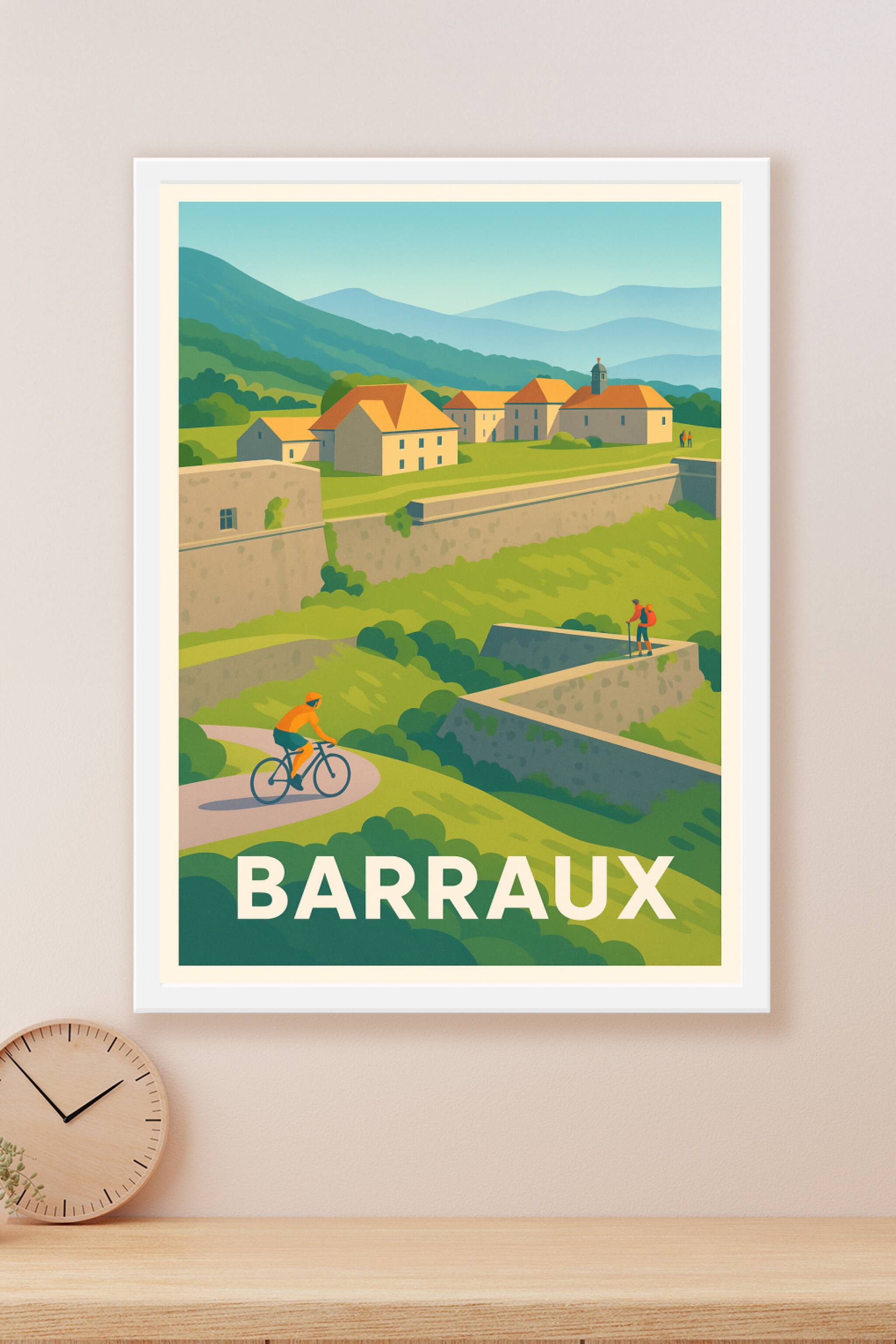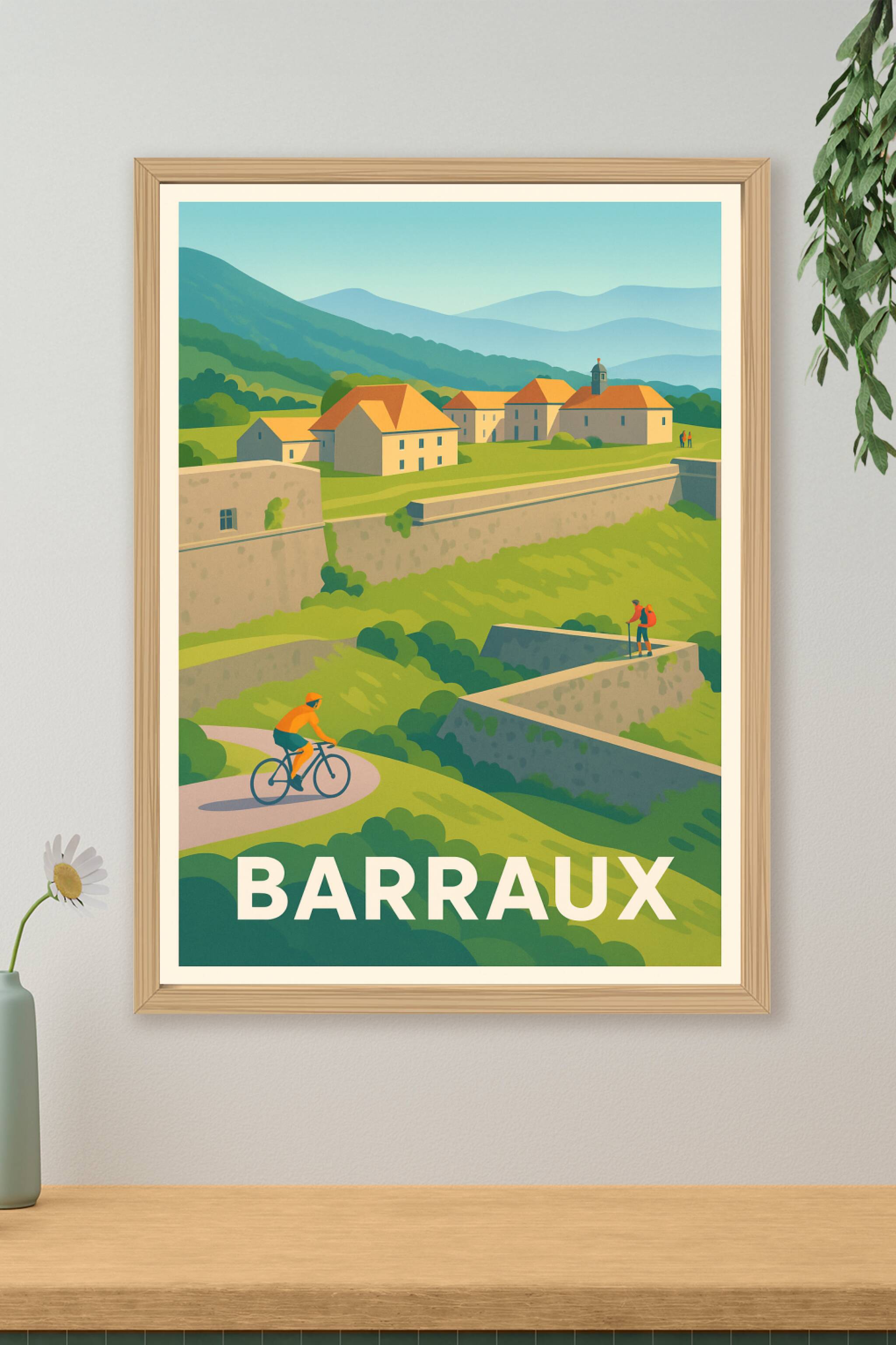 Découvrez la sérénité champêtre de Barraux avec cette affiche au style illustré doux et lumineux. Cette poster met en scène les remparts historique...