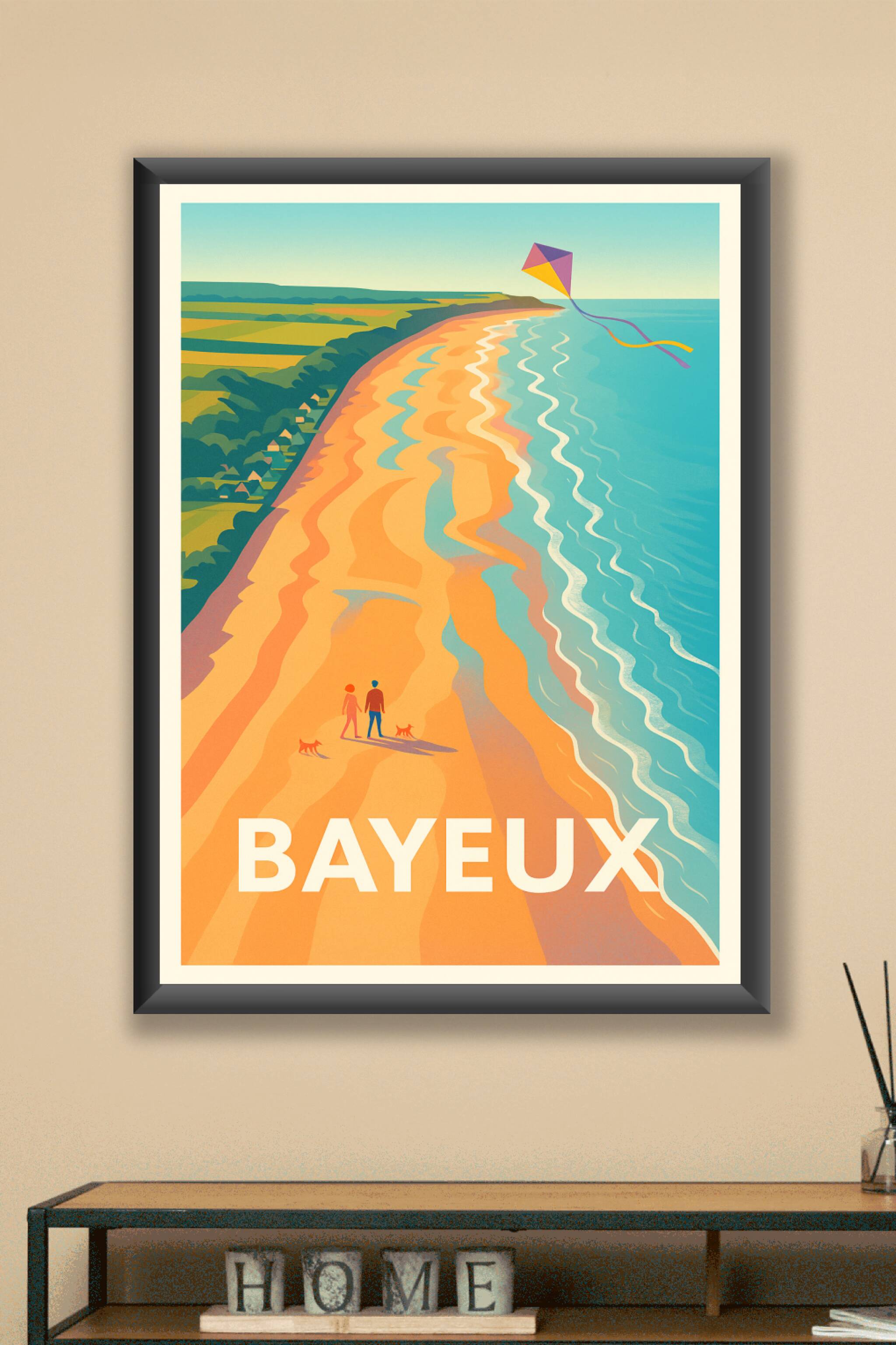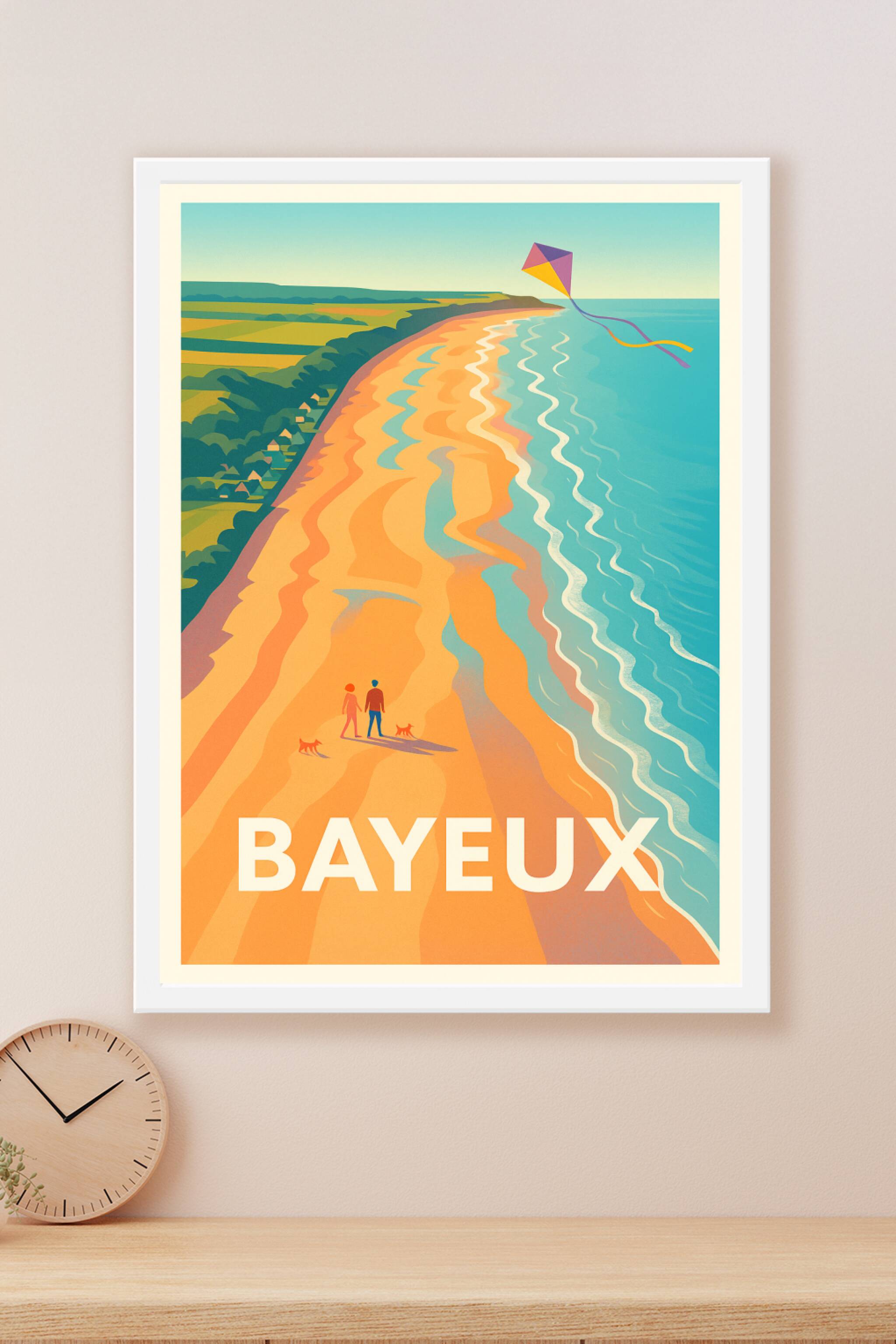 Apportez une touche de sérénité et d'air marin à votre intérieur avec cette affiche illustrée représentant la plage de Bayeux, célèbre pour ses vas...