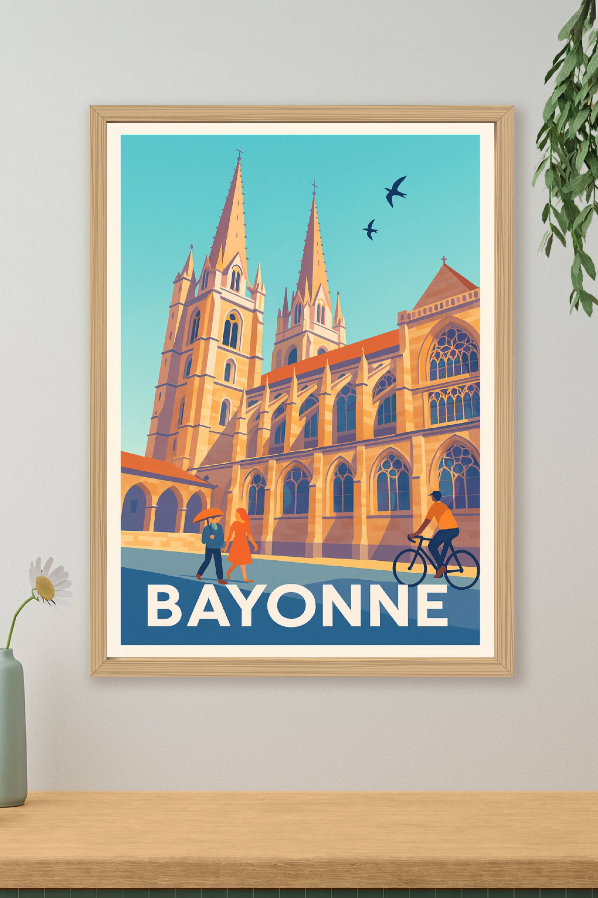 Découvrez toute la splendeur architecturale de Bayonne à travers ce poster illustré mettant en scène sa célèbre cathédrale Sainte-Marie, icône maje...