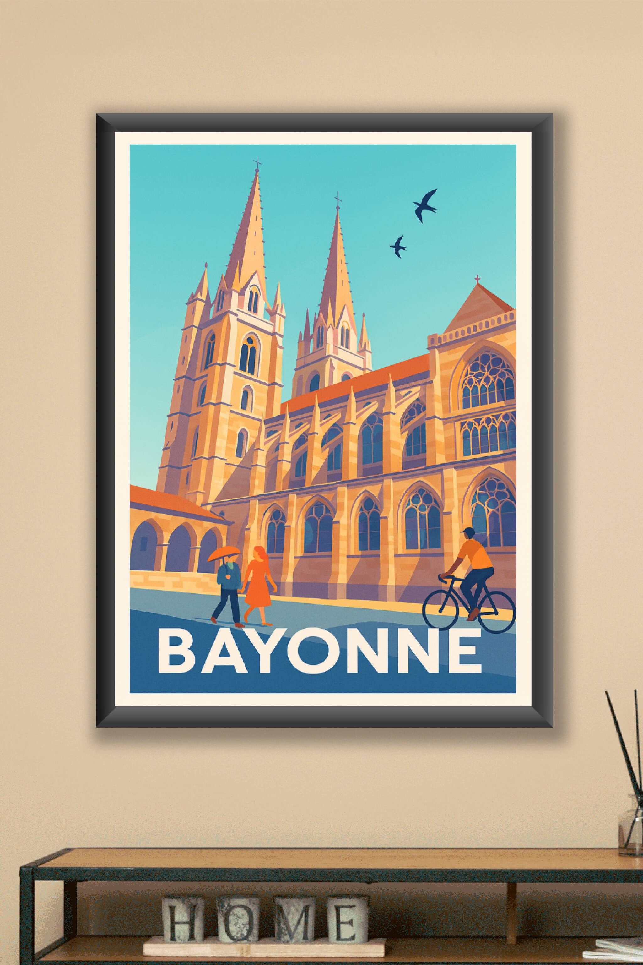 Découvrez toute la splendeur architecturale de Bayonne à travers ce poster illustré mettant en scène sa célèbre cathédrale Sainte-Marie, icône majestueuse de la ville. Entre ses flèches élancées et ses arches gothiques baignées de lumière, cette affiche au style néo-rétro capture l’atmosphère unique du Pays basque. Imprimée en tirage Fine Art sur papier 305g en coton pour une qualité supérieure et des couleurs éclatantes, chaque affiche est une pièce d’exception. Disponible en formats A1 à A4, avec ou sans cadre, ce poster de Bayonne est idéal pour sublimer votre intérieur ou offrir un souvenir authentique à un amoureux du Sud-Ouest. Fabrication française 100% premium.