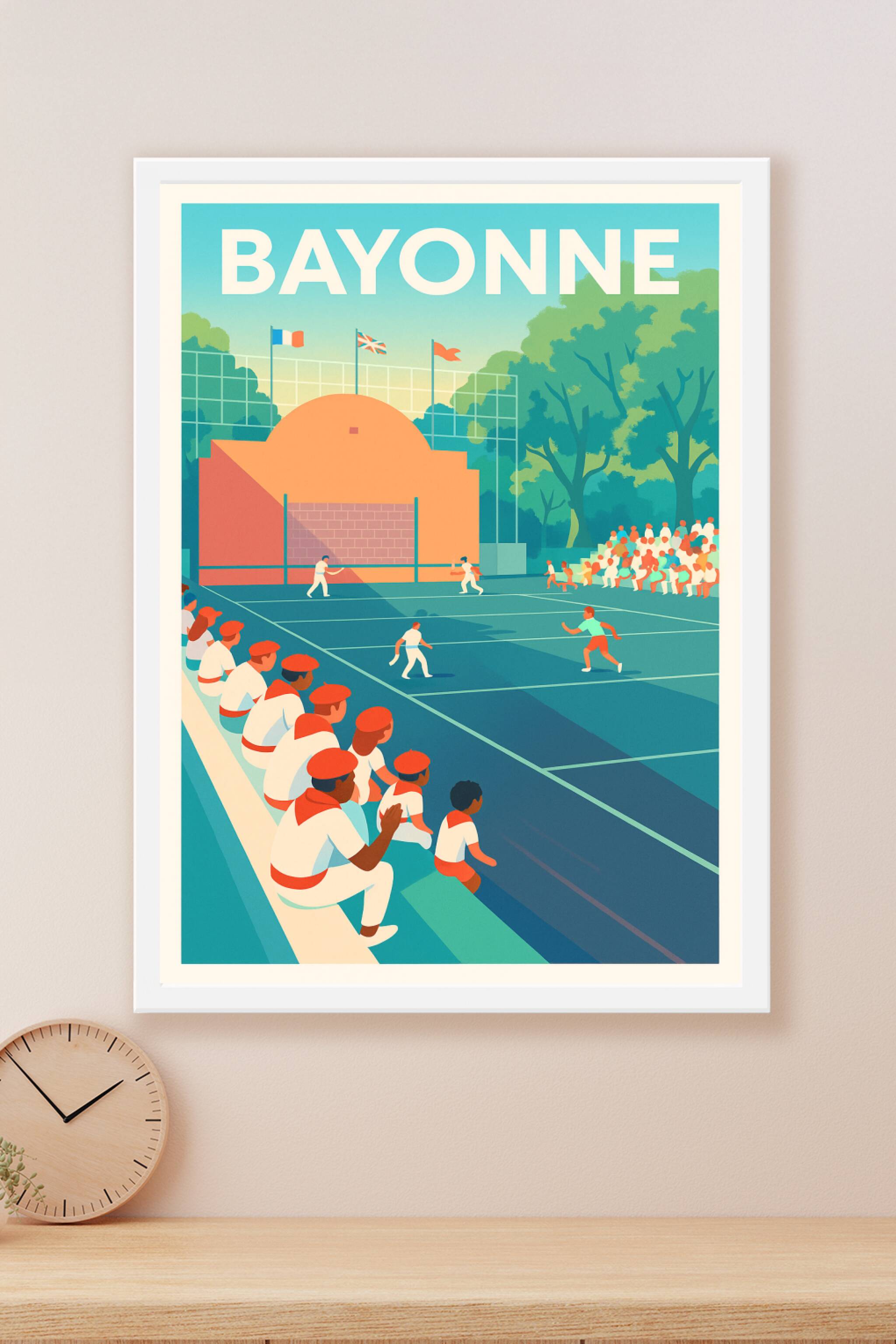 Revivez l'intensité des parties de pelote basque avec ce poster illustré vibrant aux couleurs estivales. L'affiche met en scène une scène typique de la culture bayonnaise : des spectateurs en rouge et blanc, un fronton emblématique, des joueurs en pleine action, le tout baigné dans une atmosphère chaleureuse et festive.Cette affiche est imprimée en tirage "Fine Art" sur papier 305g coton, garantissant une qualité exceptionnelle et des détails saisissants. Disponible en formats A1 à A4, avec ou sans cadre, ce poster s’intègre parfaitement à tout type de décoration. Apportez une touche authentique du Pays basque à votre intérieur ou offrez un souvenir unique aux passionnés de traditions régionales.