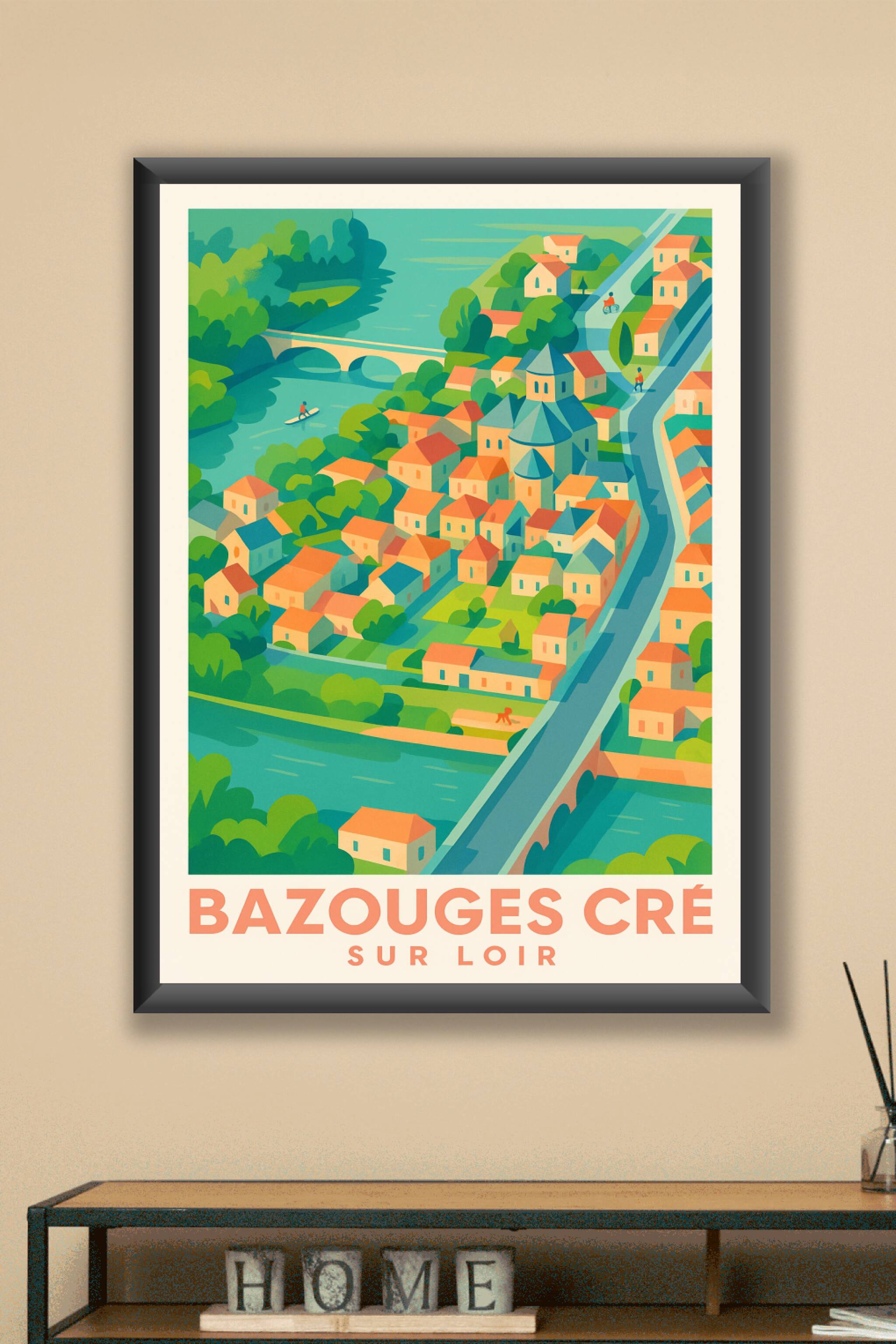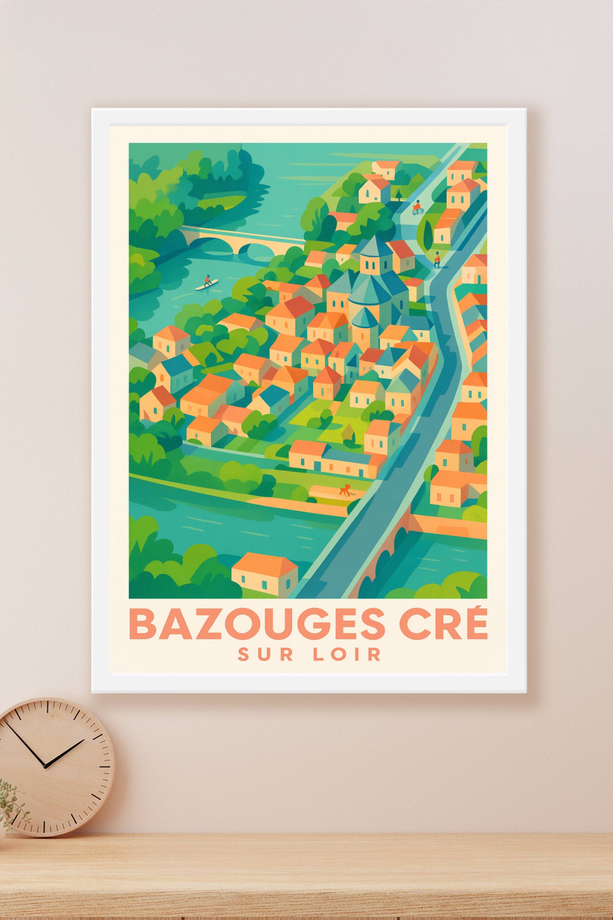 Découvrez l'élégante douceur de vivre de Bazouges Cré-sur-Loir à travers cette affiche artistique qui met en avant ses toits colorés, son pont pitt...
