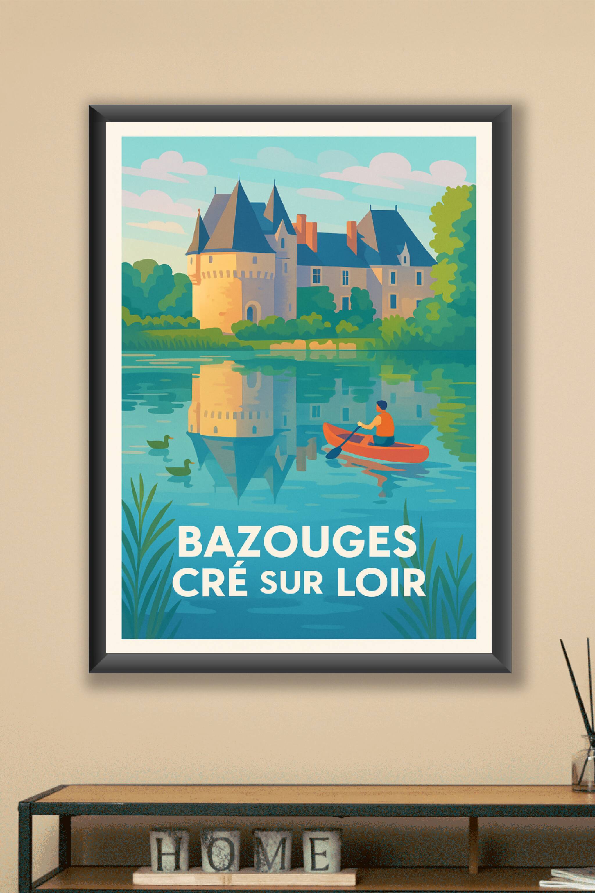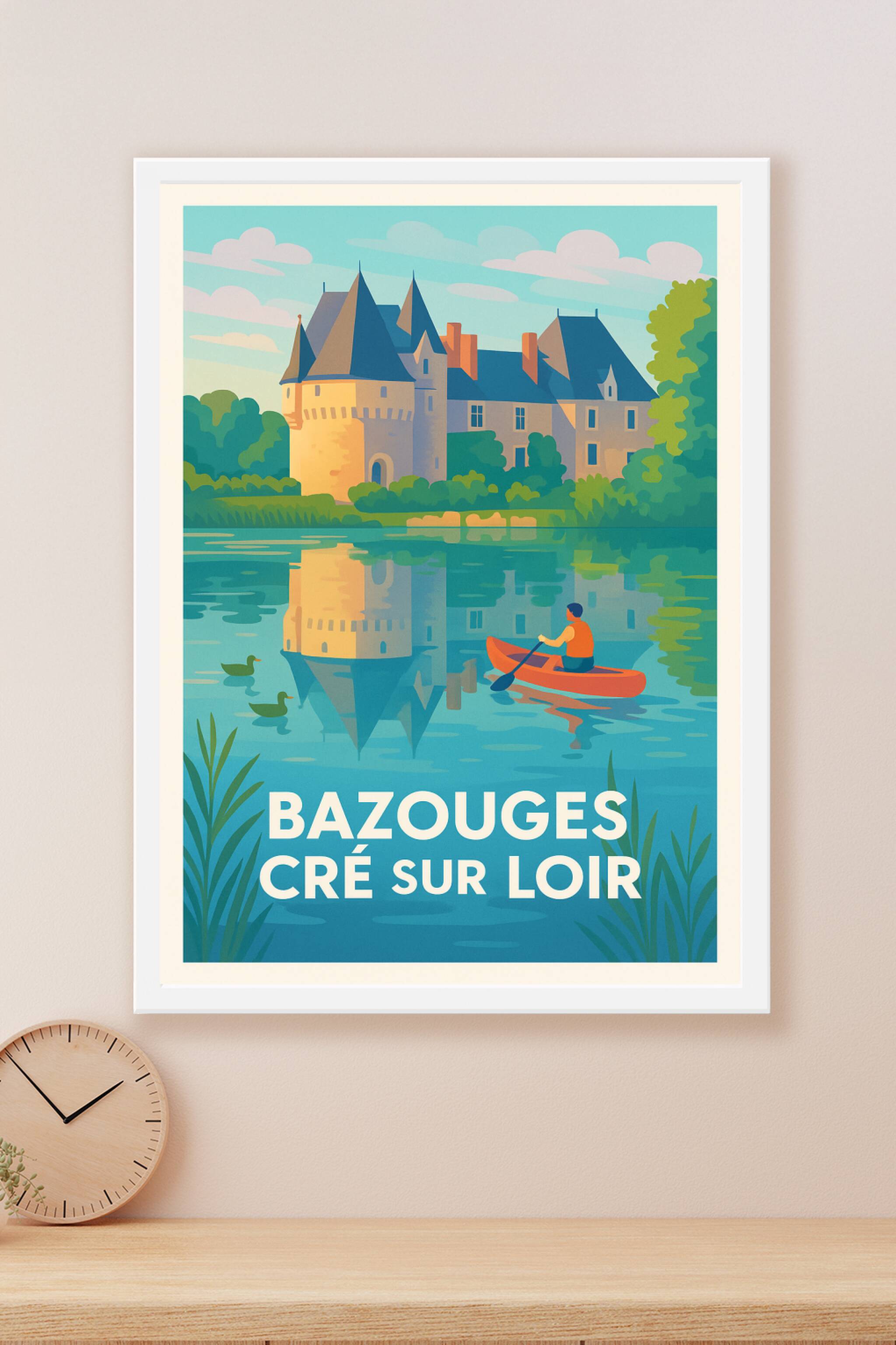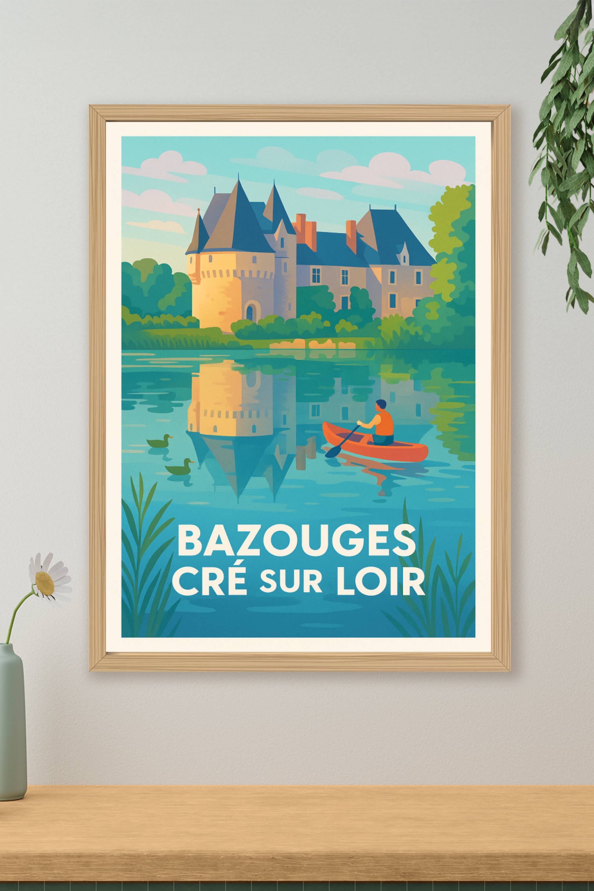 Découvrez l'atmosphère sereine et pittoresque de Bazouges Cré sur Loir avec cette affiche illustrée aux couleurs douces et apaisantes. Ce poster ca...