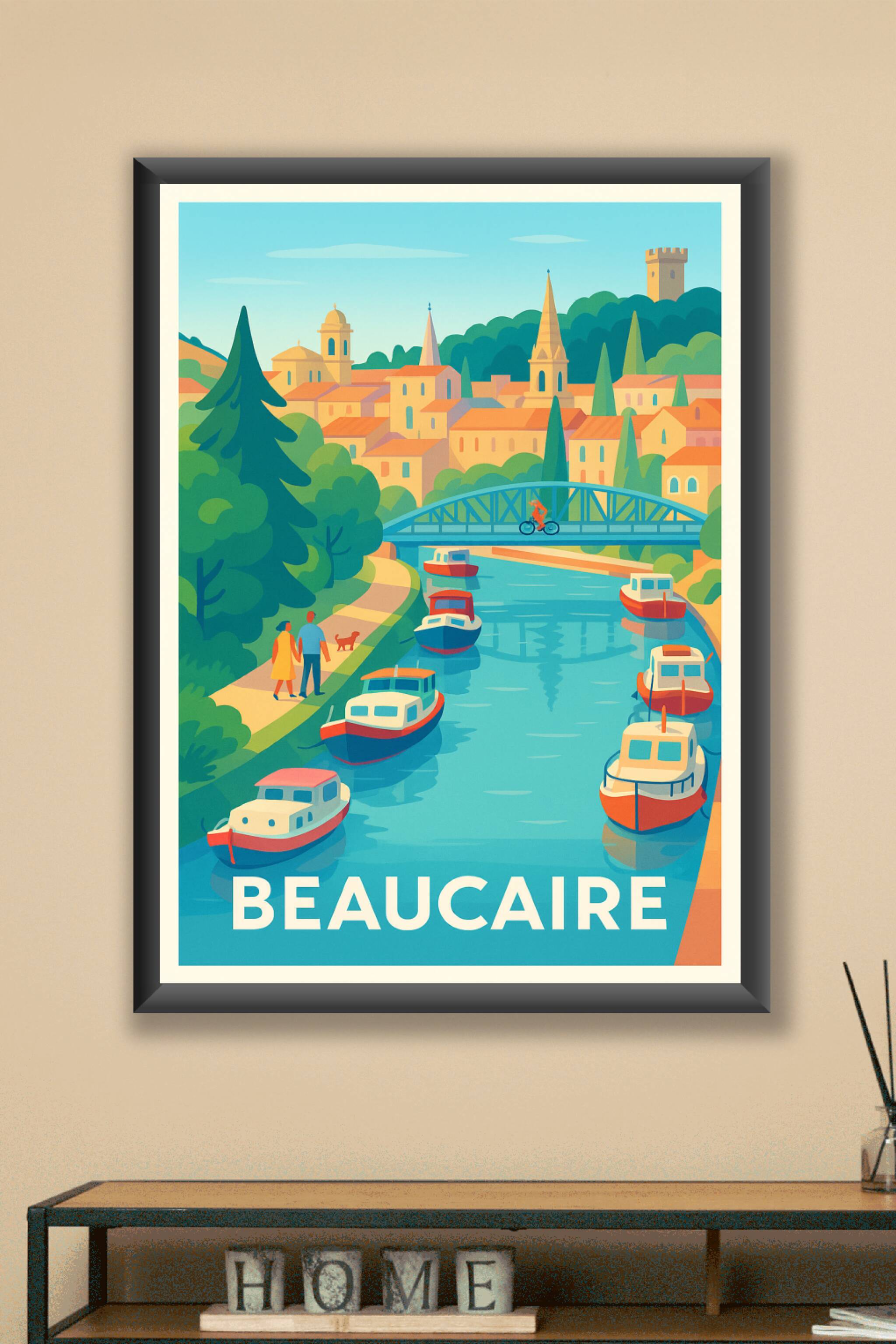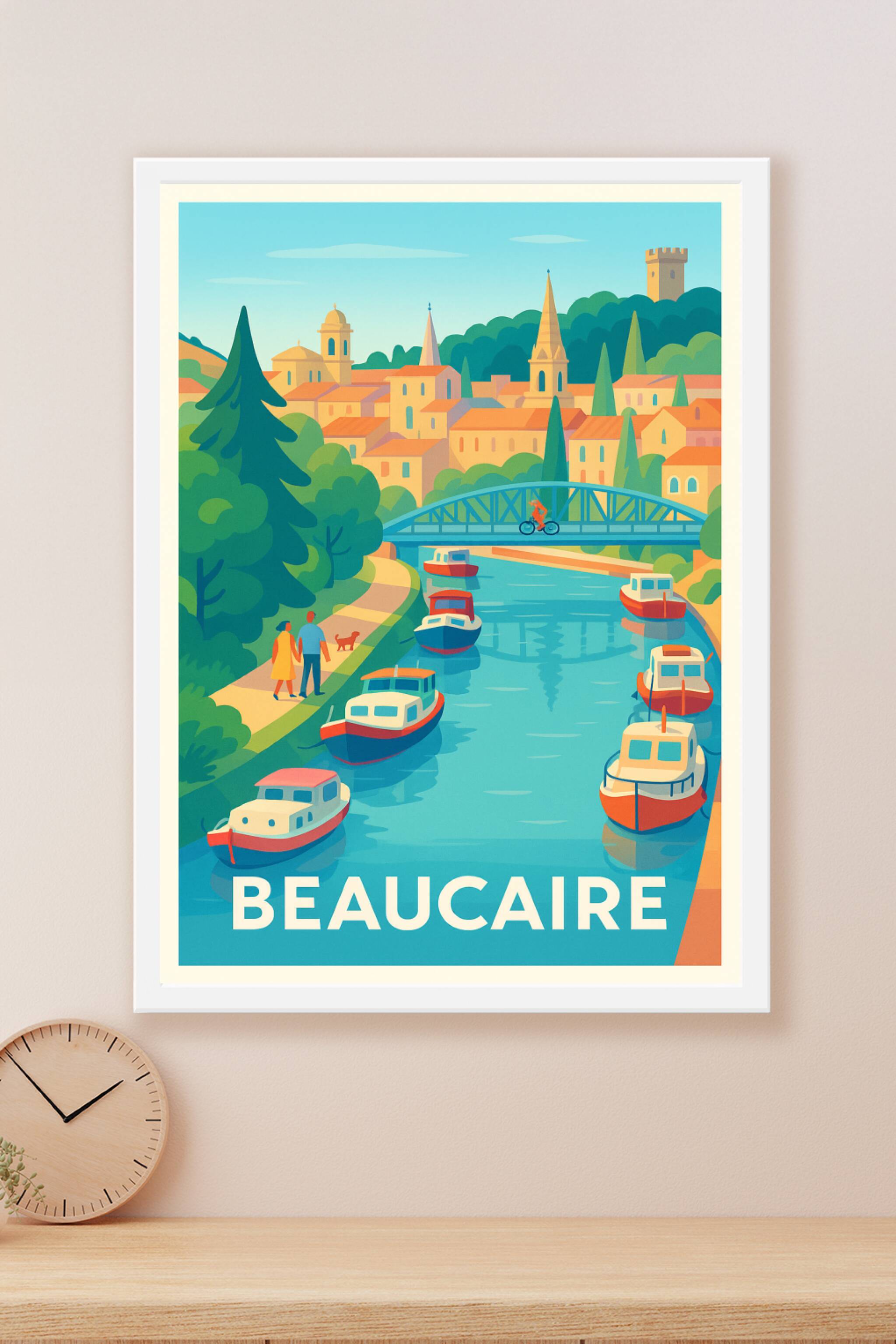 Découvrez la douceur de vivre de Beaucaire avec cette affiche illustrée qui met en scène le canal bordé de bateaux typiques et les monuments emblém...