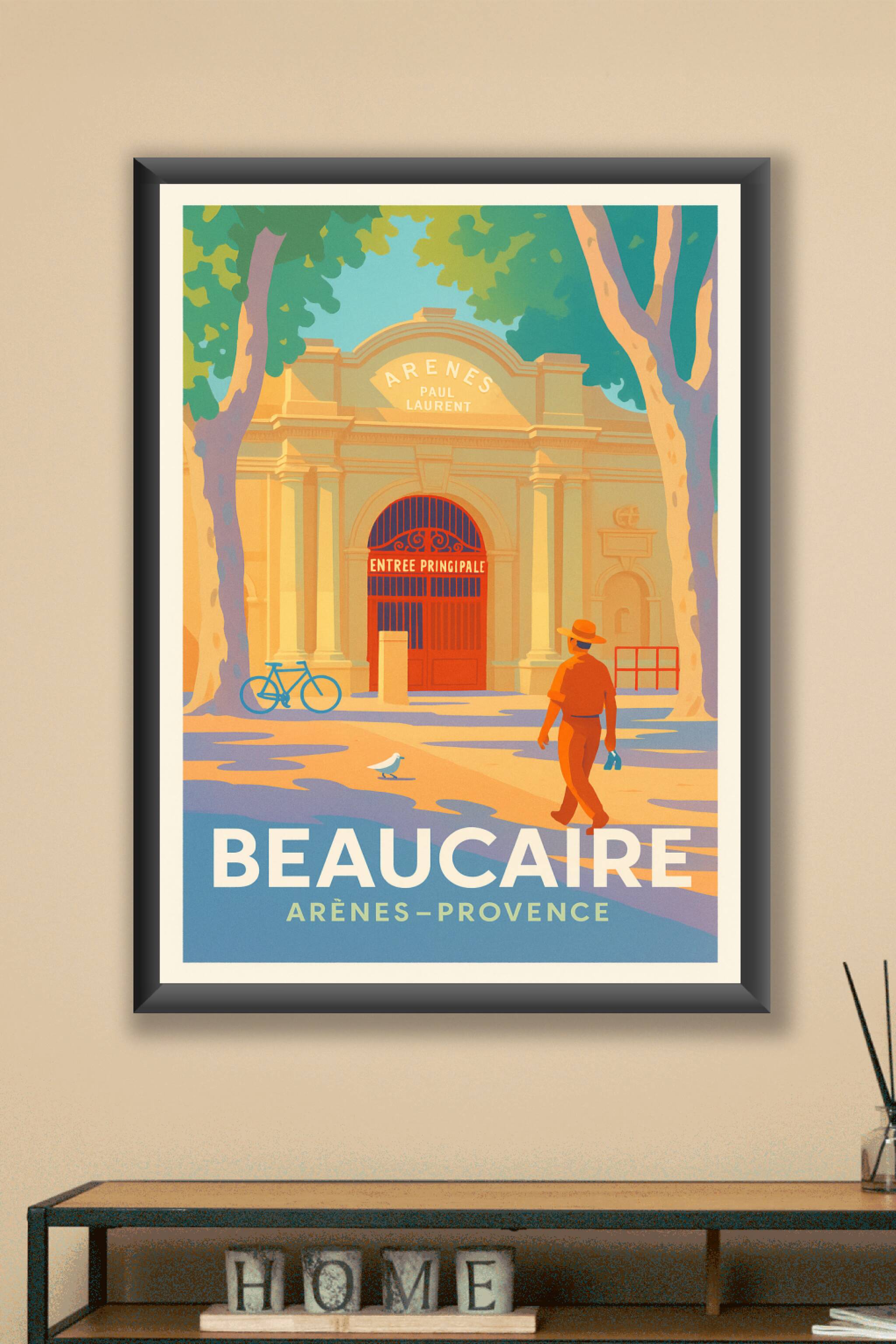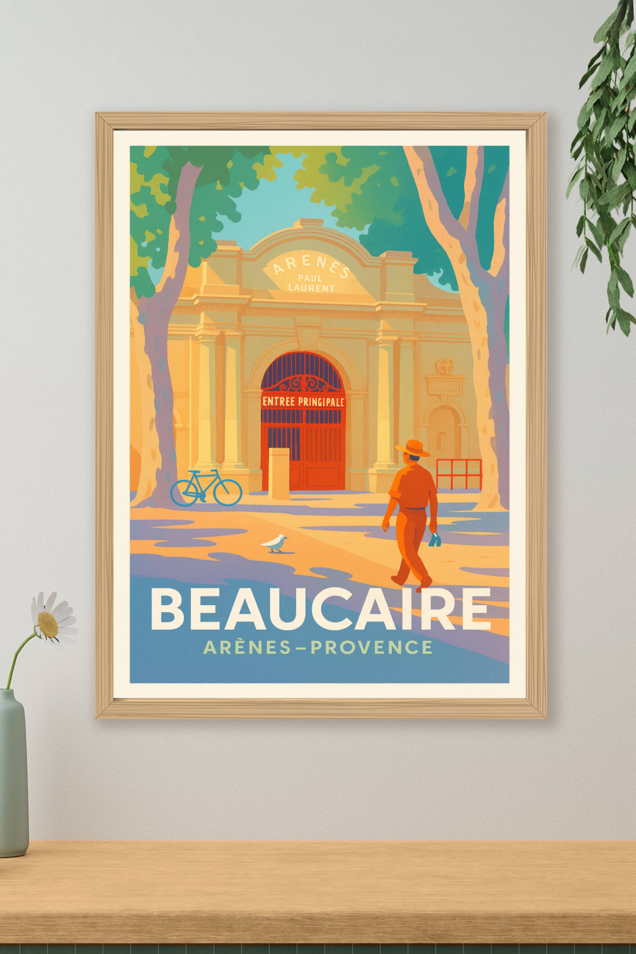 Découvrez la douceur de vivre de Beaucaire à travers cette sublime affiche mettant en scène les emblématiques Arènes Paul Laurent sous un soleil pr...