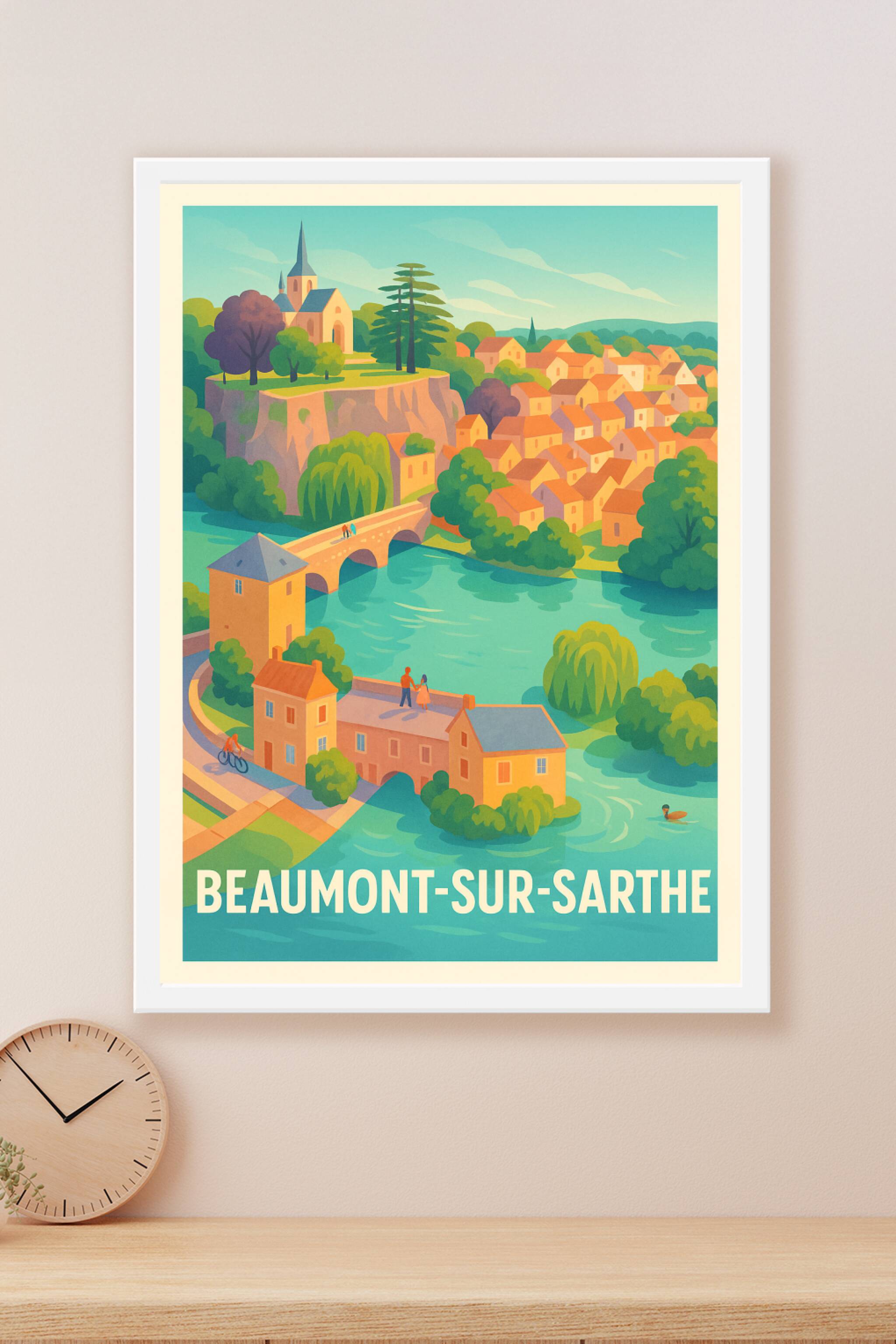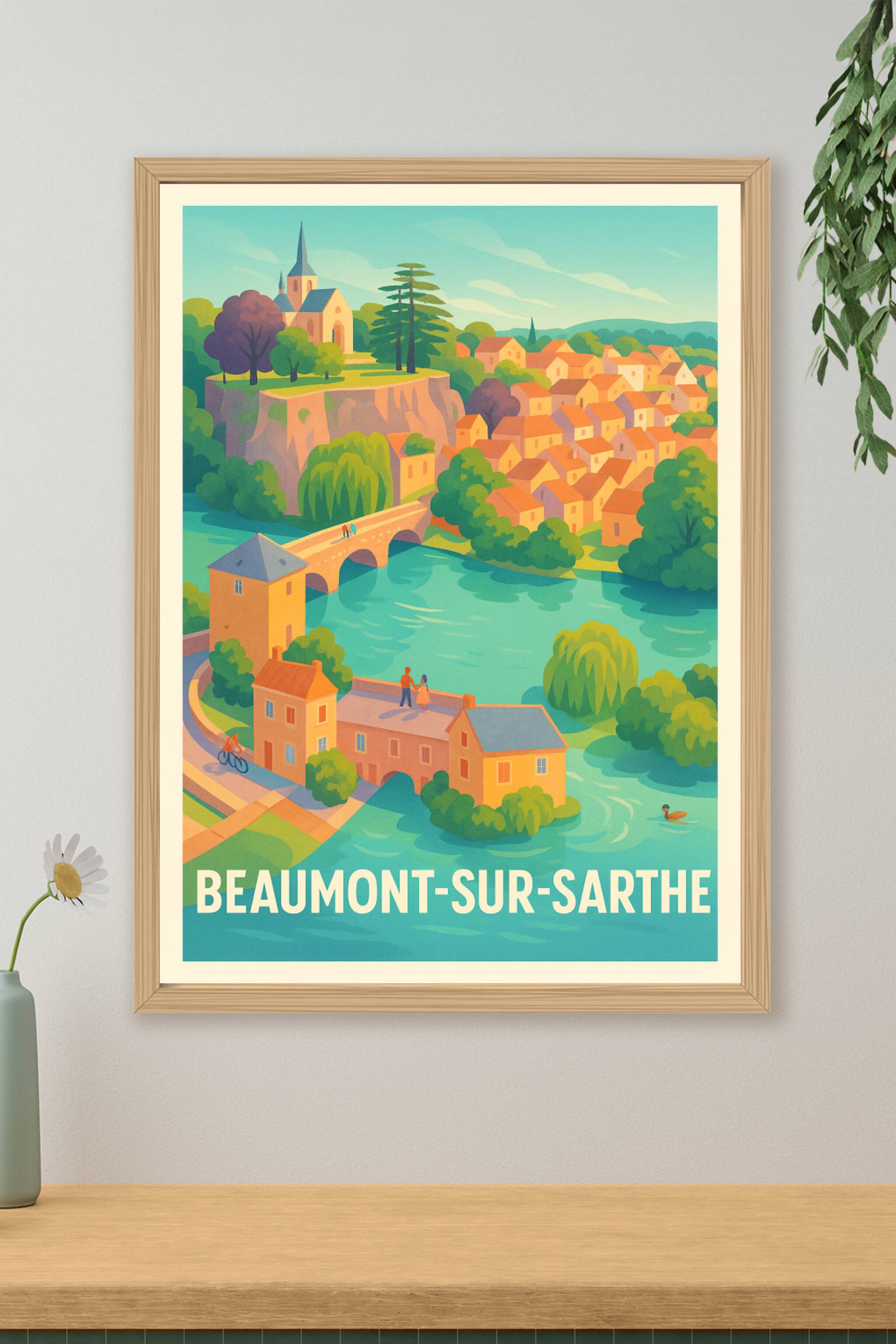 Découvrez l'élégance paisible de Beaumont-sur-Sarthe avec cette affiche aux teintes douces et lumineuses qui capturent l'essence d'un village pitto...