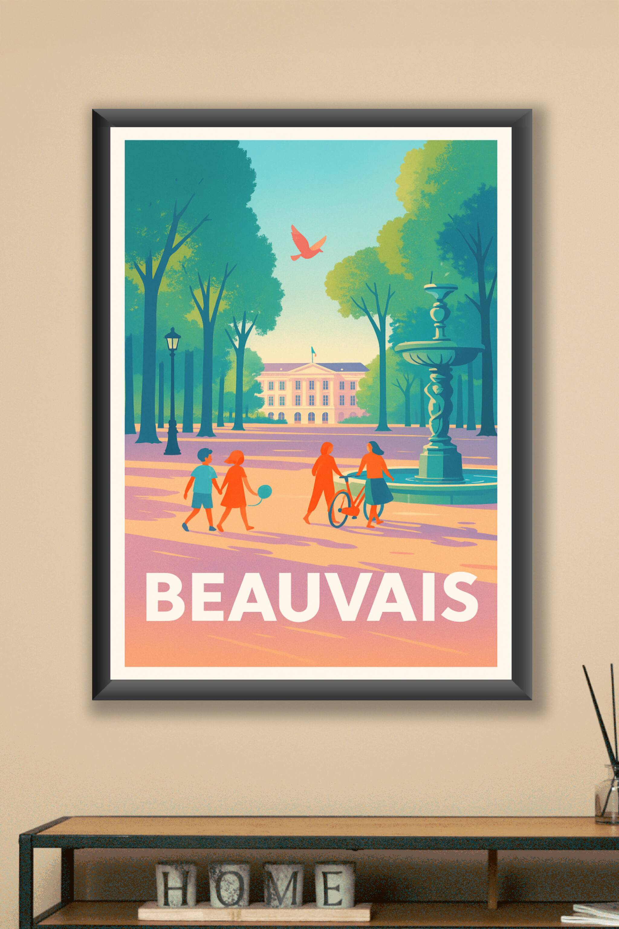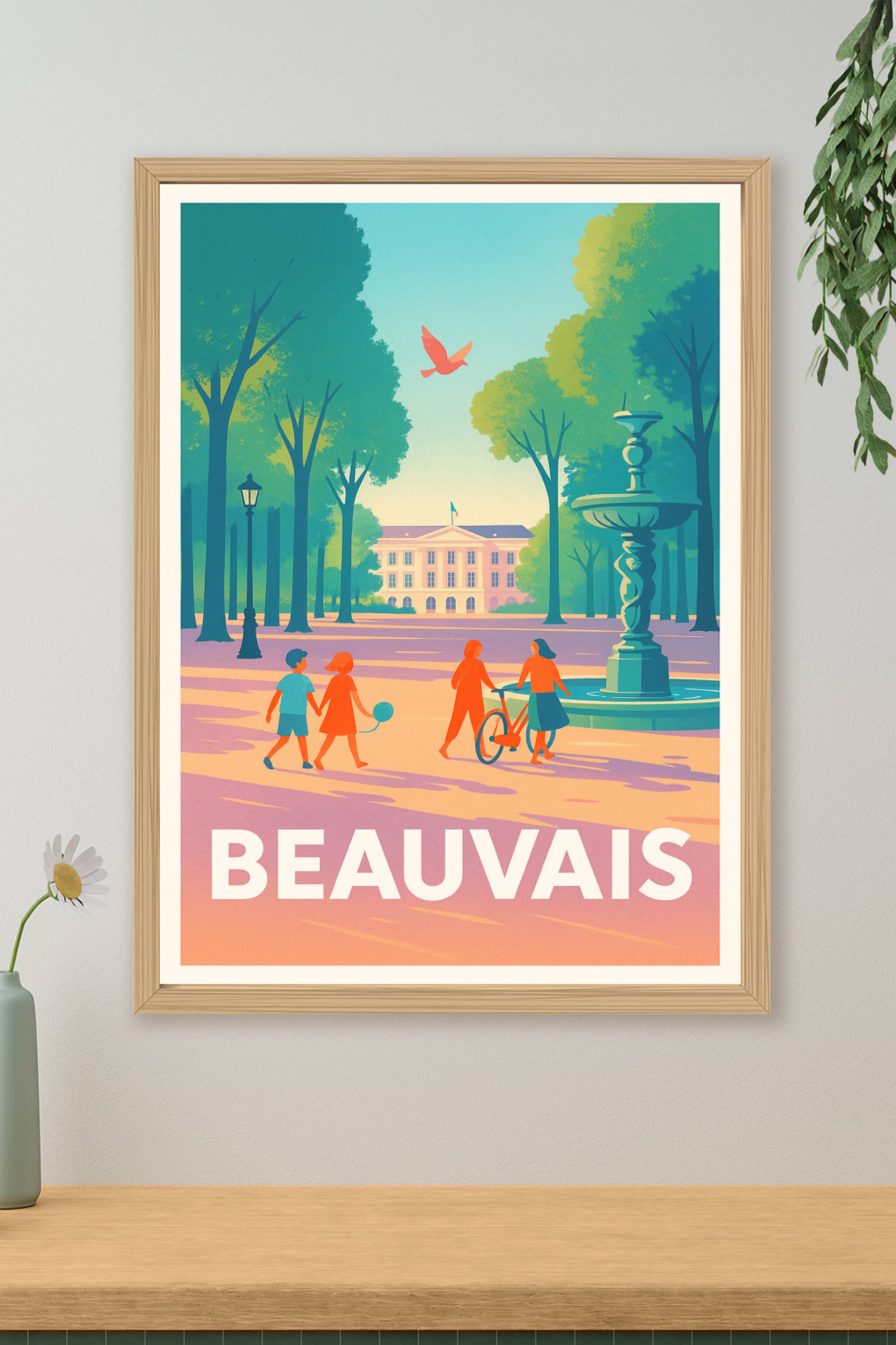 Découvrez la douceur et la sérénité de Beauvais à travers cette affiche illustrée qui capture un moment paisible dans un parc ombragé, avec ses all...