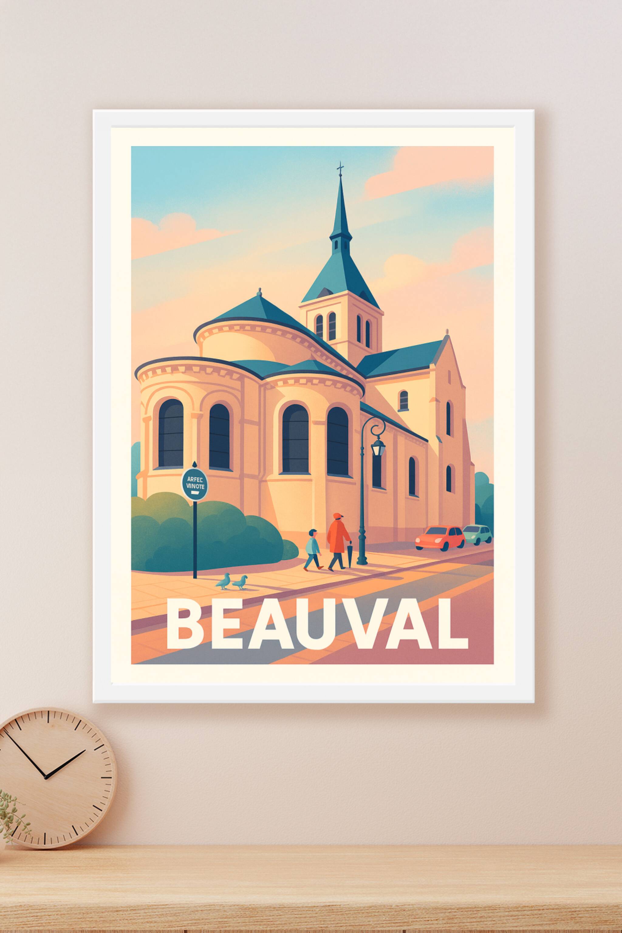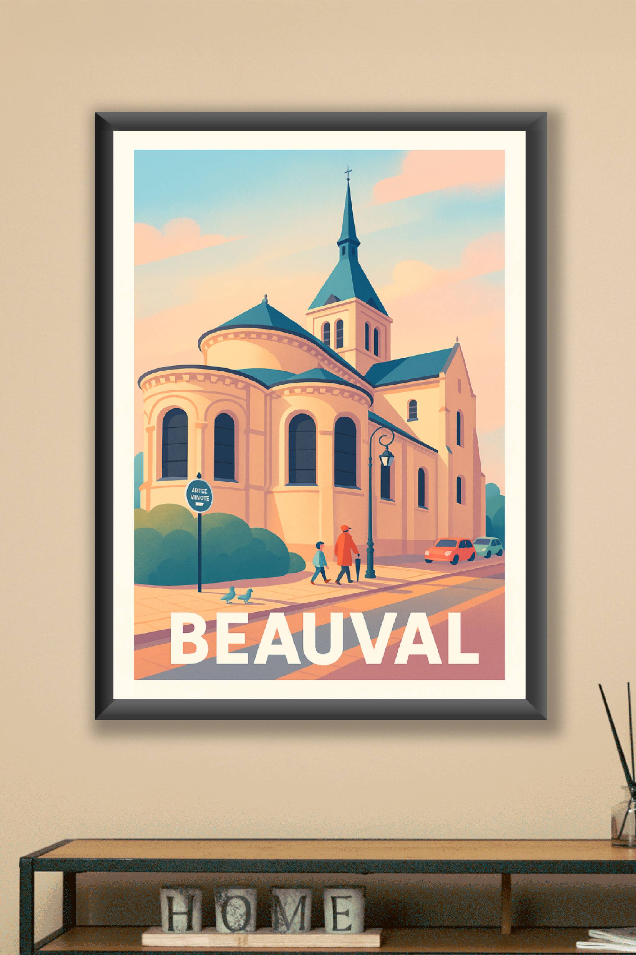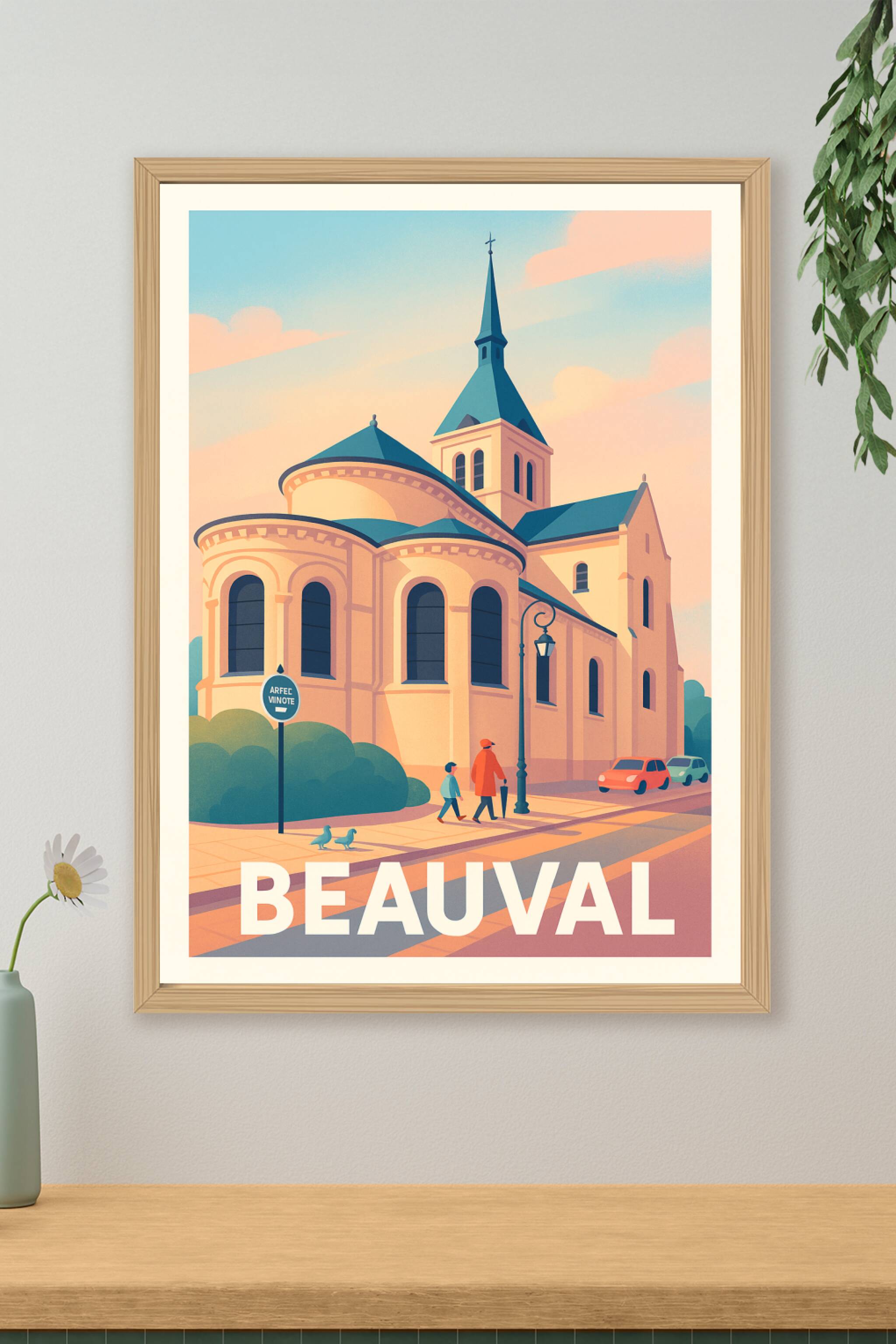 Découvrez l'élégance intemporelle de Beauval à travers cette affiche illustrée qui met en valeur un monument emblématique baigné de la lumière douc...