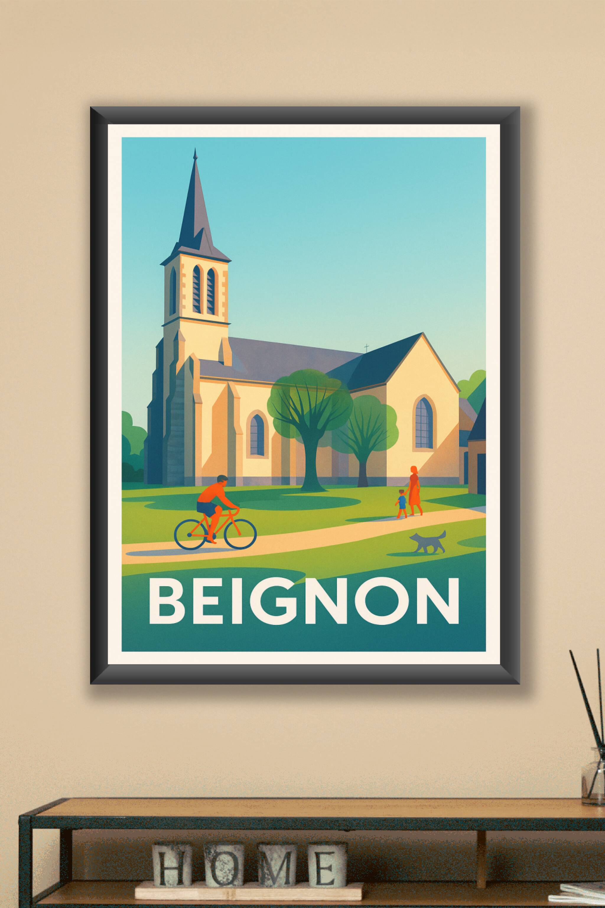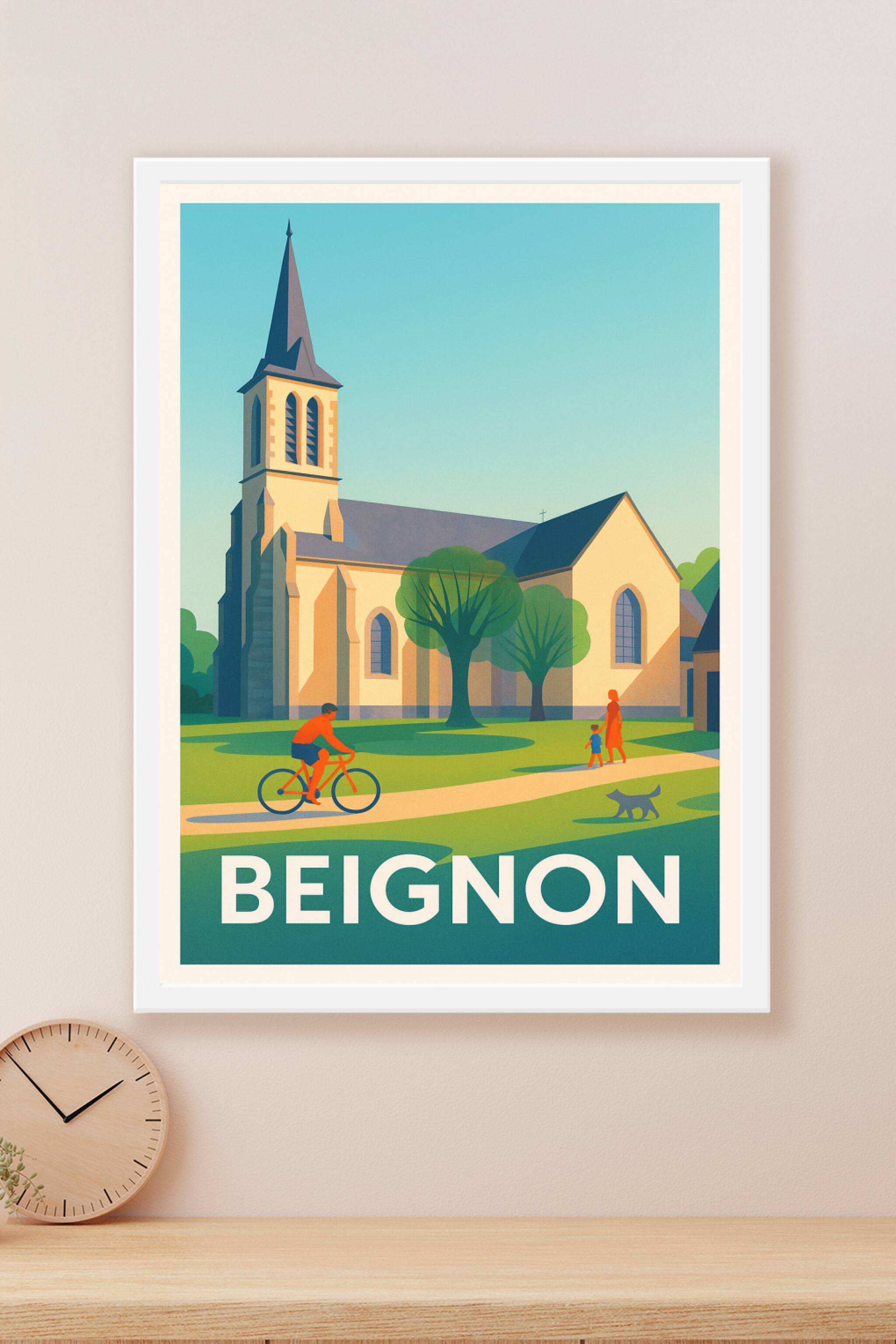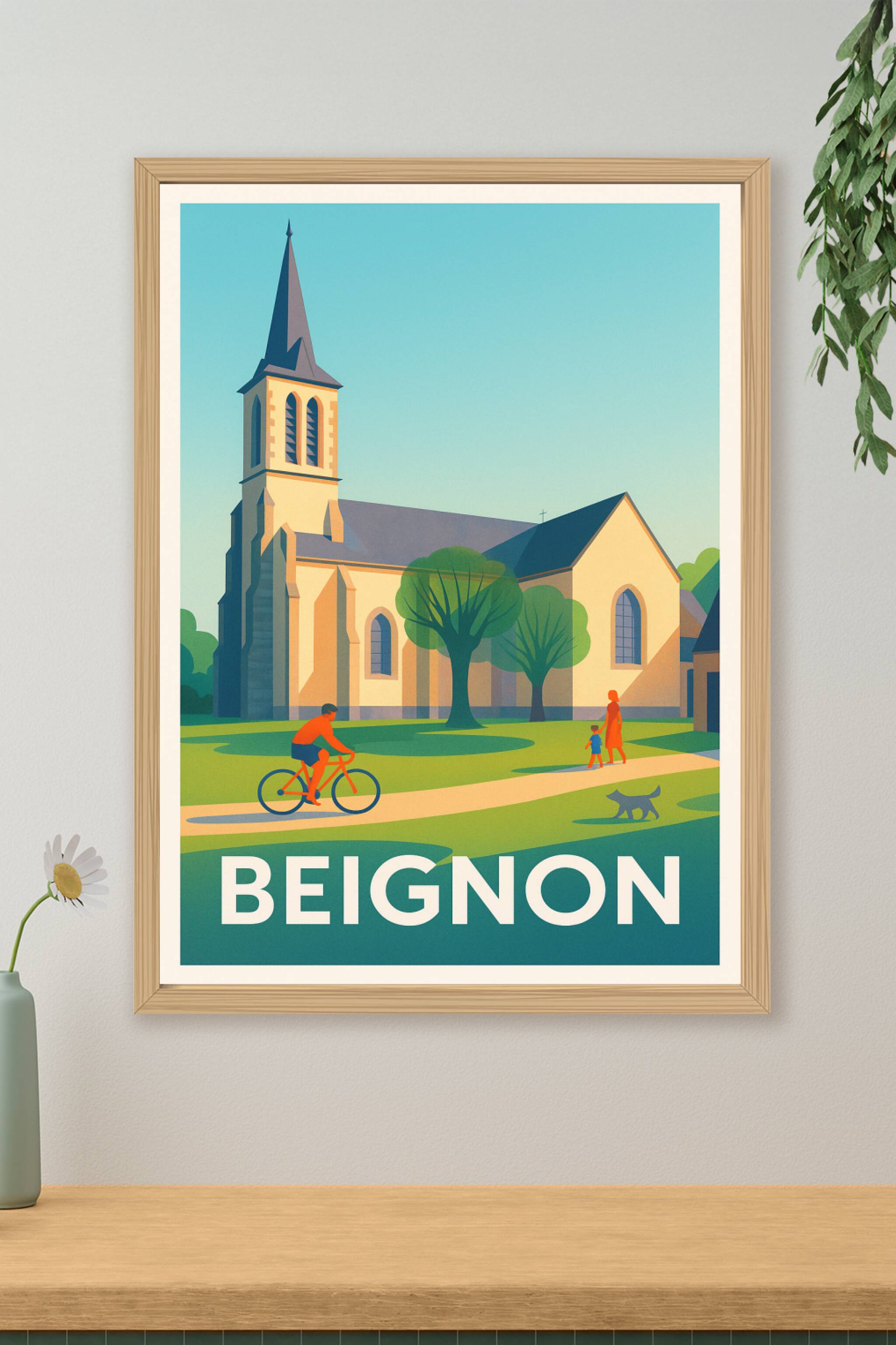 Découvrez l'atmosphère sereine et pittoresque de Beignon avec cette affiche illustrée mettant en scène son église emblématique sous un ciel bleu lumineux. Ce poster invite à la promenade et au calme, avec une scène où un cycliste et une mère avec son enfant profitent d'une journée ensoleillée dans un cadre verdoyant.Cette affiche est réalisée en tirage "Fine Art" sur un papier 305g coton de haute qualité, garantissant des couleurs vives et une durabilité exceptionnelle. Disponible en plusieurs formats, de l’A4 à l’A1, avec ou sans cadre, elle s’adapte parfaitement à toutes vos envies de décoration intérieure.Offrez-vous ou à vos proches un souvenir élégant et authentique de Beignon, imprimé en France avec un soin artisanal et une qualité premium.