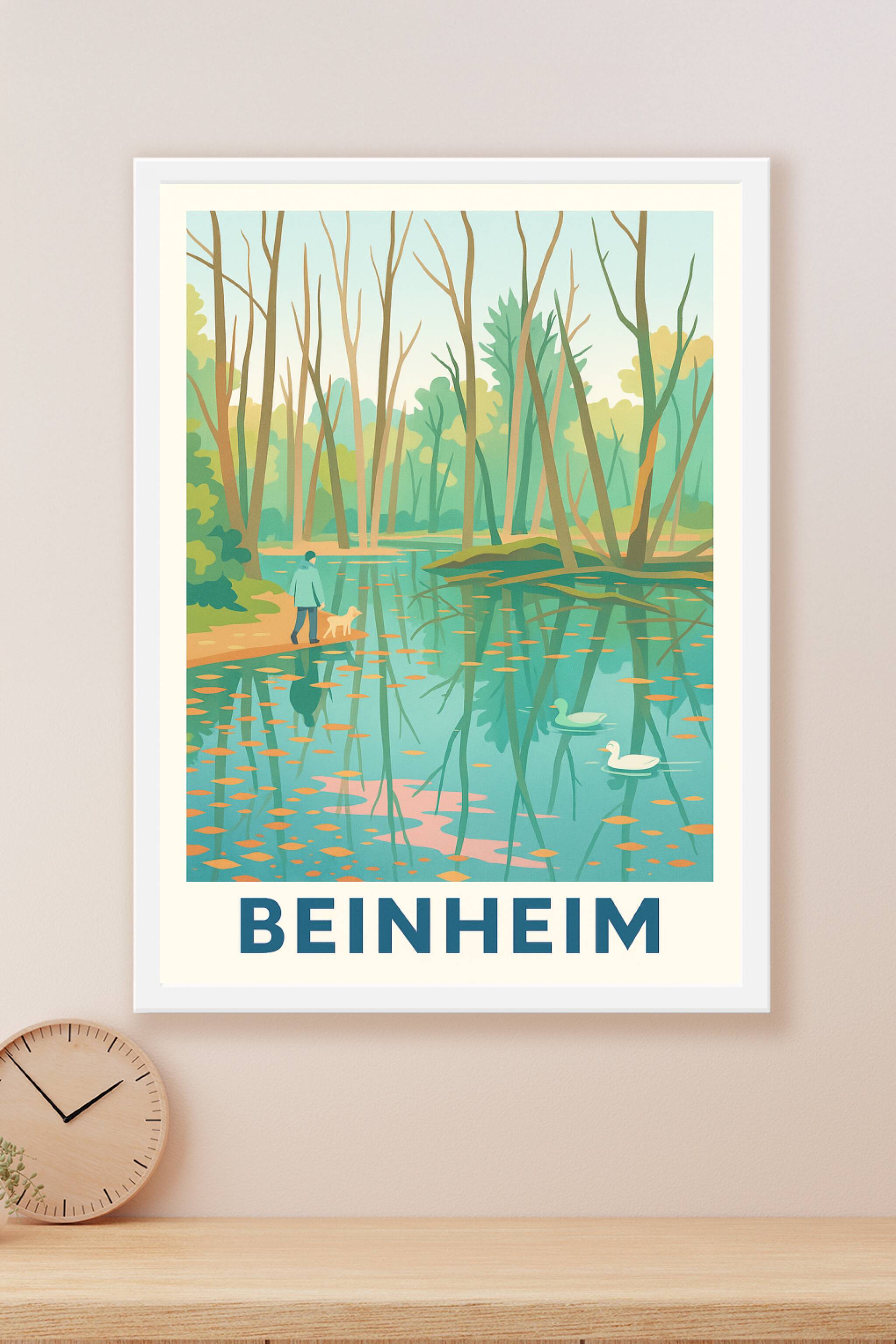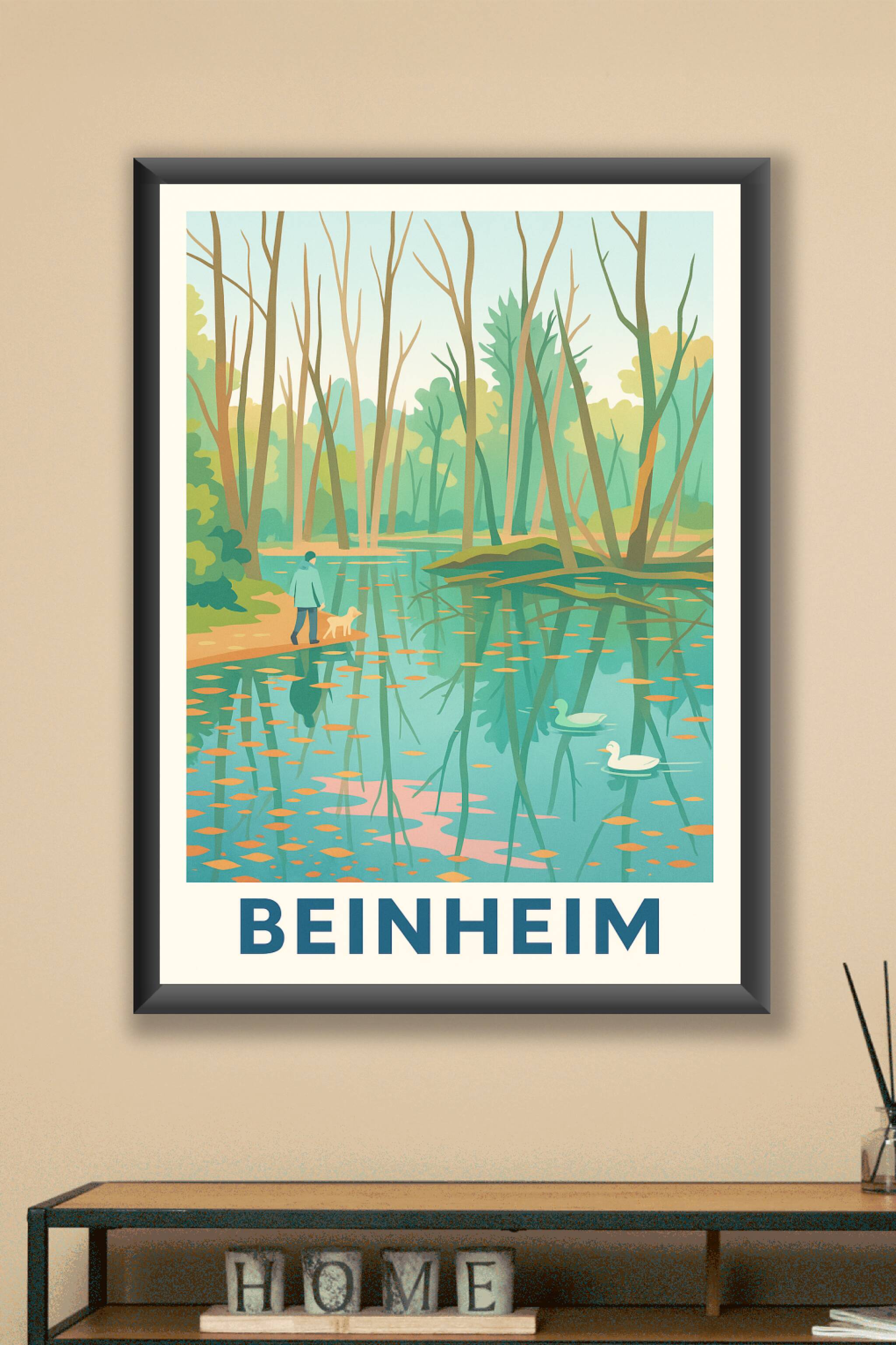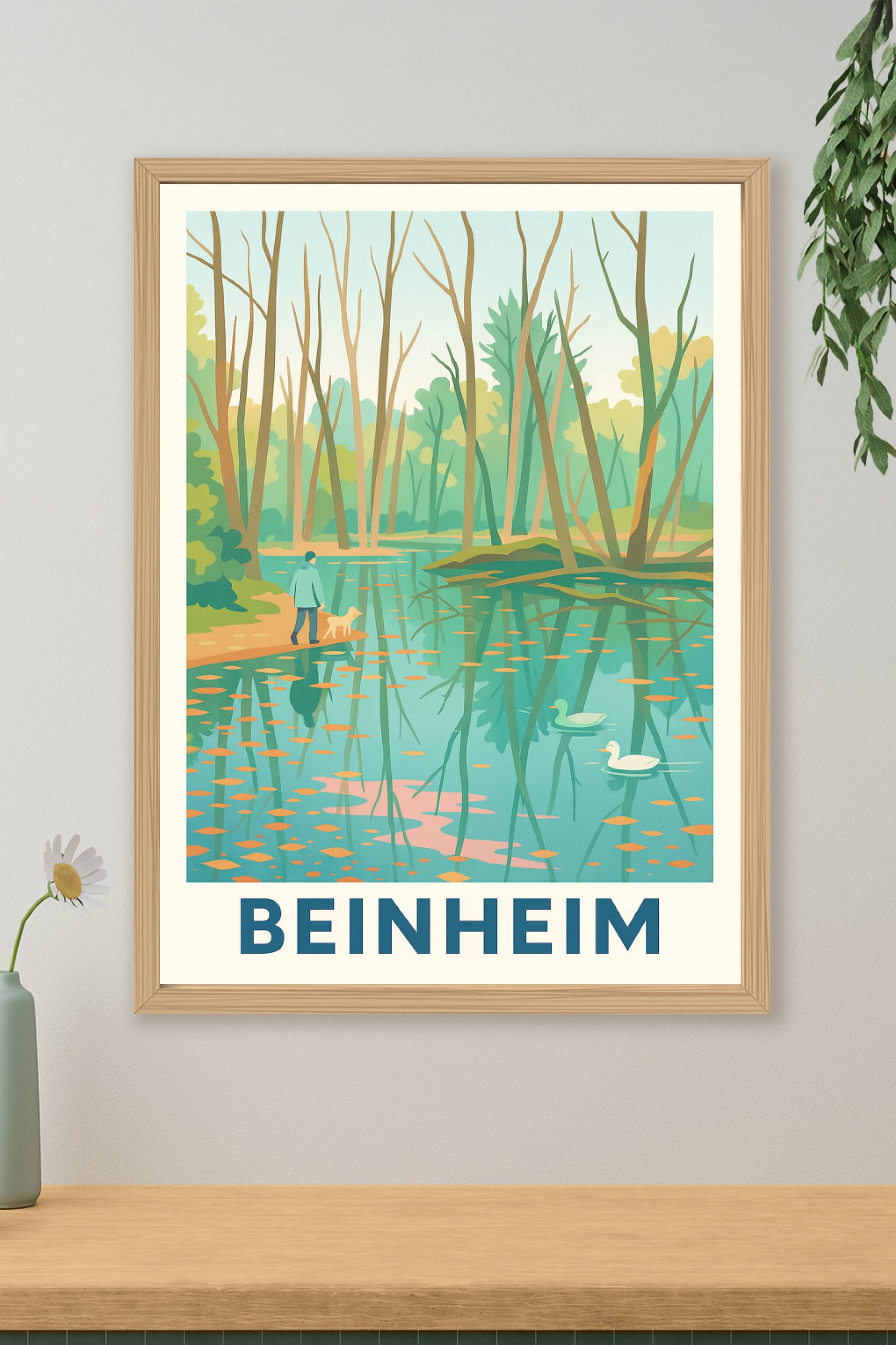 Découvrez la tranquillité douce de Beinheim avec cette affiche illustrée qui capture un paysage aquatique apaisant, embrassé par la lumière naturel...