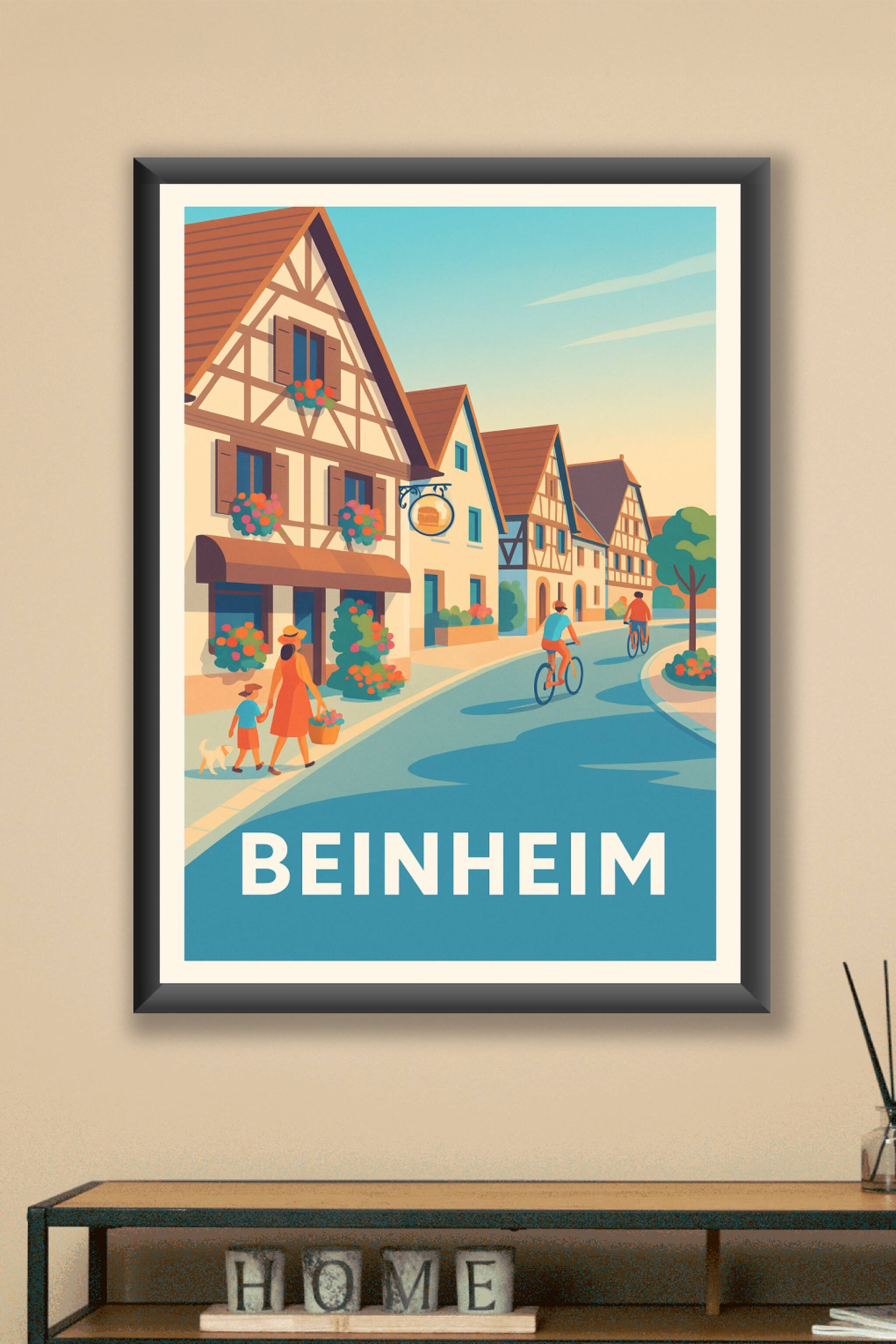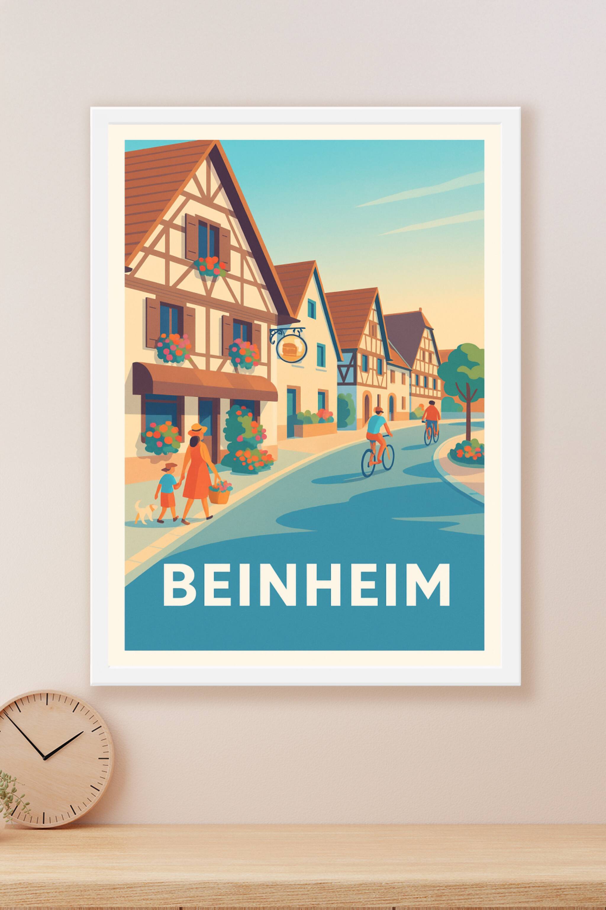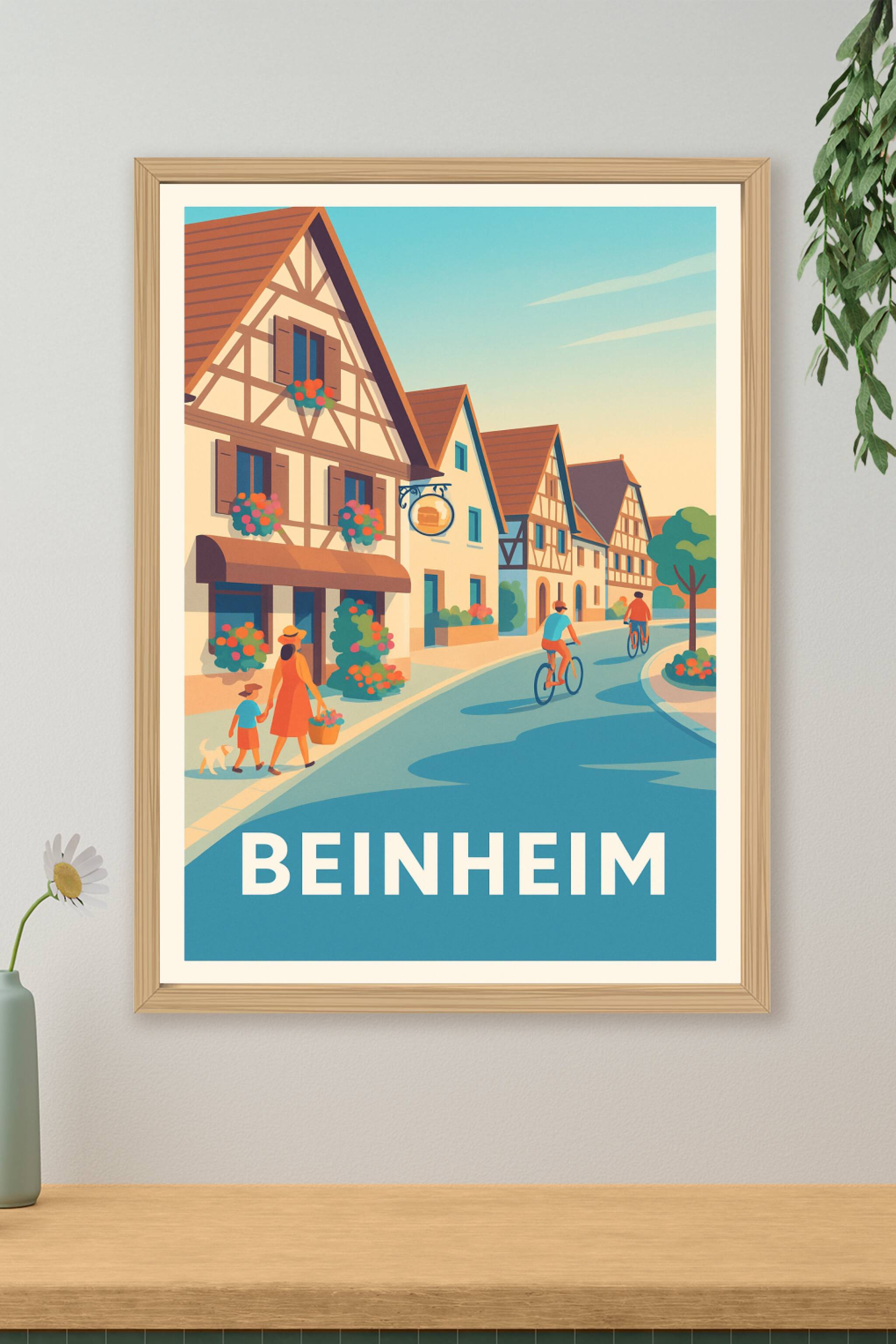 Découvrez le charme authentique de Beinheim avec cette affiche illustrée mettant en scène ses maisons à colombages typiques et une vie quotidienne ...