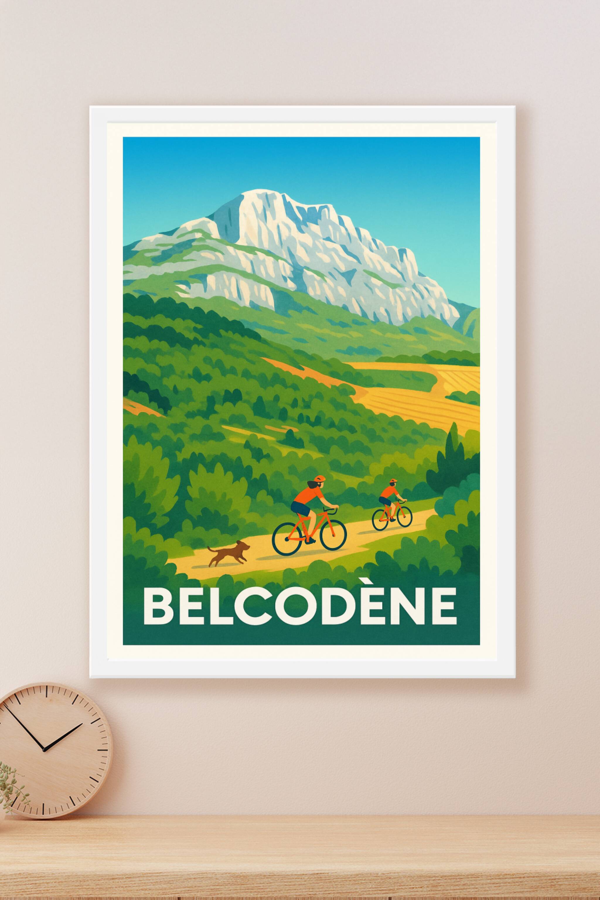 Découvrez la beauté naturelle et authentique de Belcodène à travers cette affiche illustrée qui met en scène une promenade à vélo dans un décor ver...