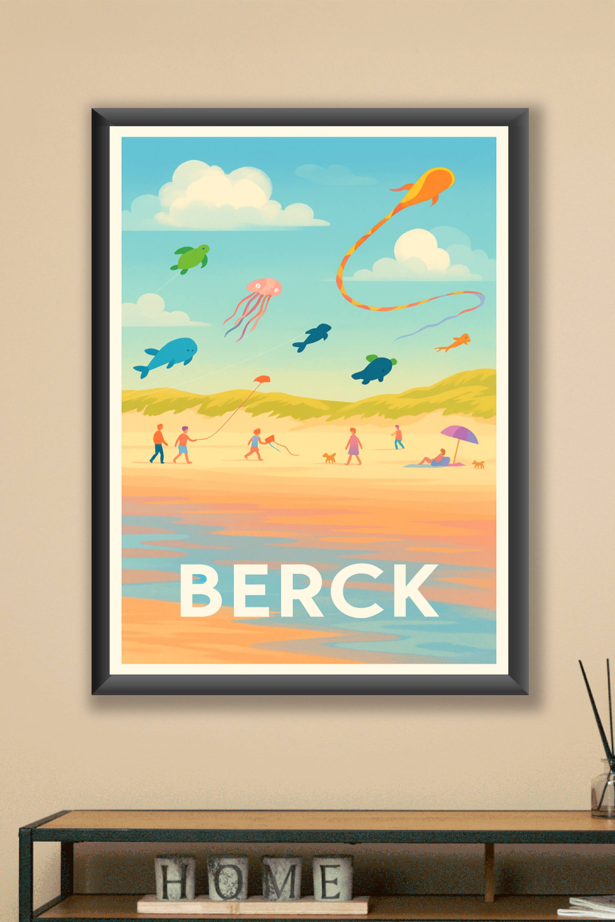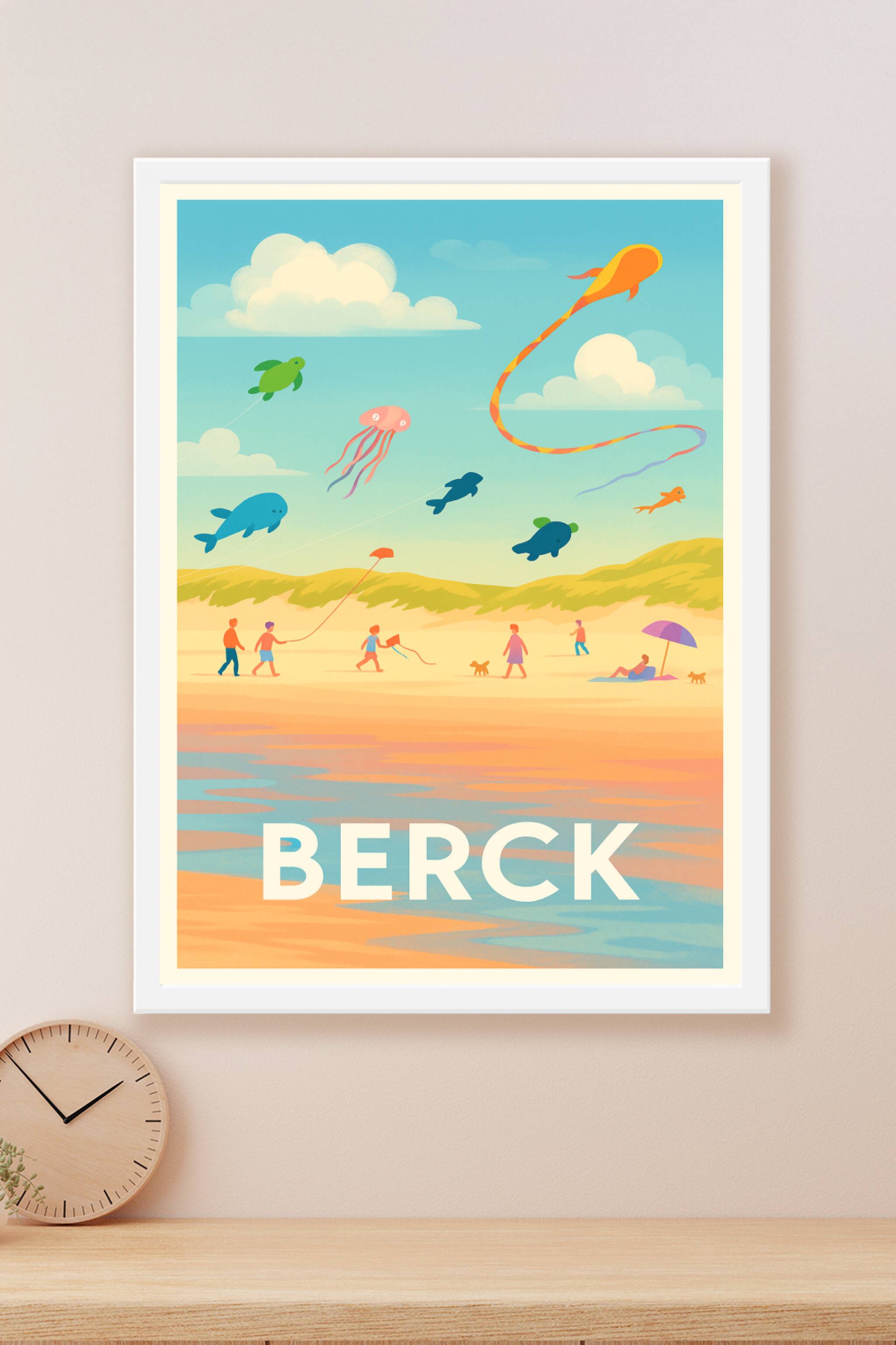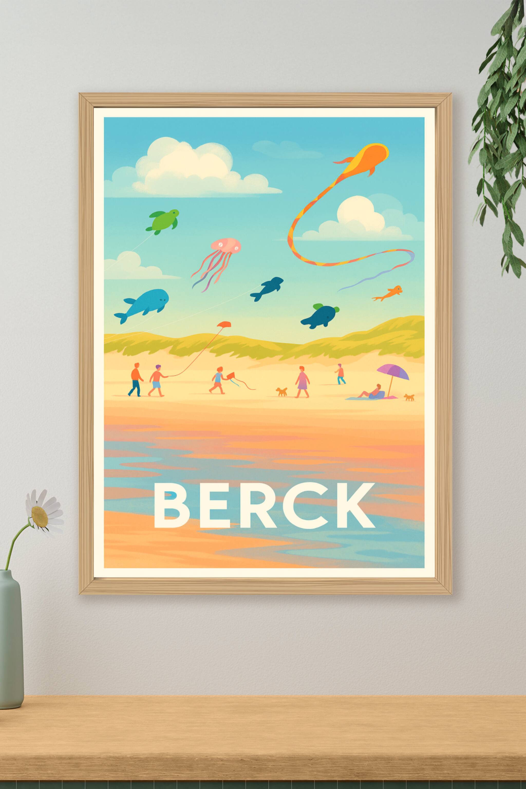 Découvrez la douceur de vivre de la plage de Berck avec cette affiche pleine de poésie et de légèreté. Représentant une scène estivale où cerfs-vol...