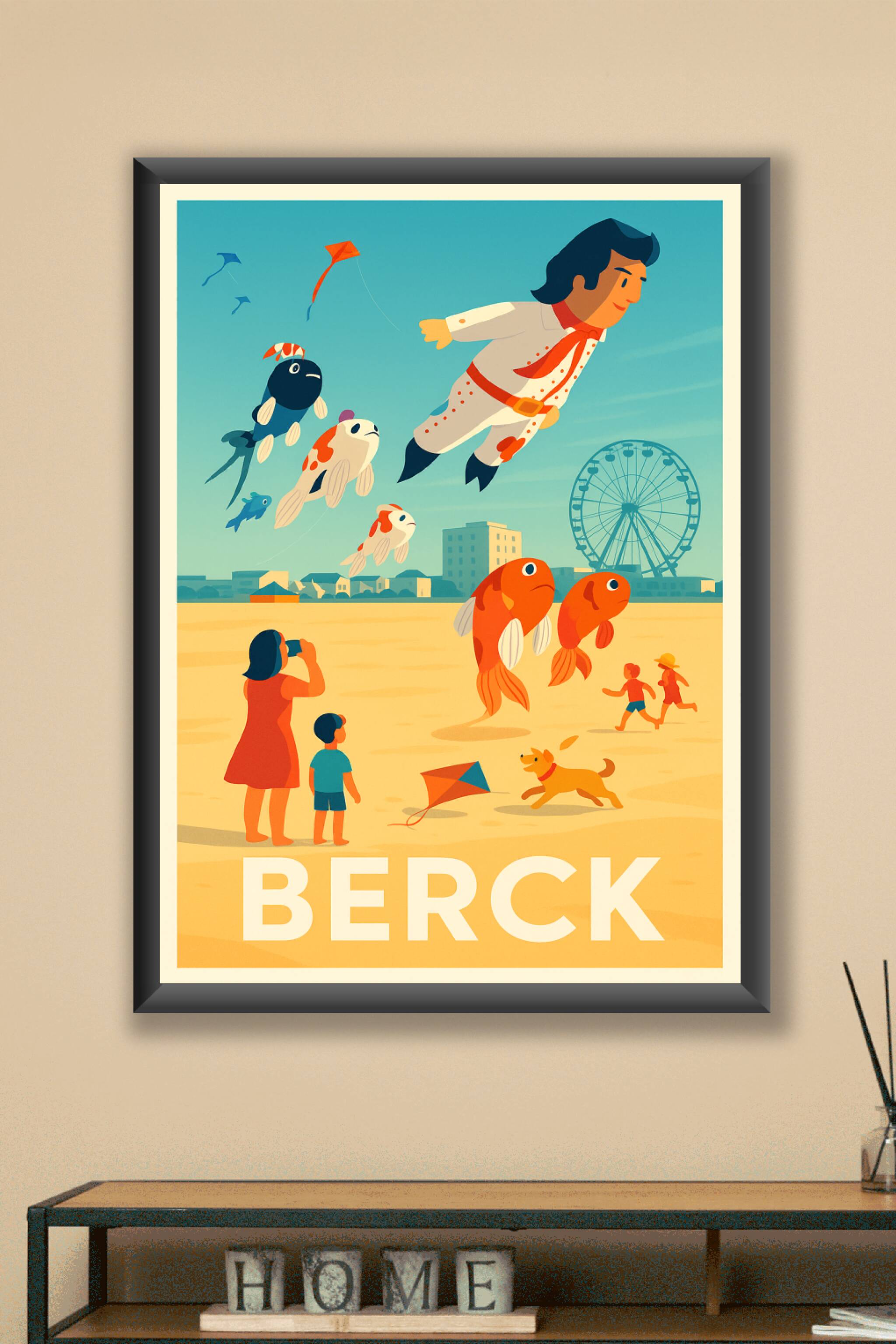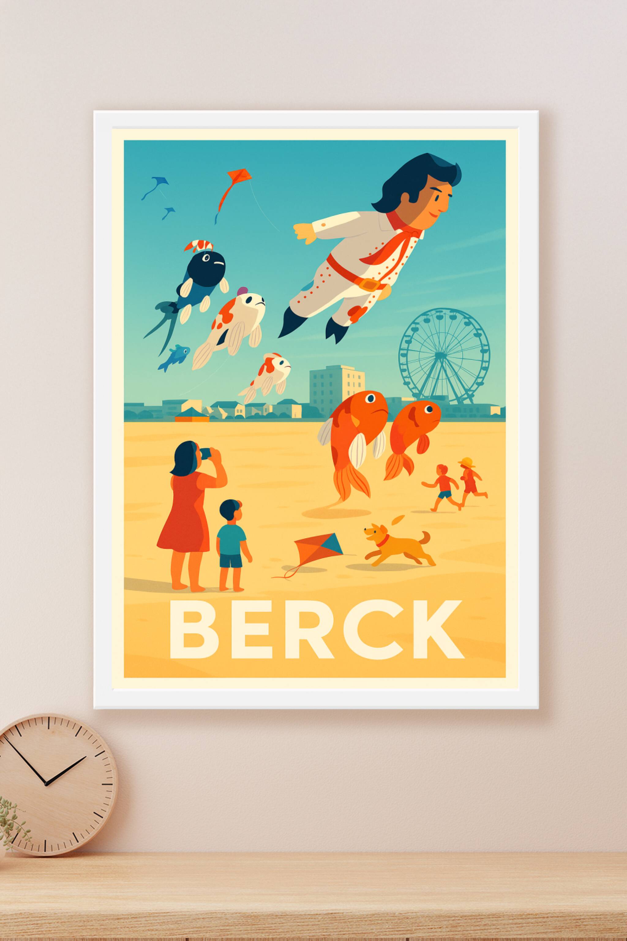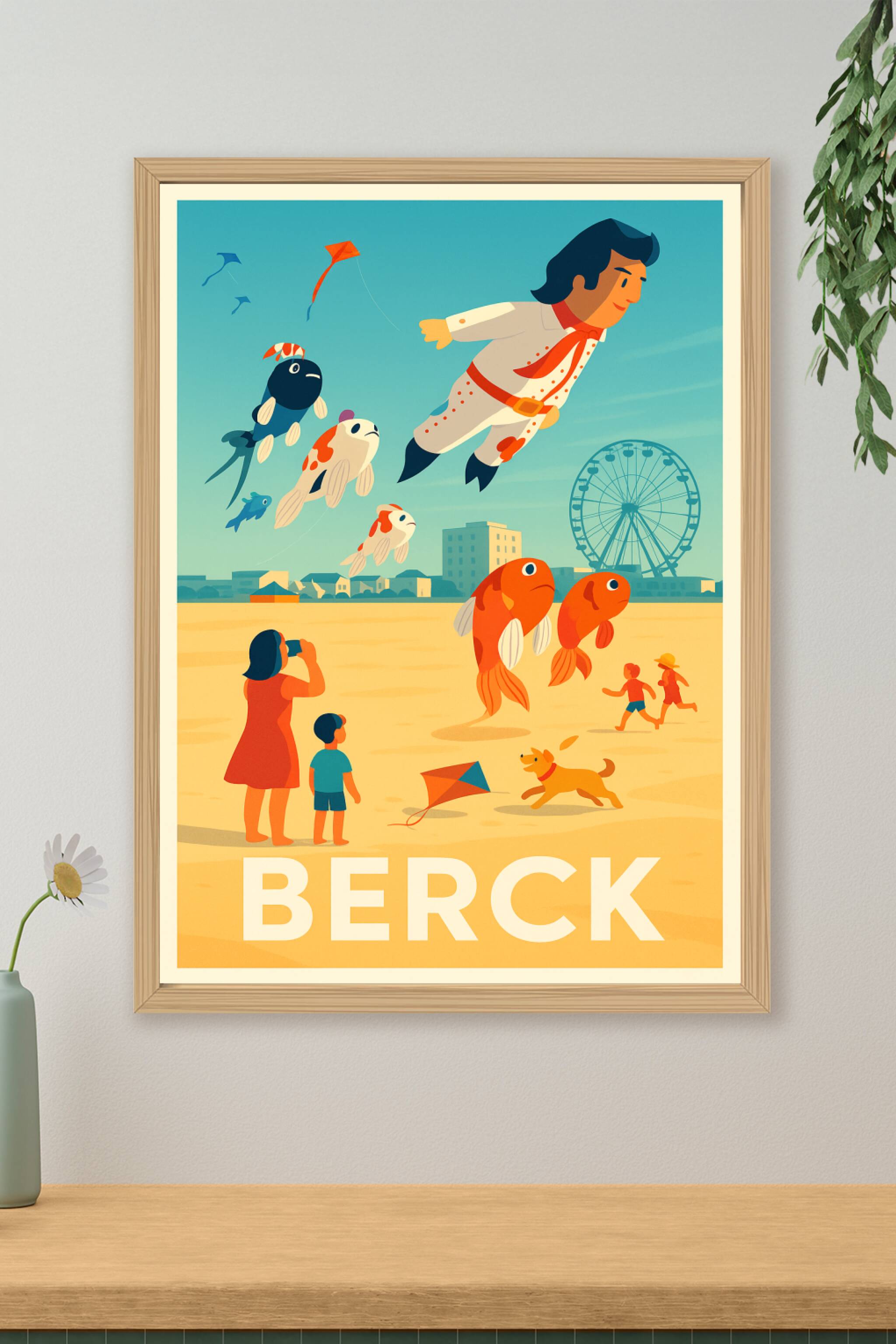 Découvrez l'esprit ludique et onirique de Berck avec cette affiche originale illustrant une scène de plage où des cerfs-volants extraordinaires pre...