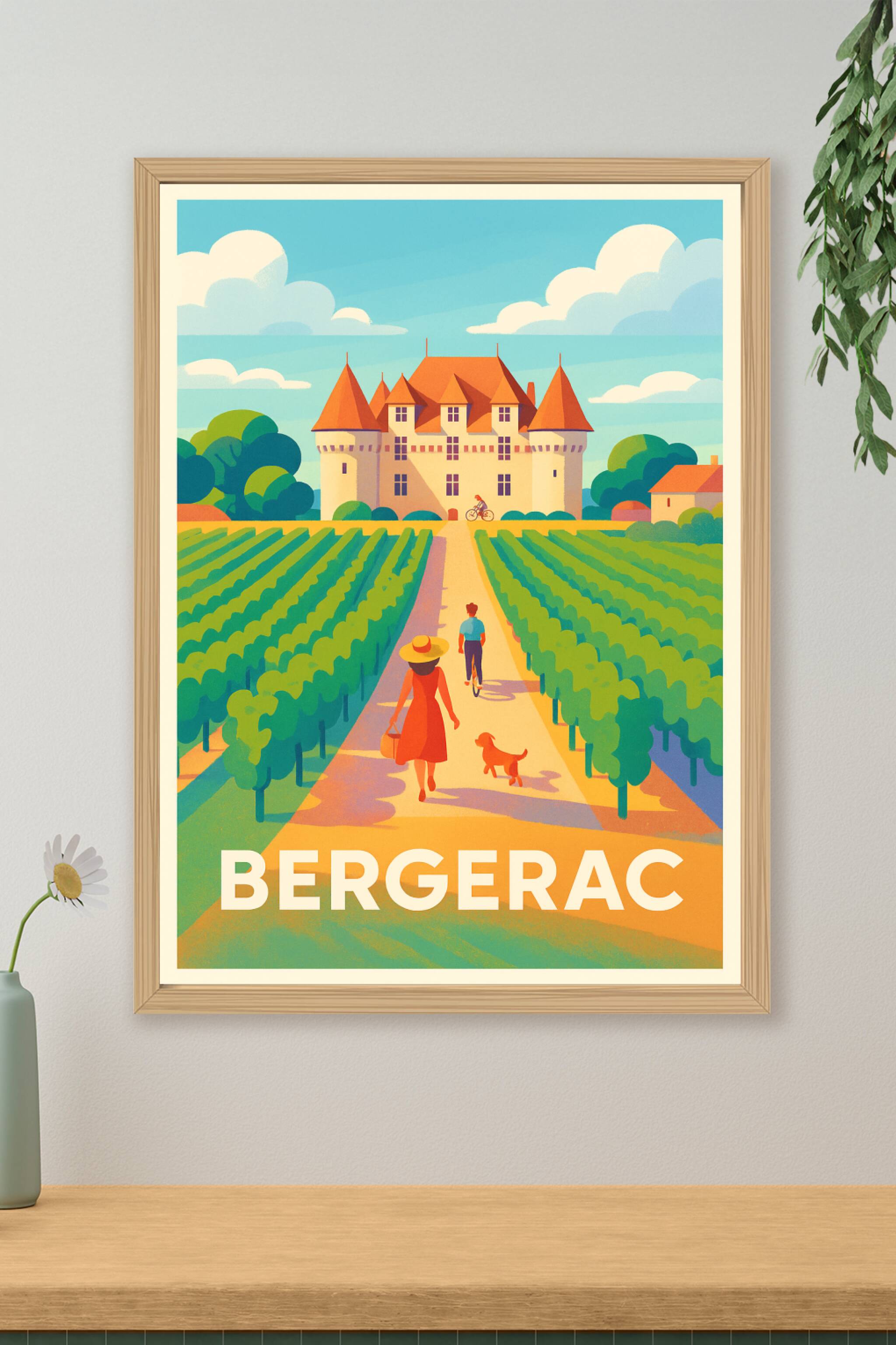 Découvrez la douceur de vivre de Bergerac à travers cette affiche aux couleurs chaleureuses, où vignobles et château se mêlent pour une scène bucol...