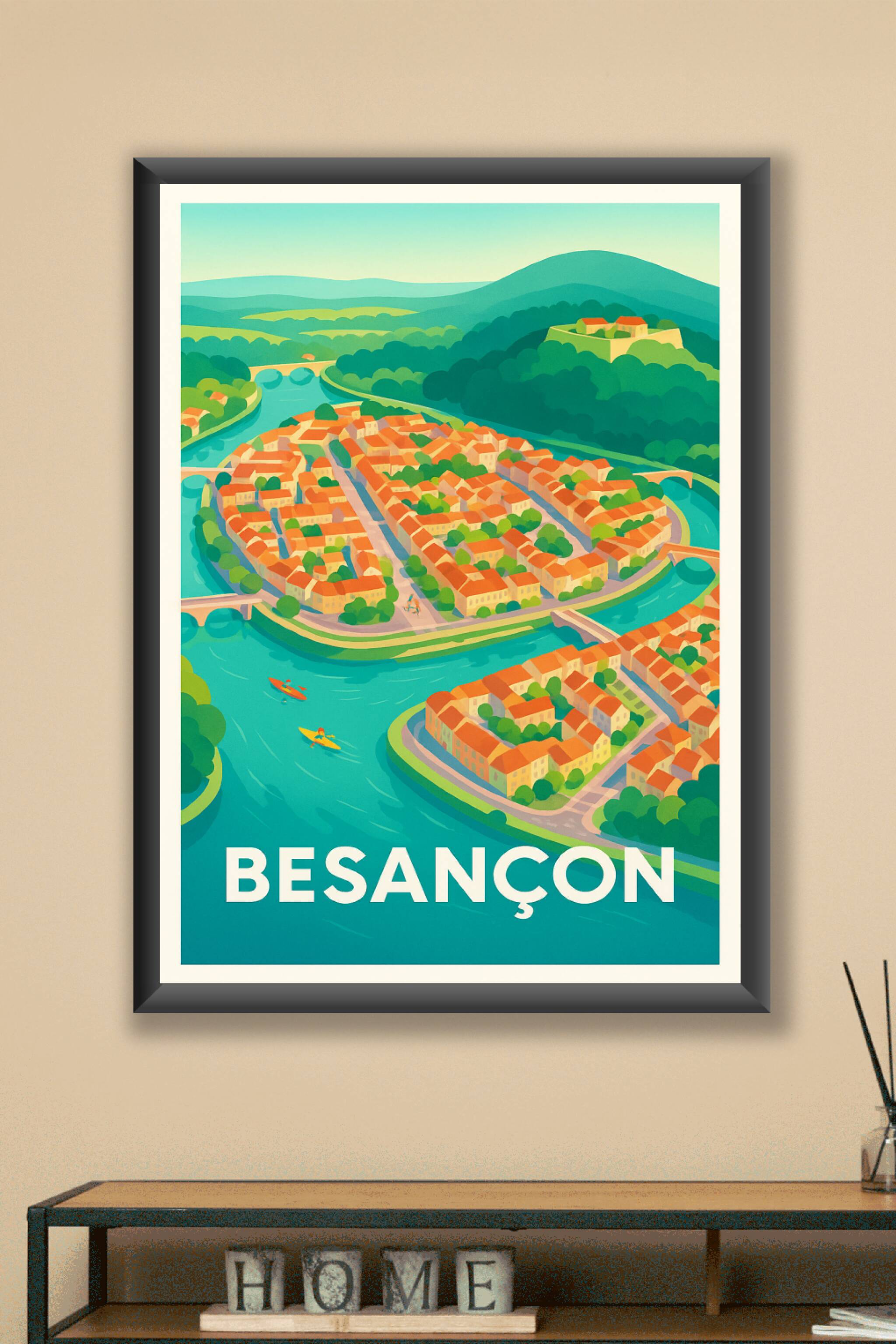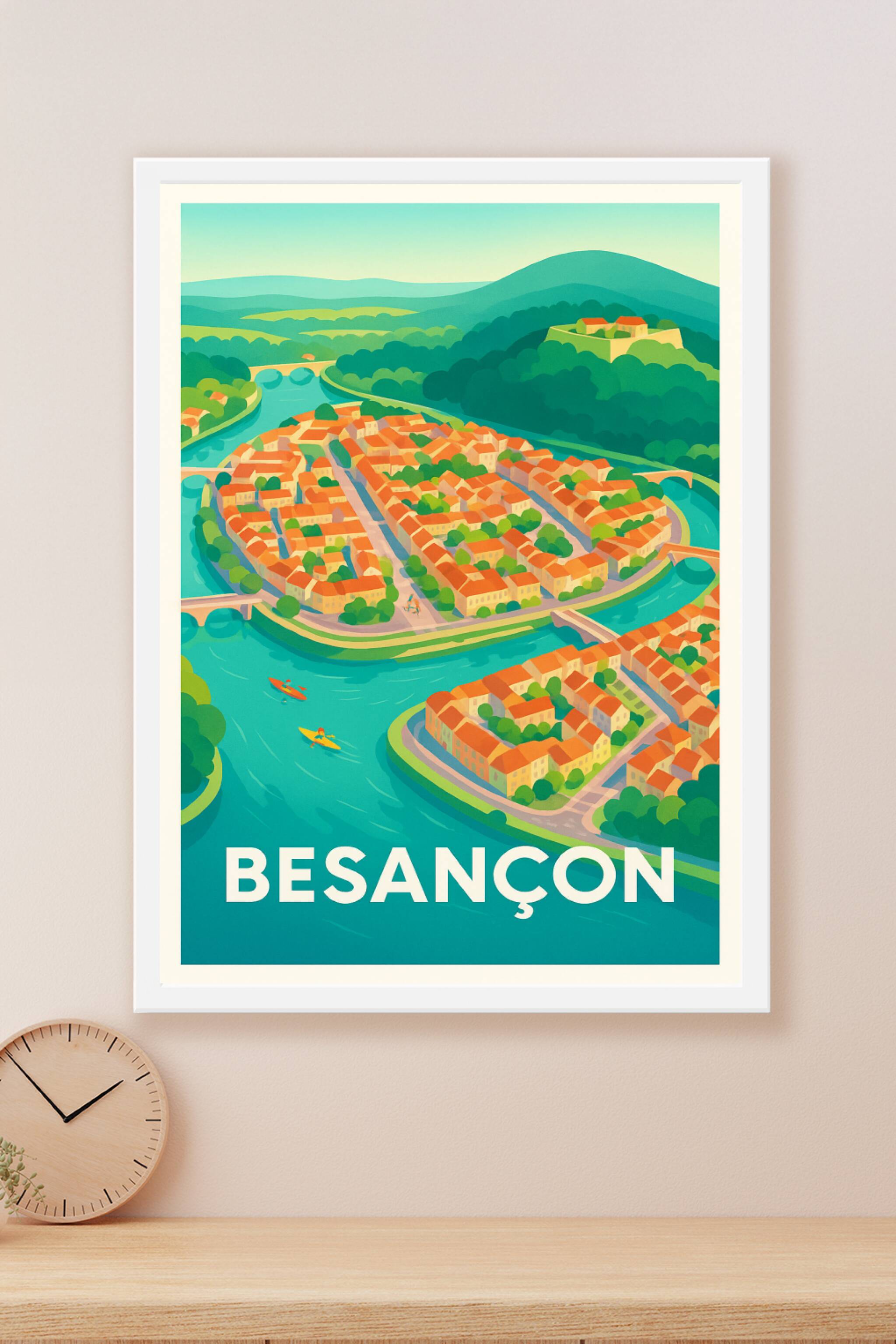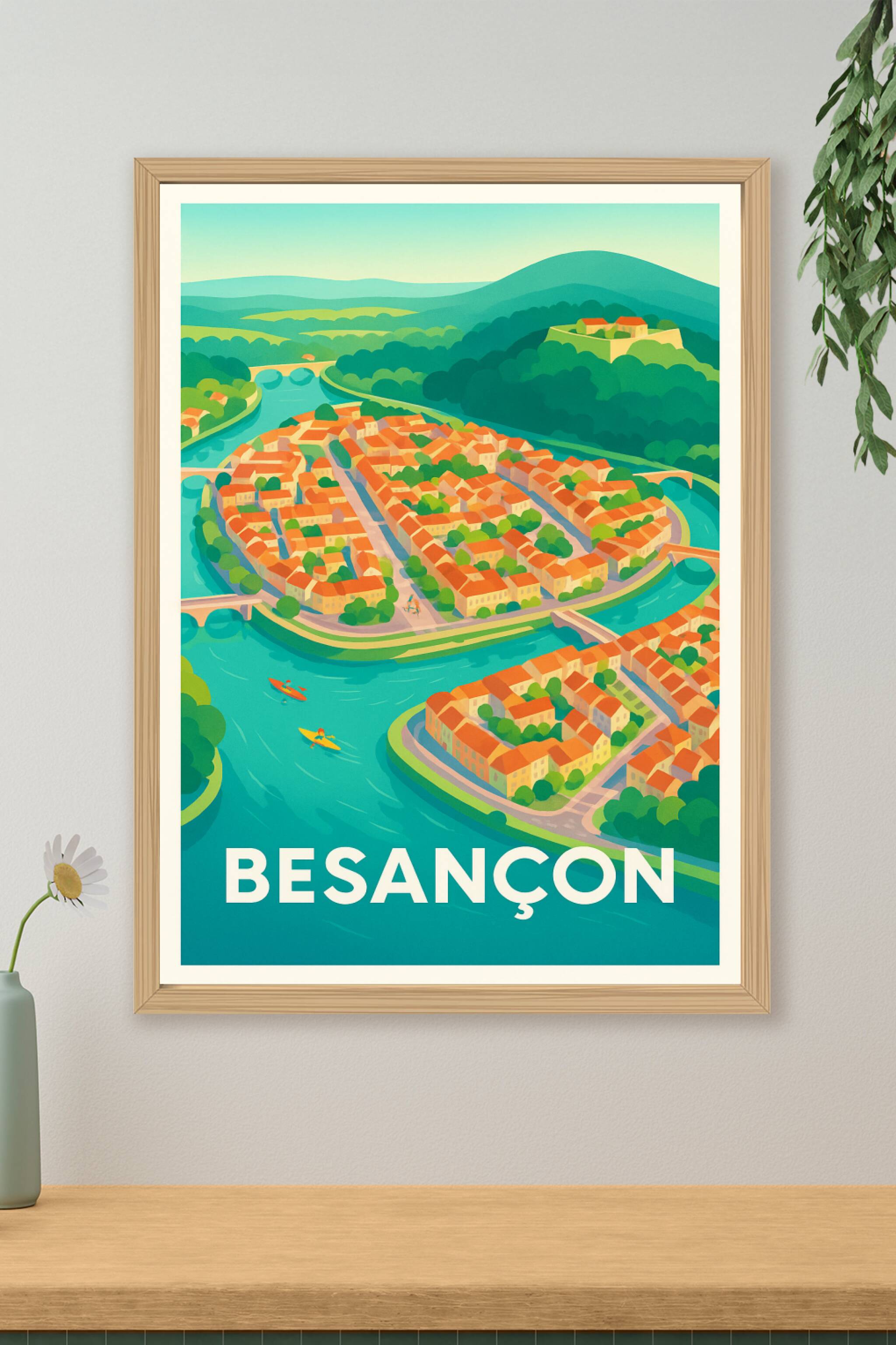 Découvrez Besançon sous un nouveau jour avec cette affiche illustrée représentant la ville entourée par ses cours d'eau sinueux et ses bâtiments co...
