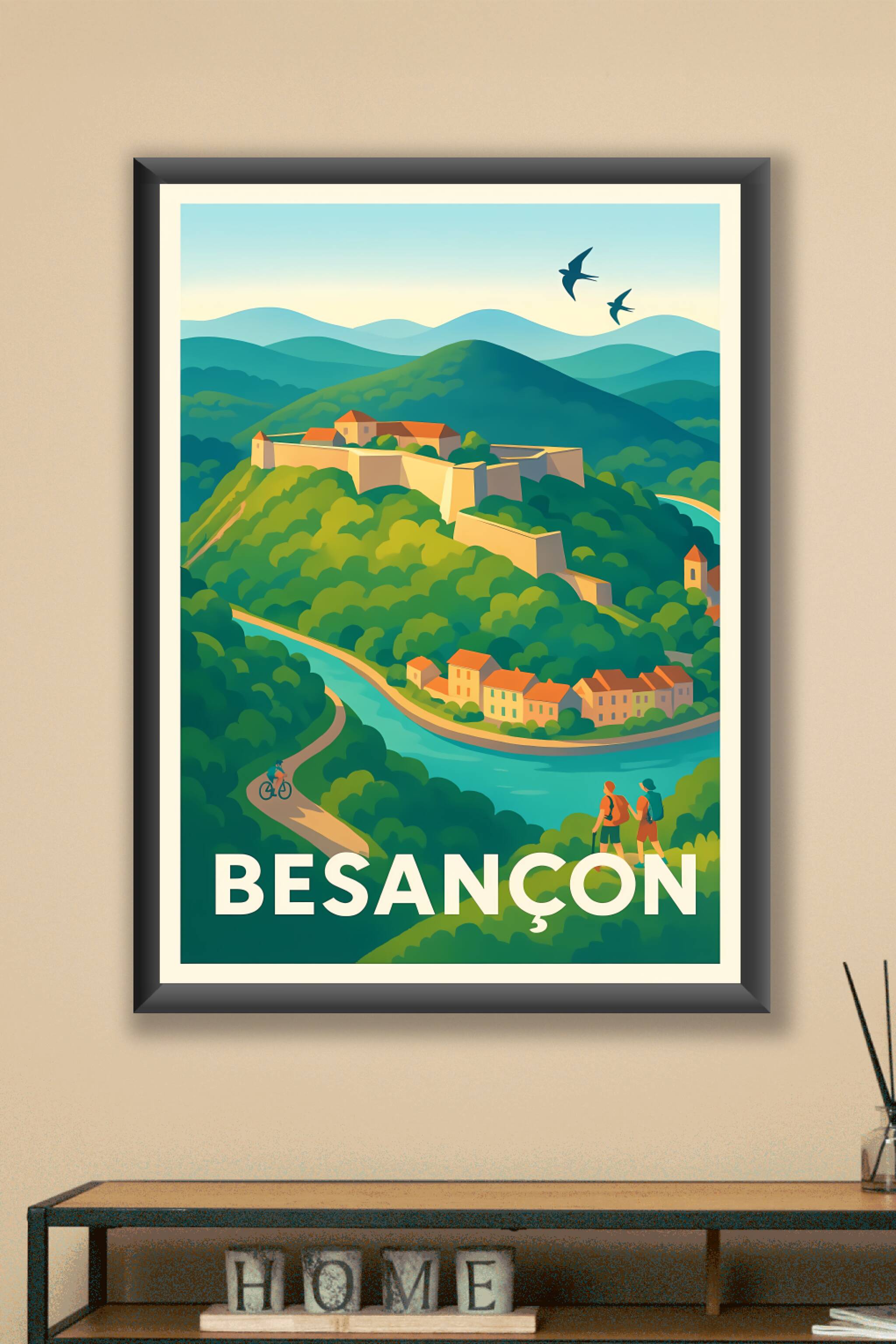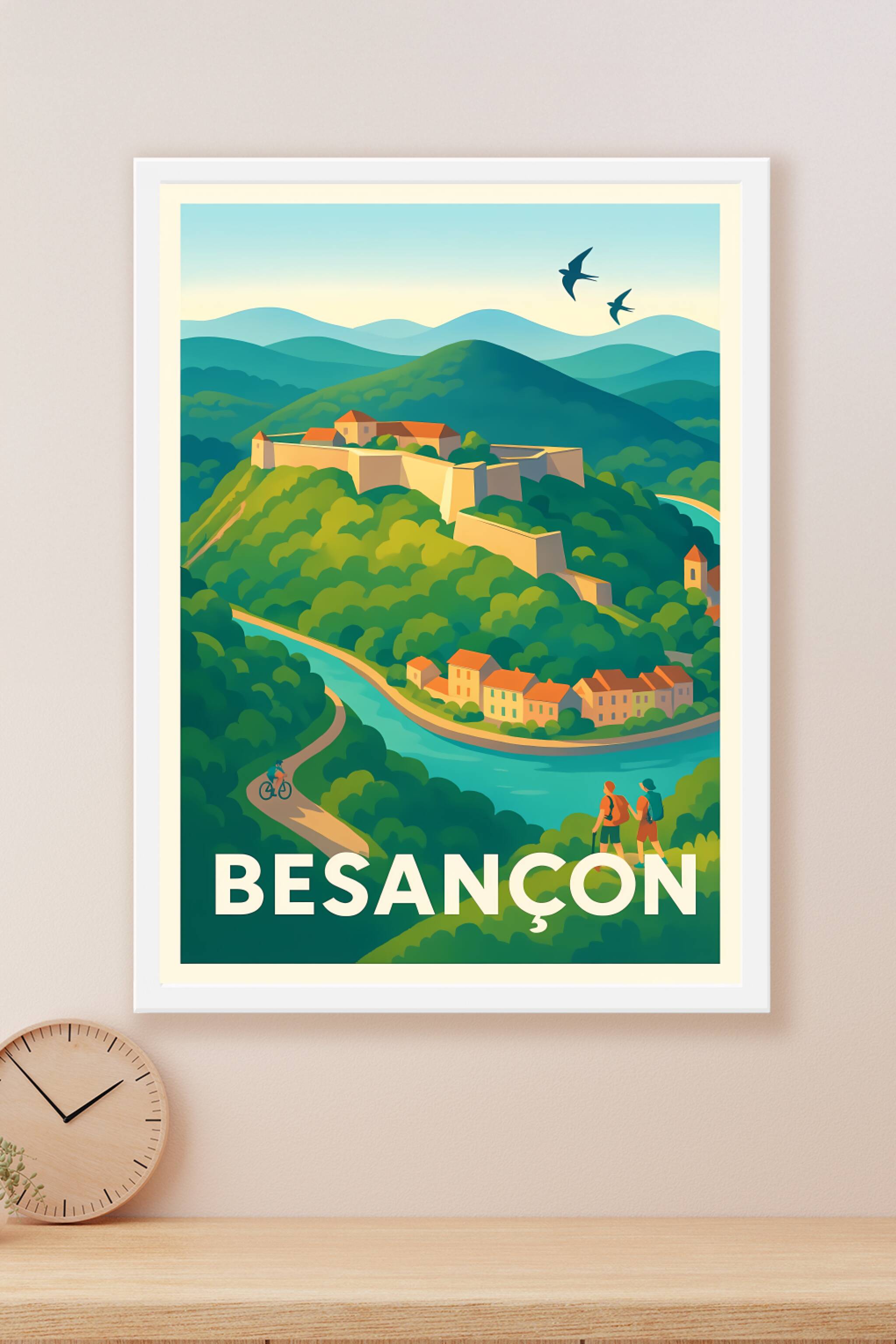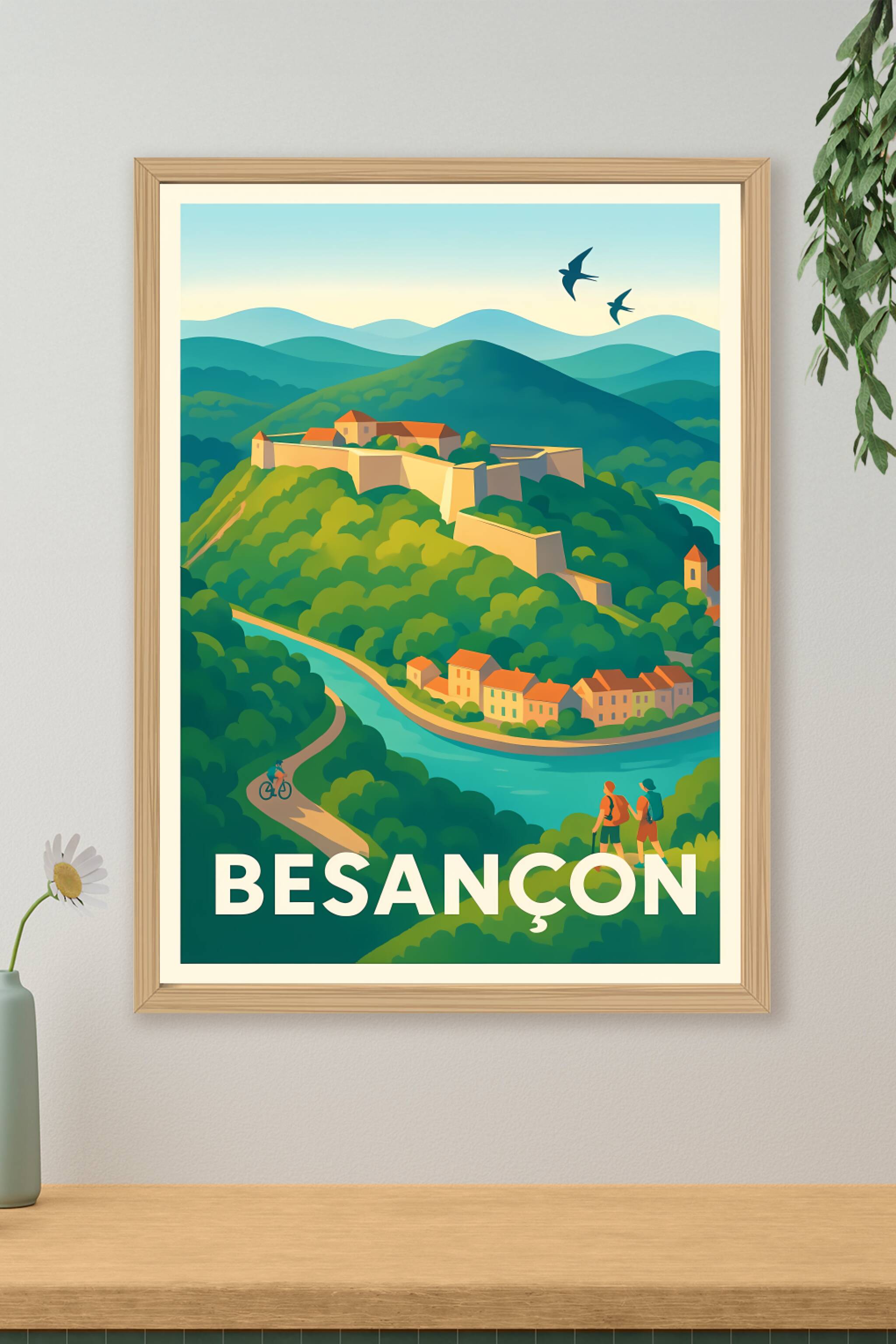 Découvrez la ville de Besançon à travers cette affiche vintage qui met en valeur sa forteresse emblématique et son environnement naturel verdoyant....