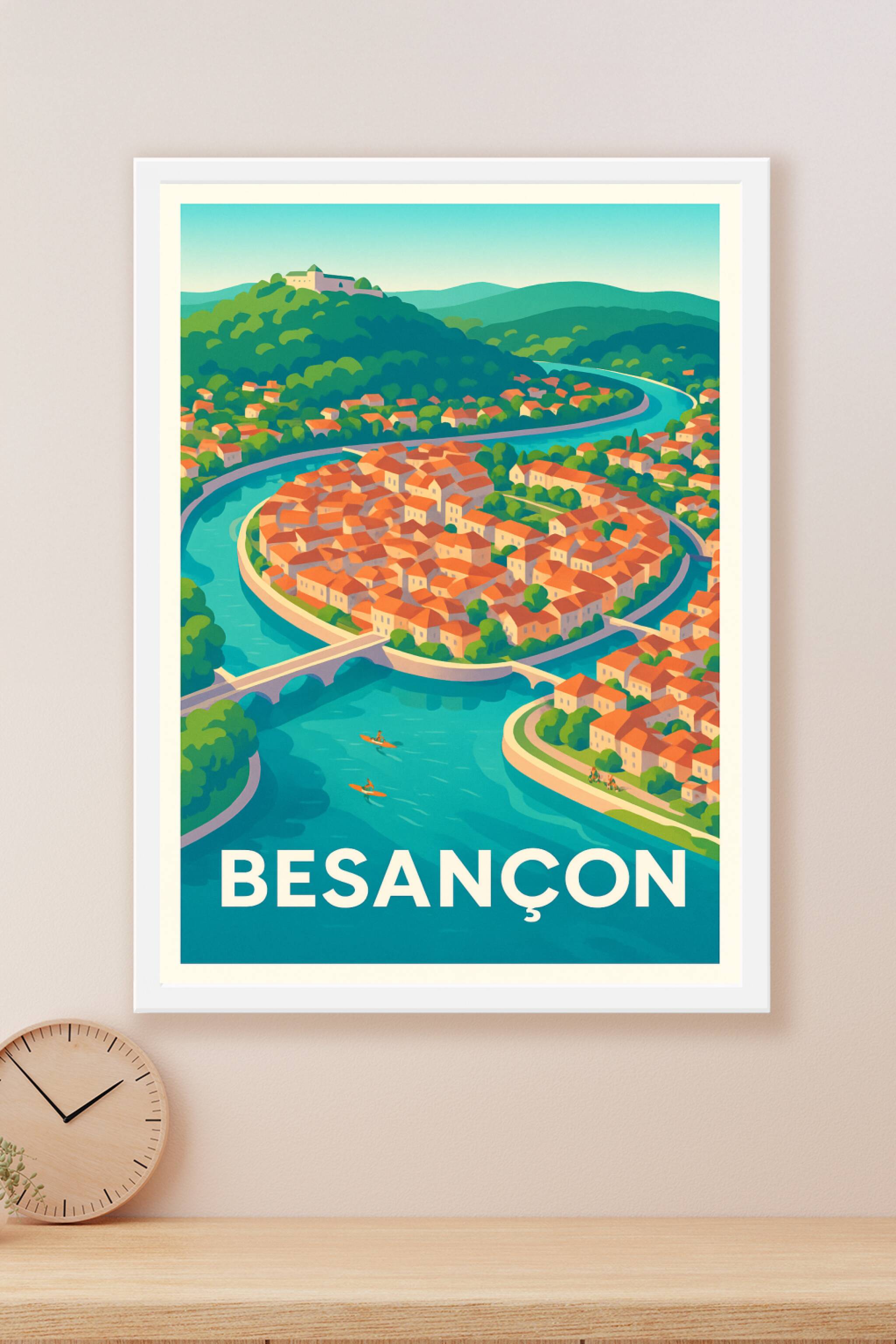 Découvrez cette affiche représentant la charmante ville de Besançon, magnifiée par sa célèbre boucle du Doubs et son architecture typique aux toits...
