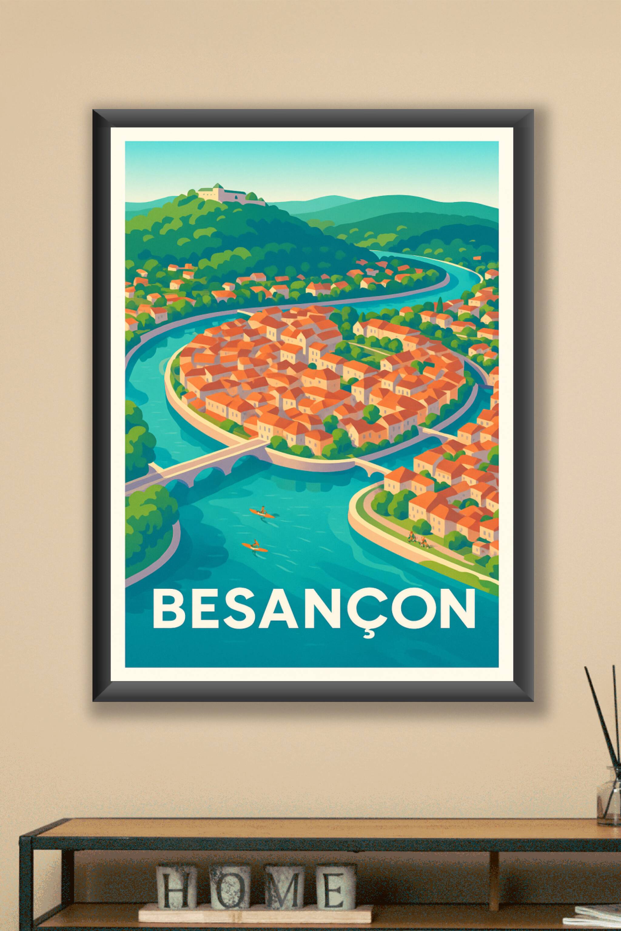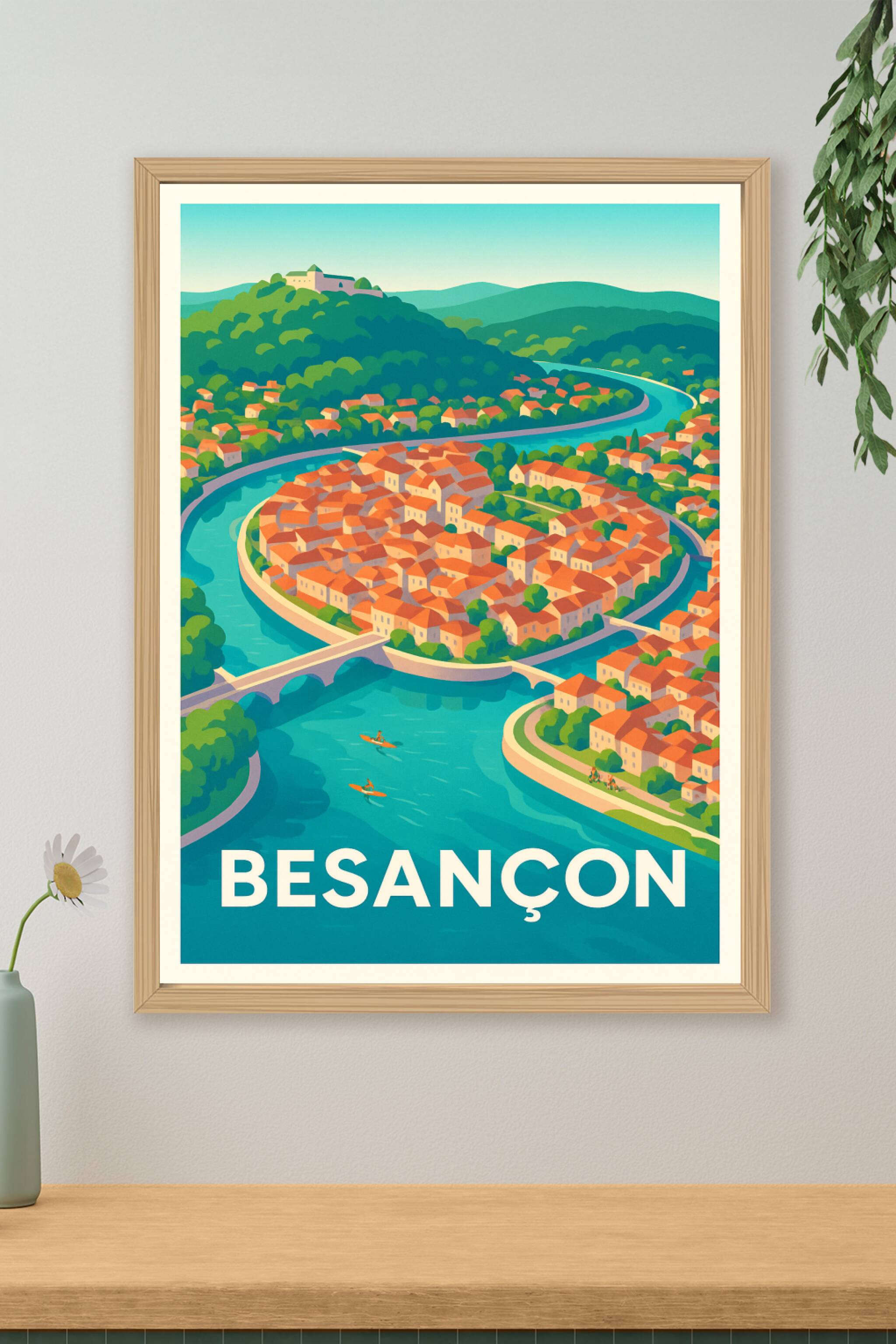 Découvrez cette affiche représentant la charmante ville de Besançon, magnifiée par sa célèbre boucle du Doubs et son architecture typique aux toits rouges. Ce poster illustré apporte une atmosphère apaisante et colorée à votre décoration intérieure. Imprimée en tirage "Fine Art" sur papier coton 305g, cette affiche garantit une qualité d'impression supérieure, riche en détails et couleurs éclatantes. Disponible en formats A1 à A4, avec ou sans cadre, elle s'adapte parfaitement à tous les espaces. Profitez d'une création 100% made in France pour embellir votre intérieur ou offrir un cadeau authentique aux passionnés de la région.