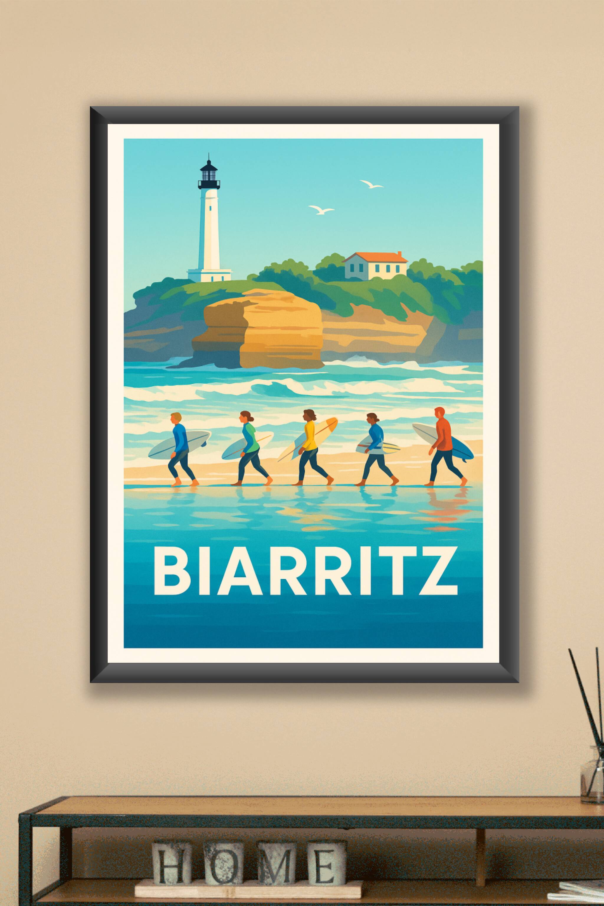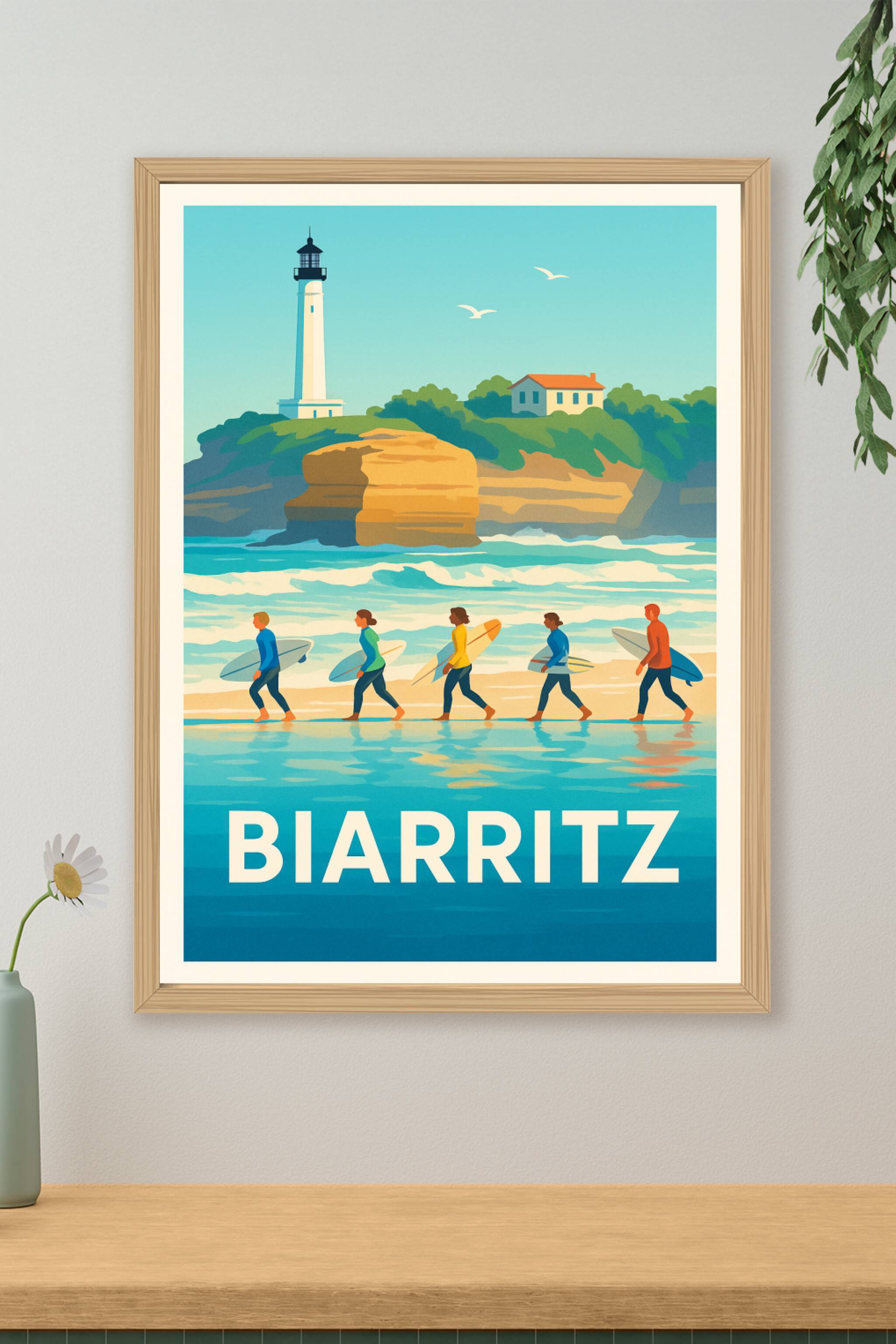 Découvrez l'ambiance vivante et lumineuse de Biarritz avec cette magnifique affiche illustrée mettant en scène les célèbres surfeurs au pied du pha...