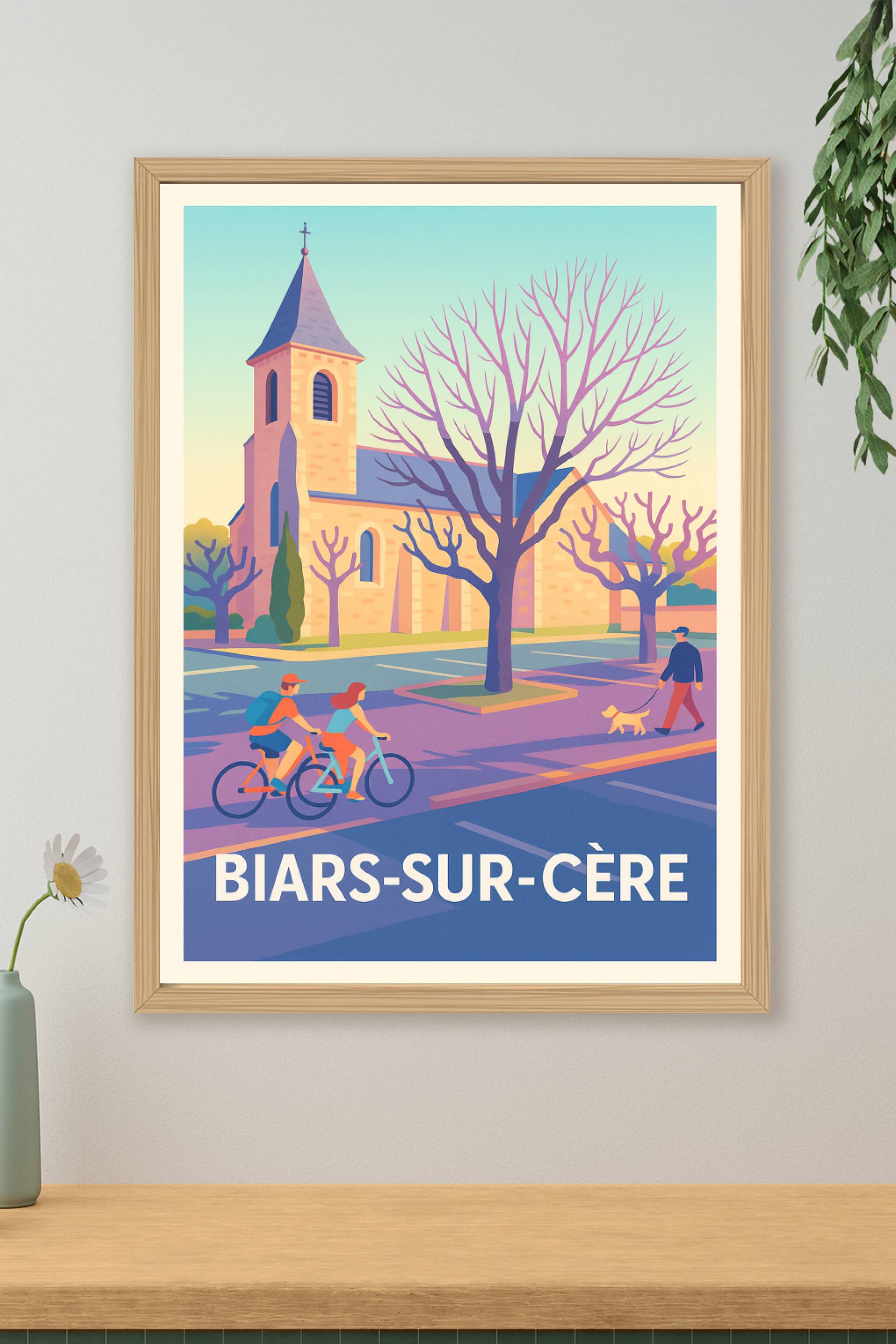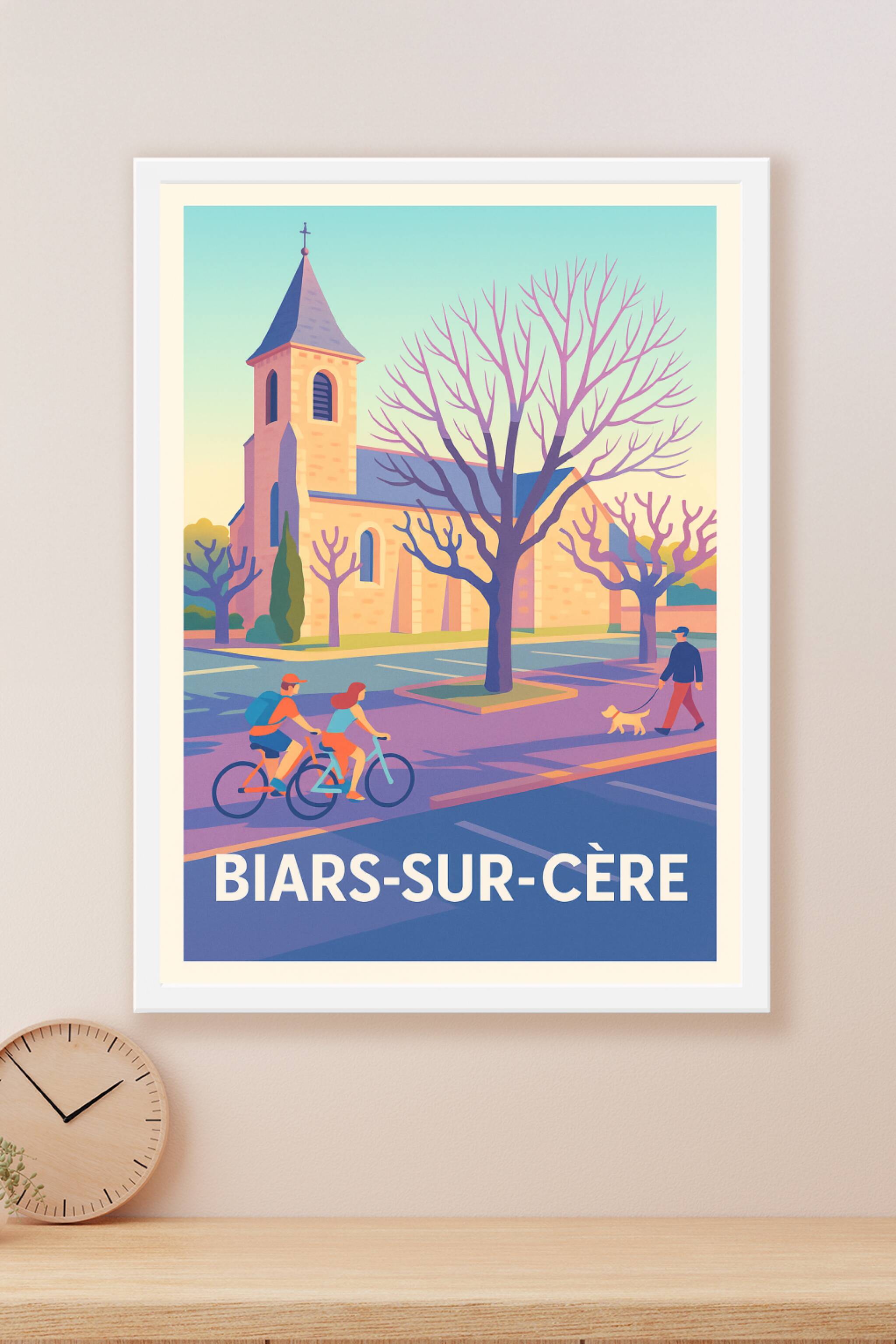 Découvrez l'atmosphère tranquille et charmante de Biars-sur-Cère avec cette affiche illustrée mettant en scène une église typique et une balade quo...