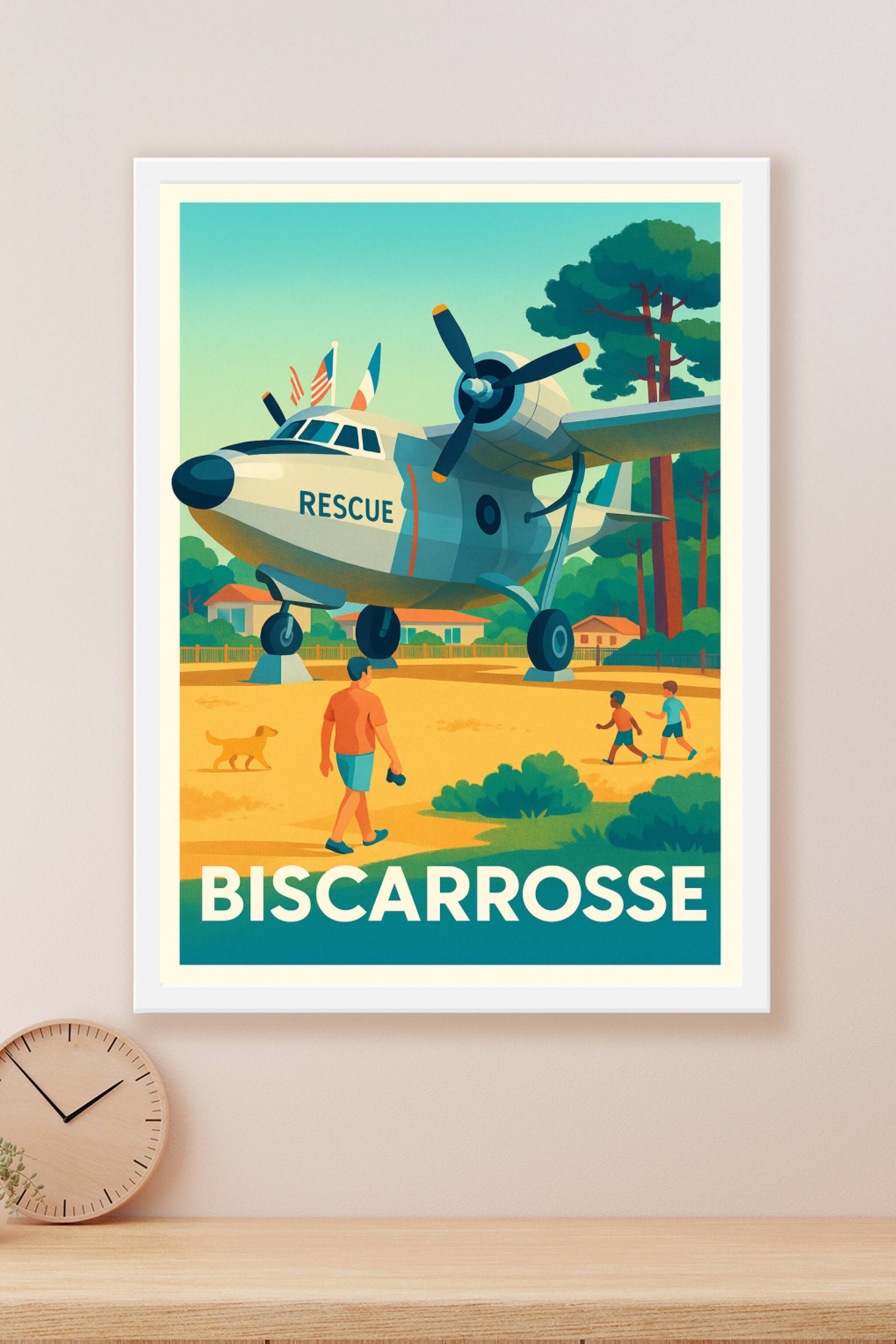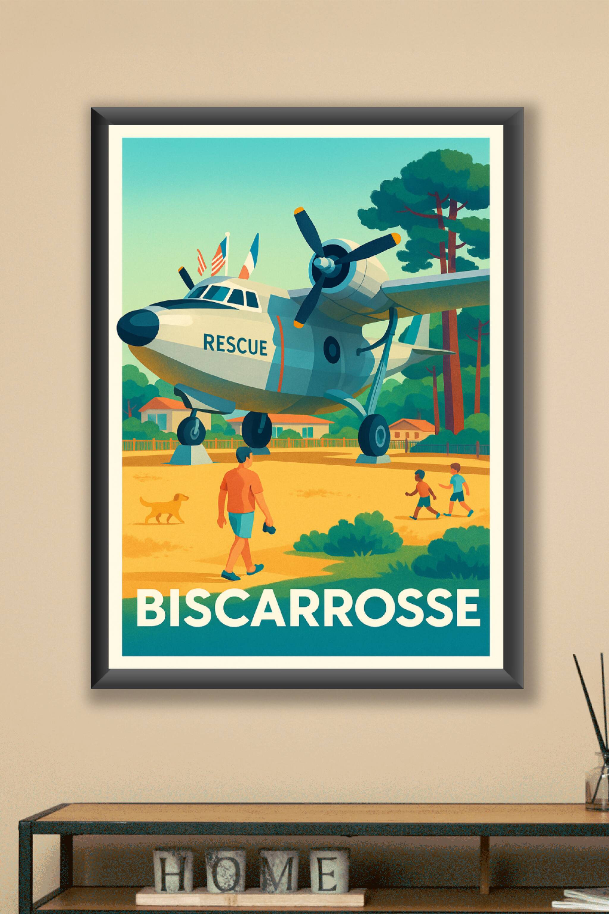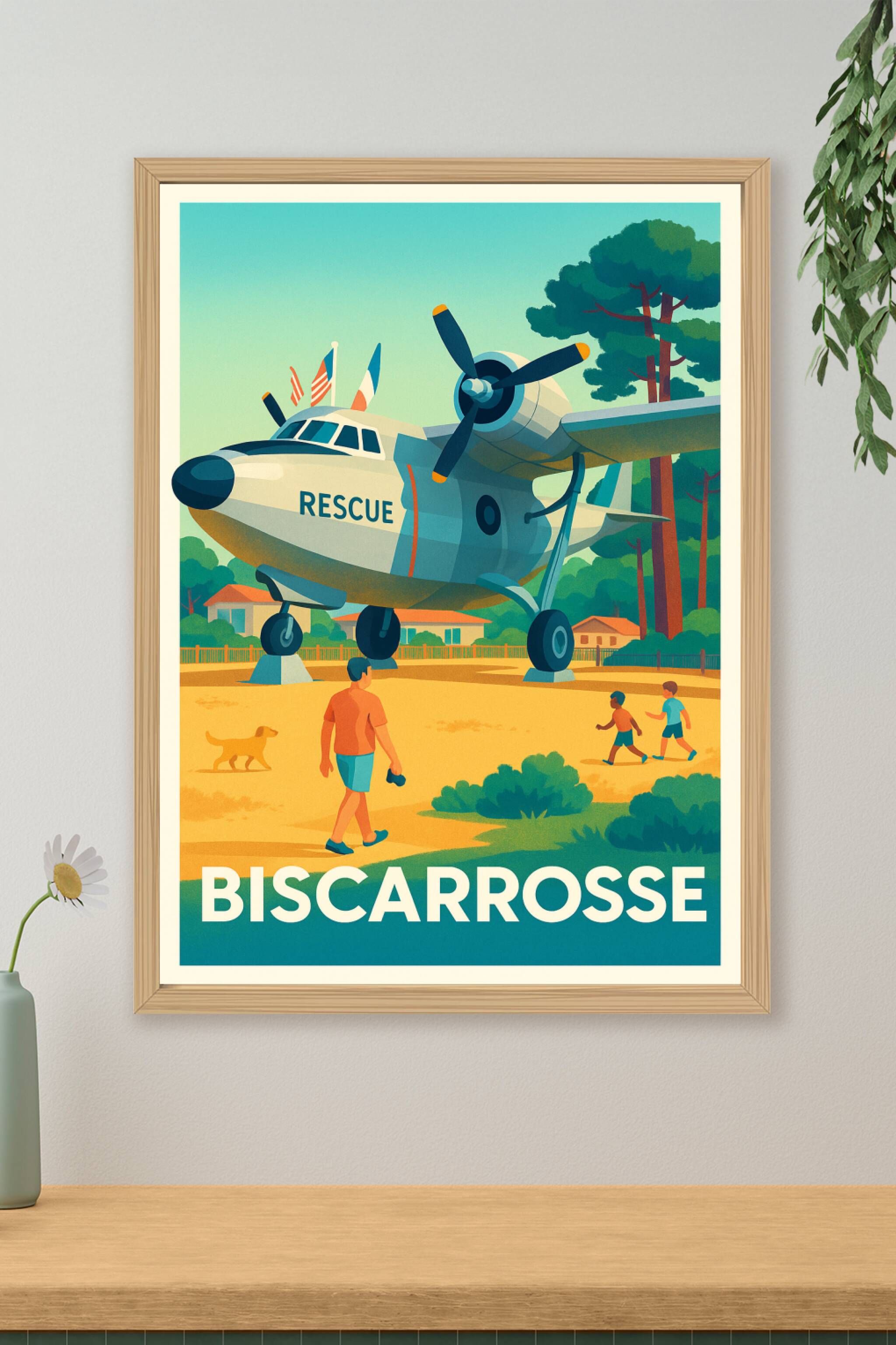 Découvrez l'illustration vintage qui met à l'honneur Biscarrosse, ville emblématique des hydravions et de la navigation aérienne. Cette affiche captivante dépeint un appareil de secours posé dans un cadre naturel, évoquant à la fois l'histoire aéronautique et la douceur de vivre de la région.Ce poster est disponible en tirage "Fine Art" sur papier 305g coton, garantissant une qualité d'impression exceptionnelle et des couleurs éclatantes. Choisissez votre taille idéale du format A4 à A1, avec ou sans cadre, pour orner vos murs et apporter une touche rétro et authentique à votre décoration intérieure.Fabriqué en France avec un soin particulier, cet affichage original est parfait pour les amateurs d'histoire, d'aviation ou les amoureux de Biscarrosse à la recherche d'une décoration unique et raffinée.