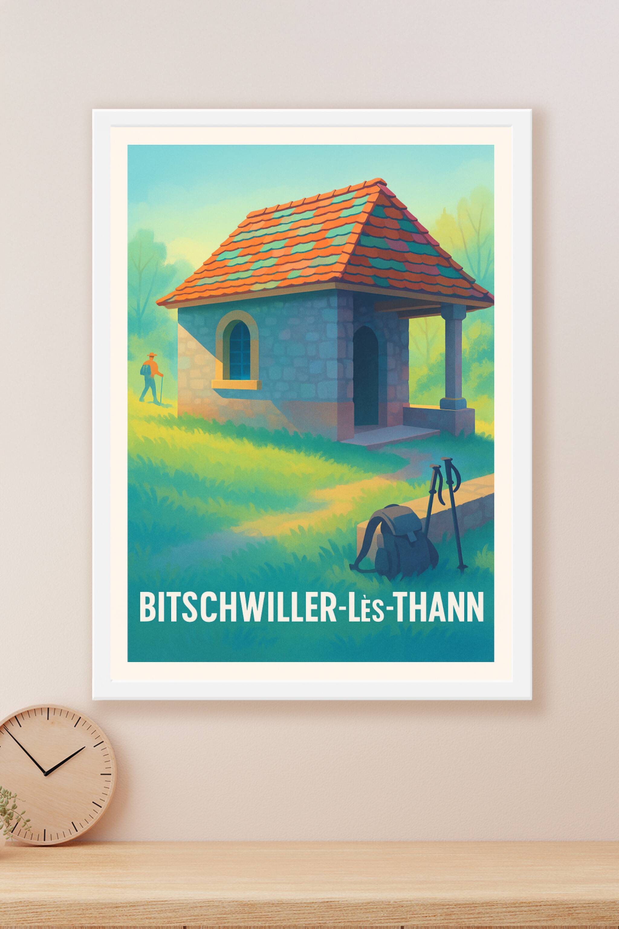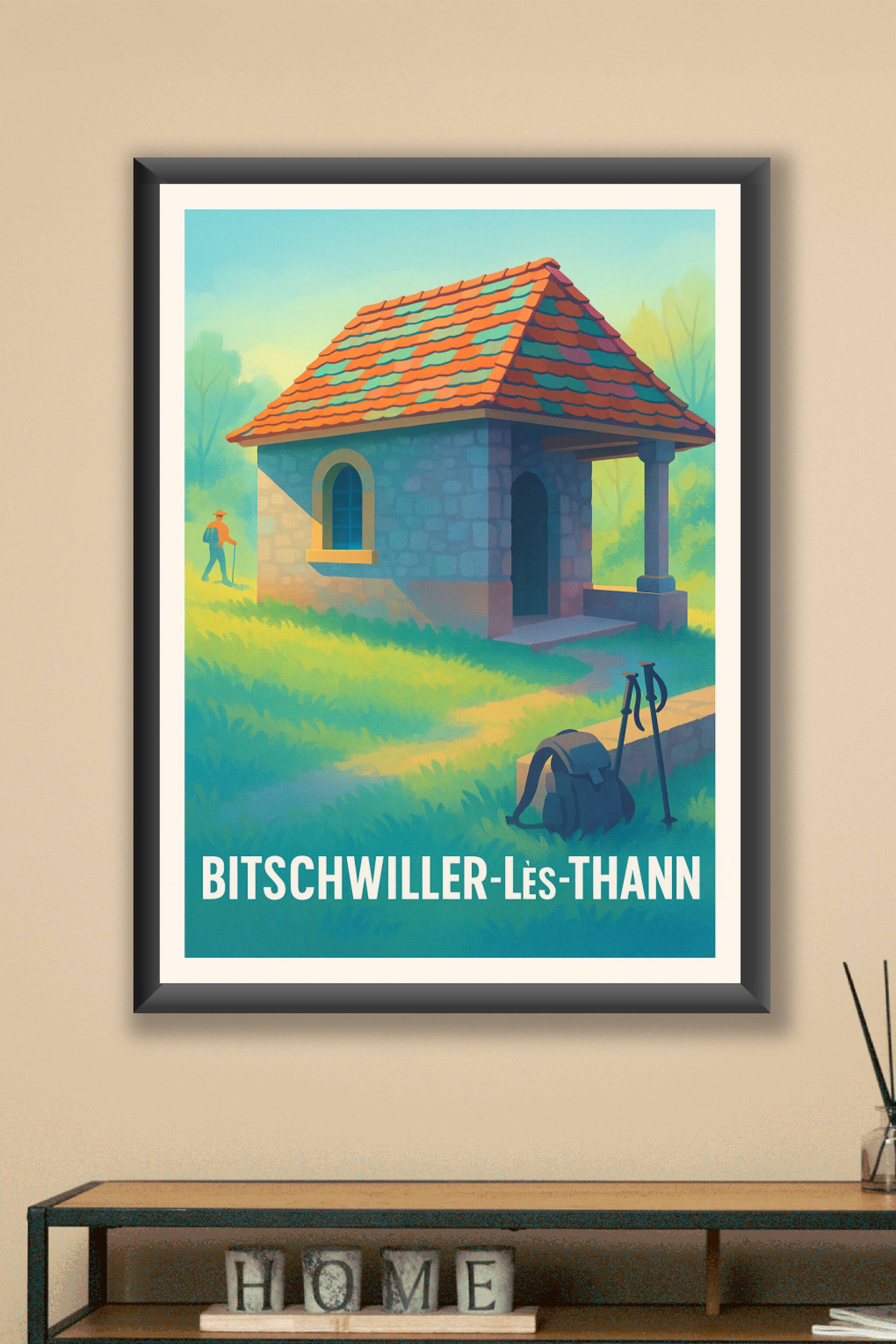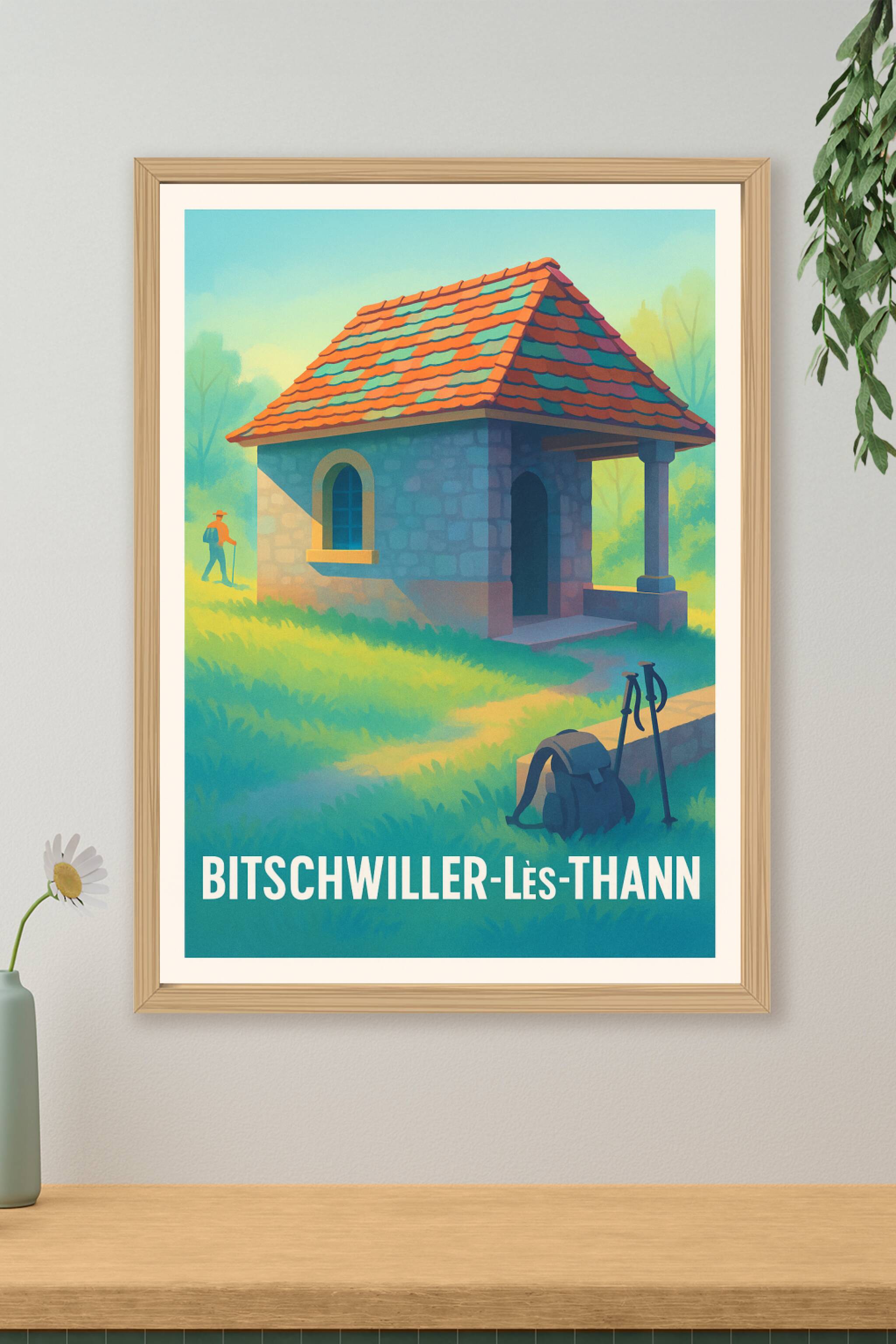 Découvrez la sérénité de Bitschwiller-lès-Thann avec cette affiche illustrée présentant une maison traditionnelle baignée par la lumière douce du m...