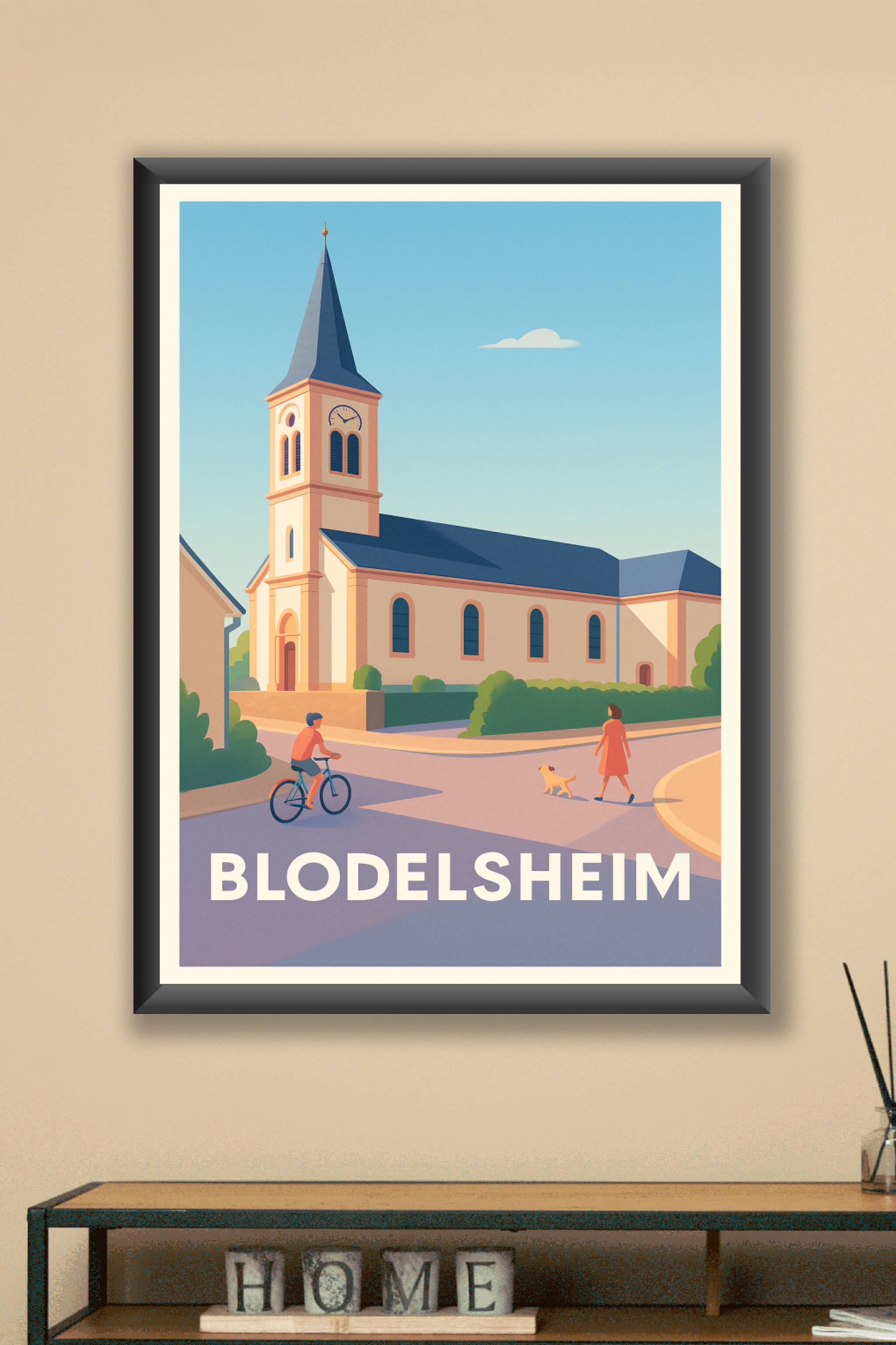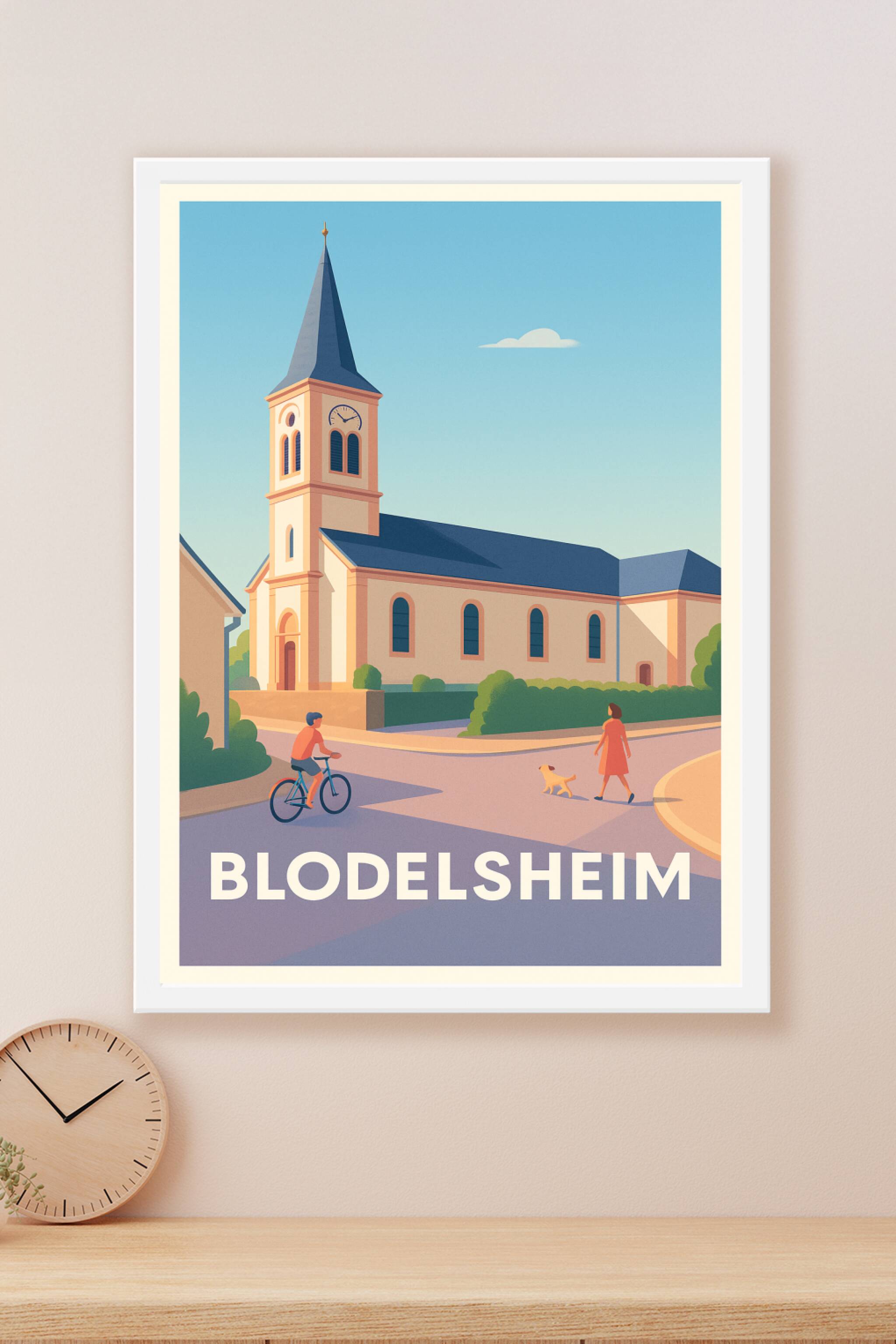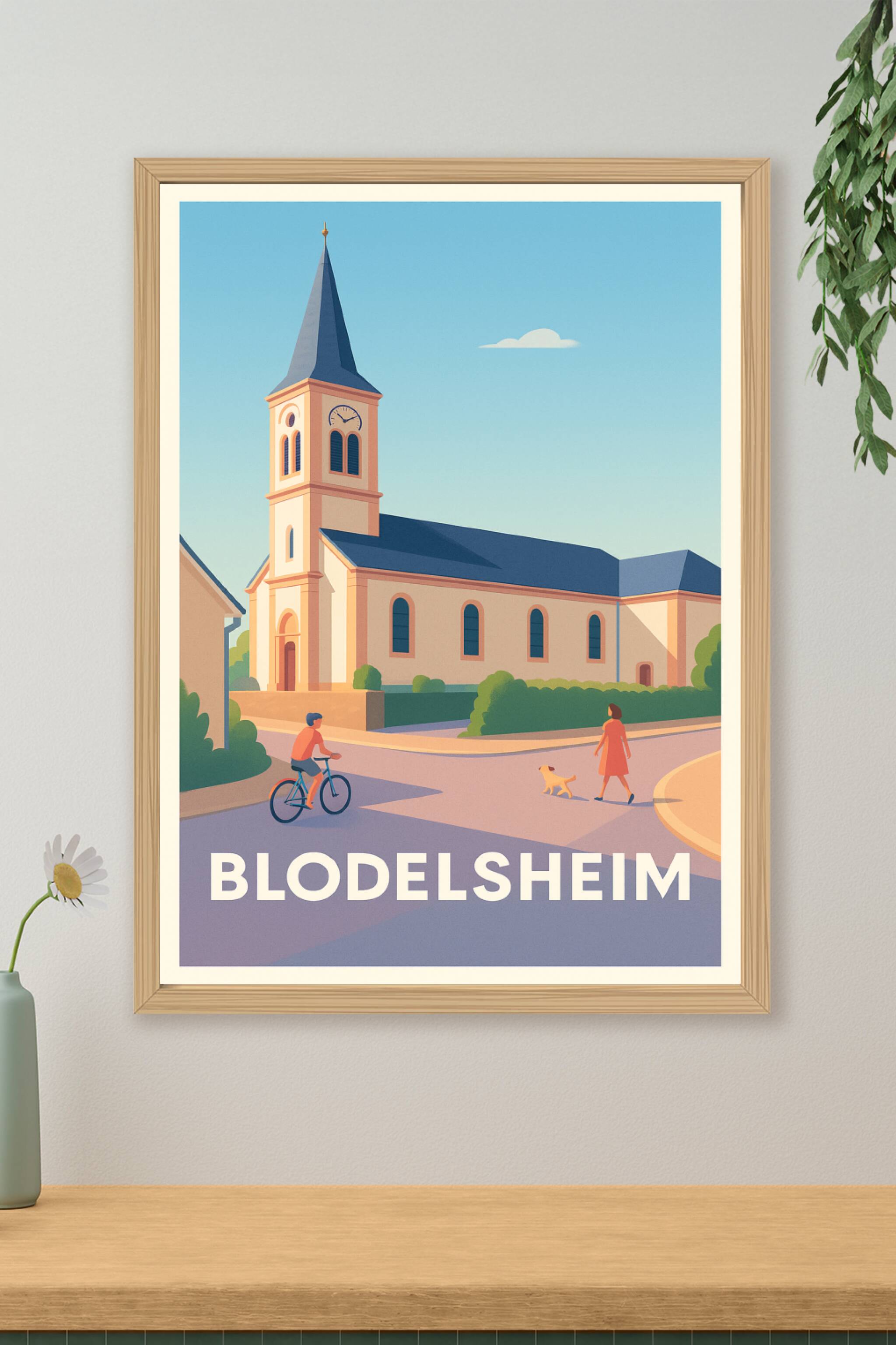 Découvrez la sérénité de Blodelsheim avec cette affiche illustrée représentant l'église emblématique du village sous un ciel clair. Ce poster aux t...