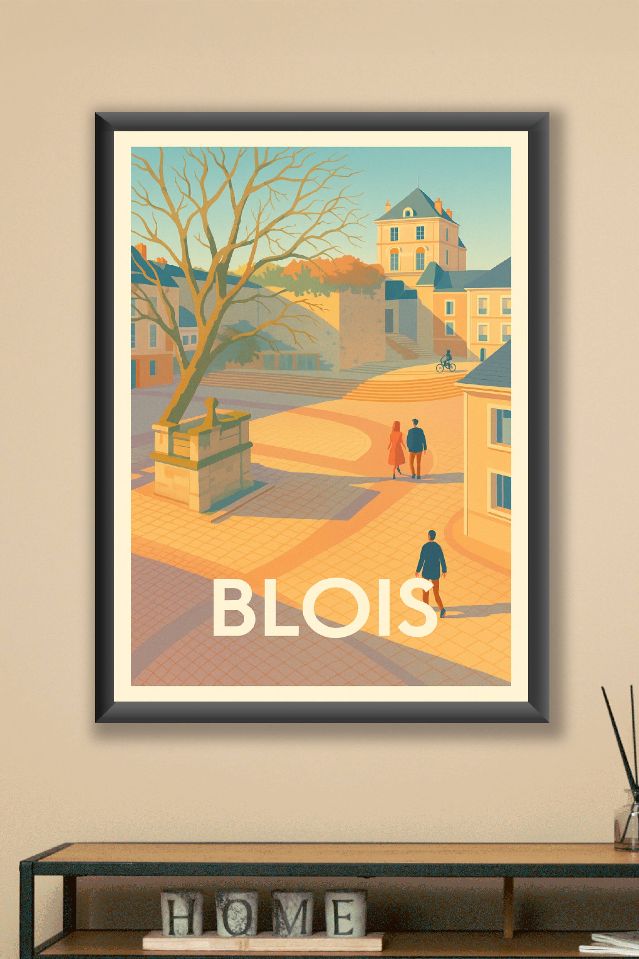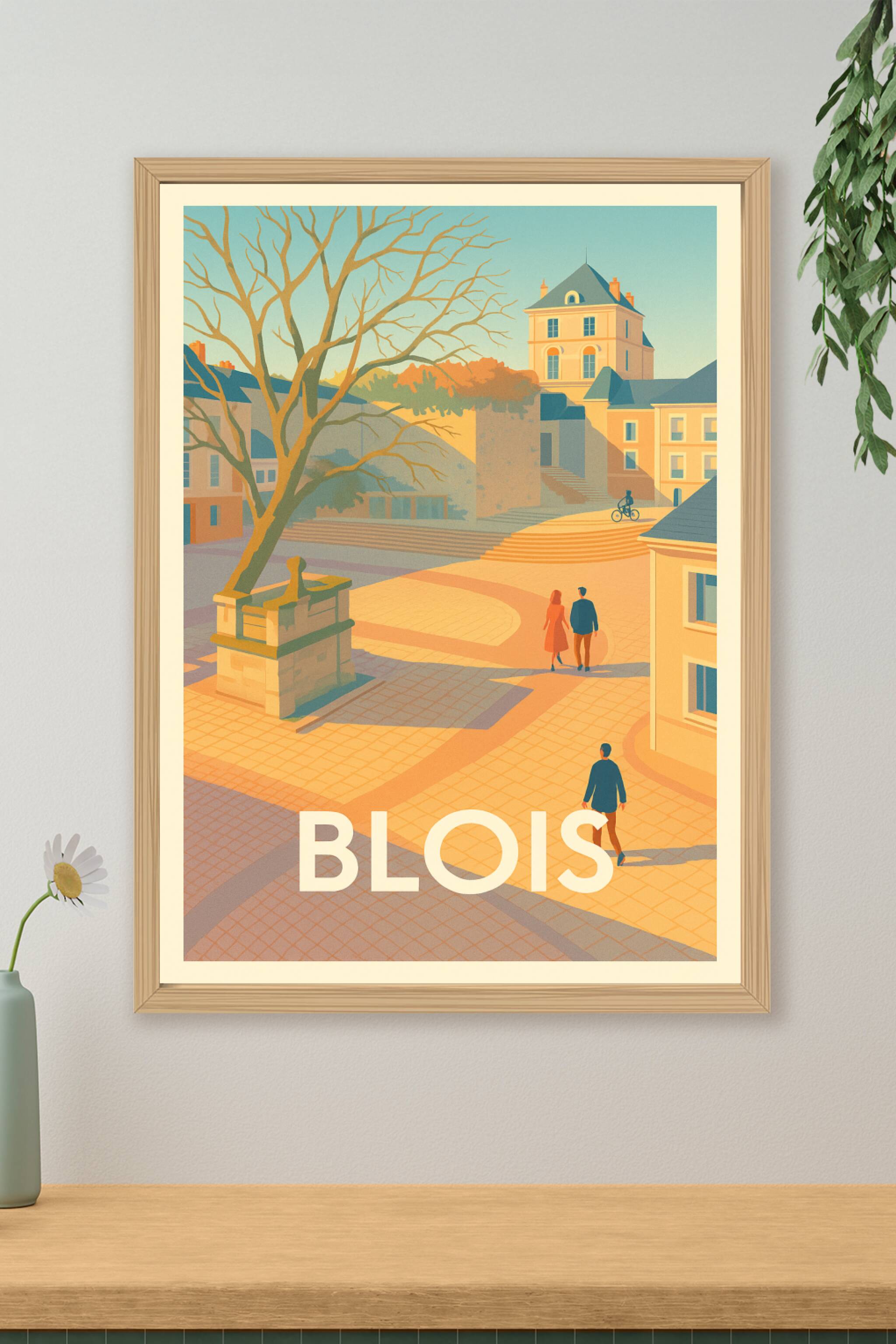 Découvrez l'élégance et le charme de Blois à travers cette affiche au style pictural chaleureux, illustrant une place baignée de lumière dorée et a...