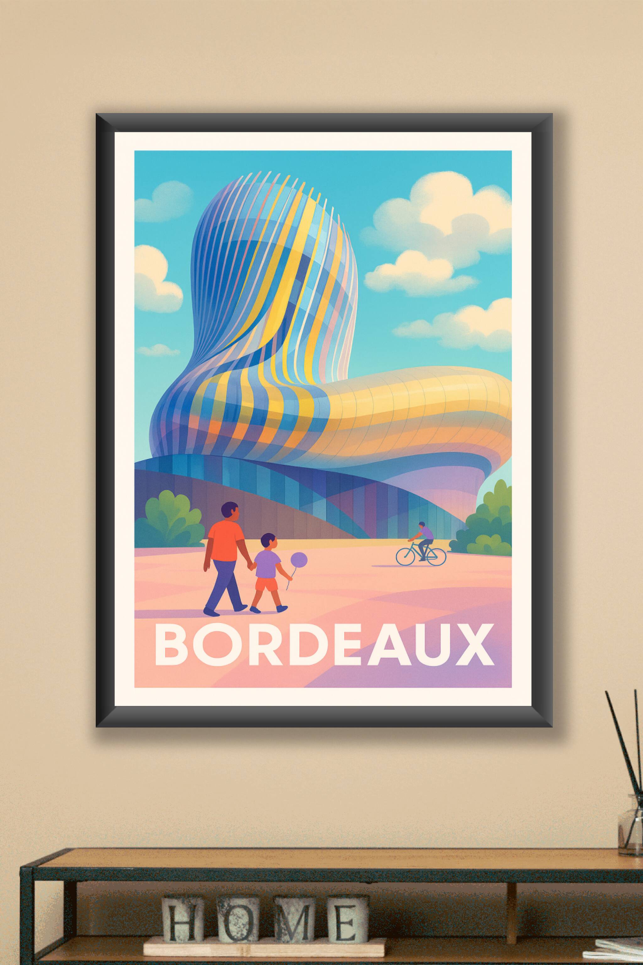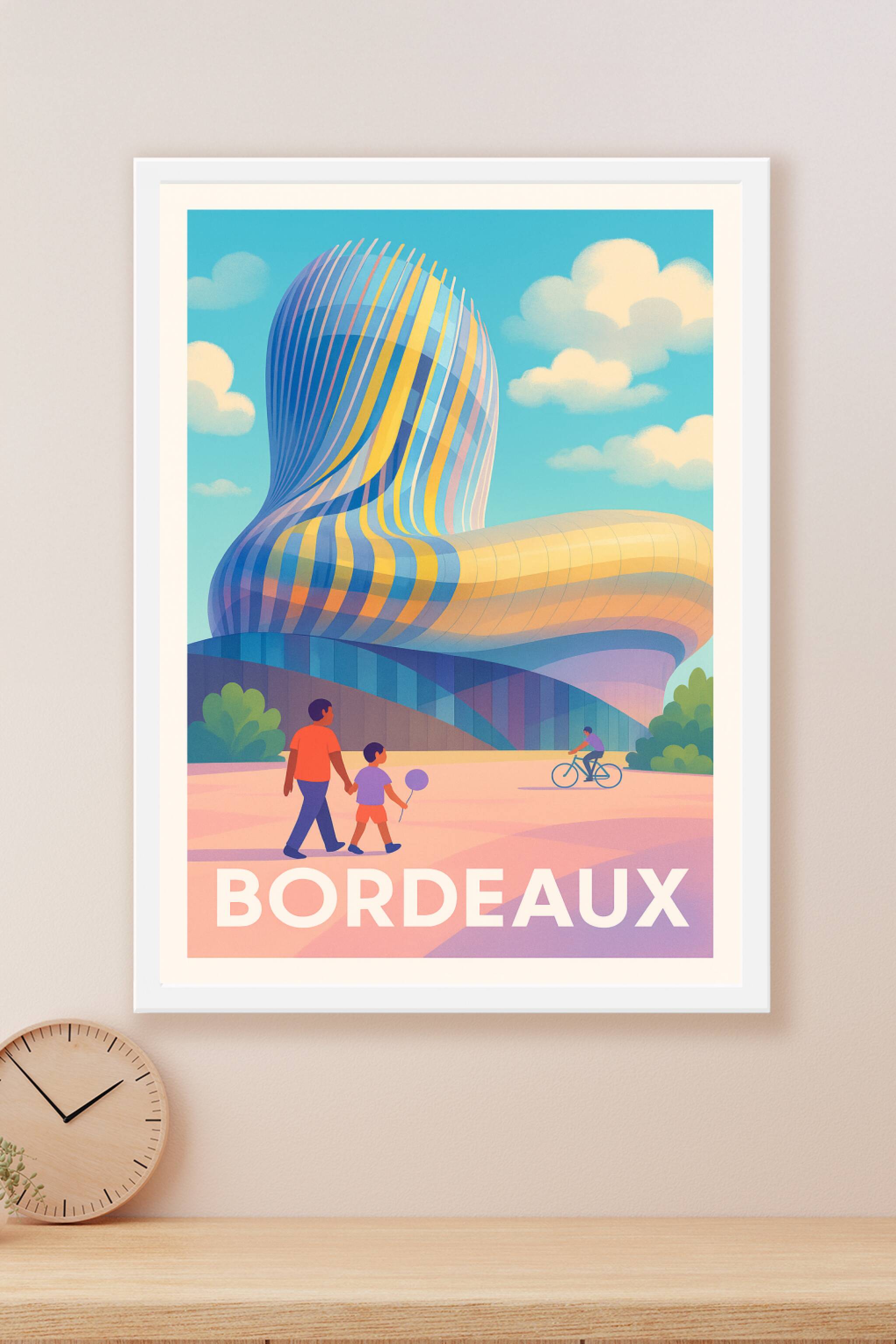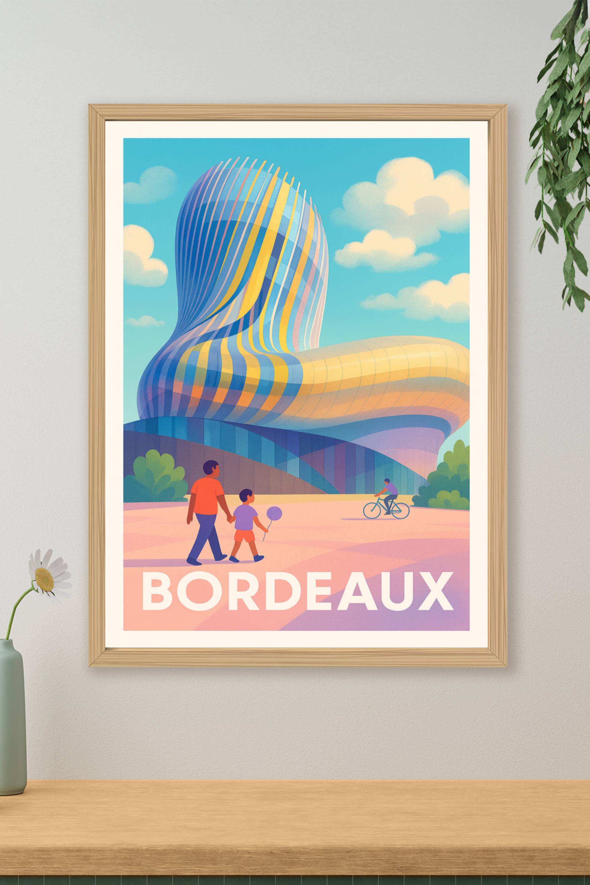Capturez l'esprit audacieux et contemporain de Bordeaux avec cette affiche illustrée de la Cité du Vin, joyau architectural et emblème culturel de la ville. Ce poster au style néo-rétro met en lumière les lignes fluides et les reflets chatoyants de ce bâtiment iconique, sous un ciel azur plein de douceur. Parfait pour les passionnés d'œnologie ou les amoureux de Bordeaux, ce tirage « Fine Art » est imprimé sur du papier 305g 100% coton pour un rendu exceptionnel. Disponible en formats A1 à A4, avec ou sans cadre, cette affiche est idéale pour embellir votre intérieur ou offrir un souvenir élégant. Une impression de qualité premium, entièrement réalisée en France.
