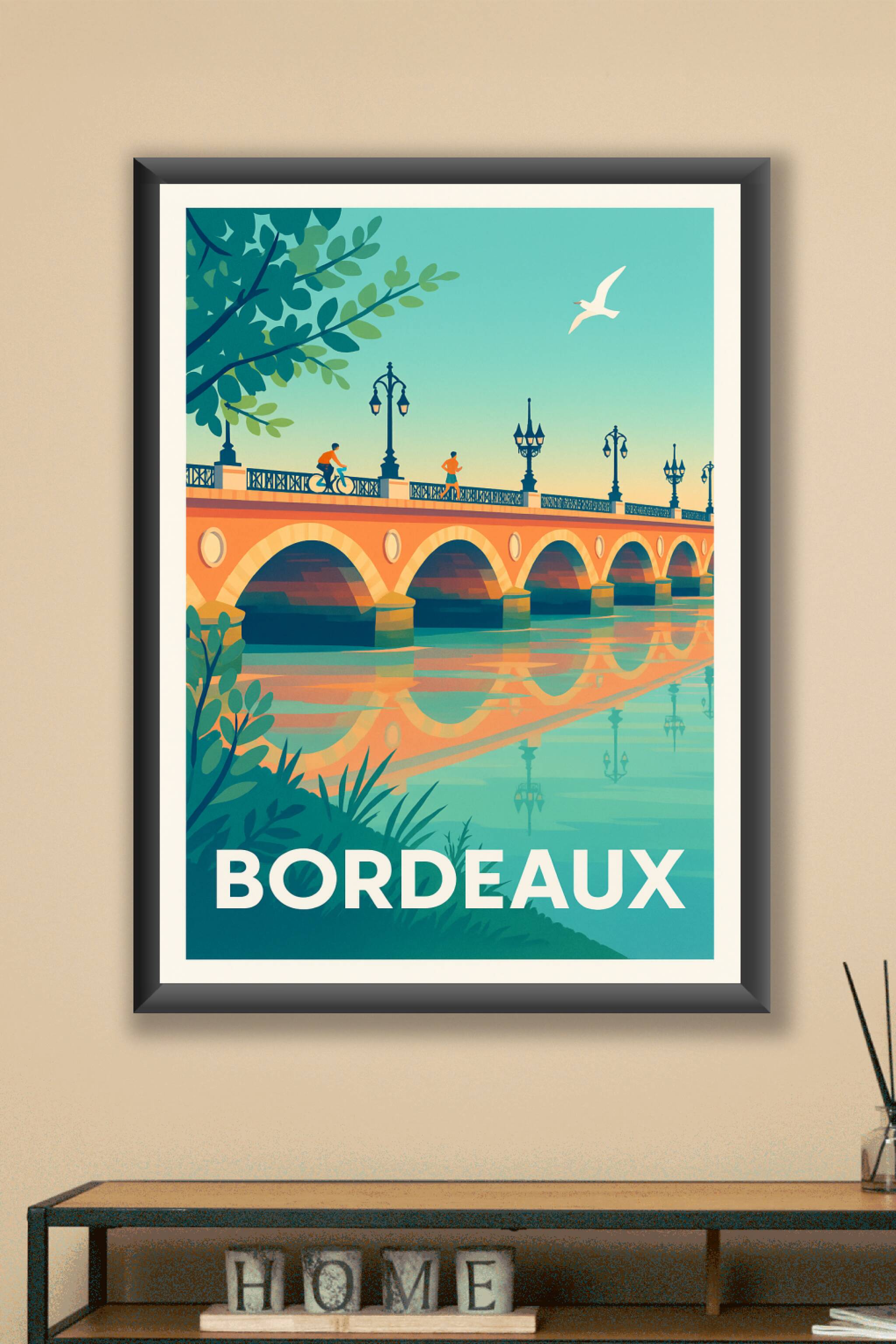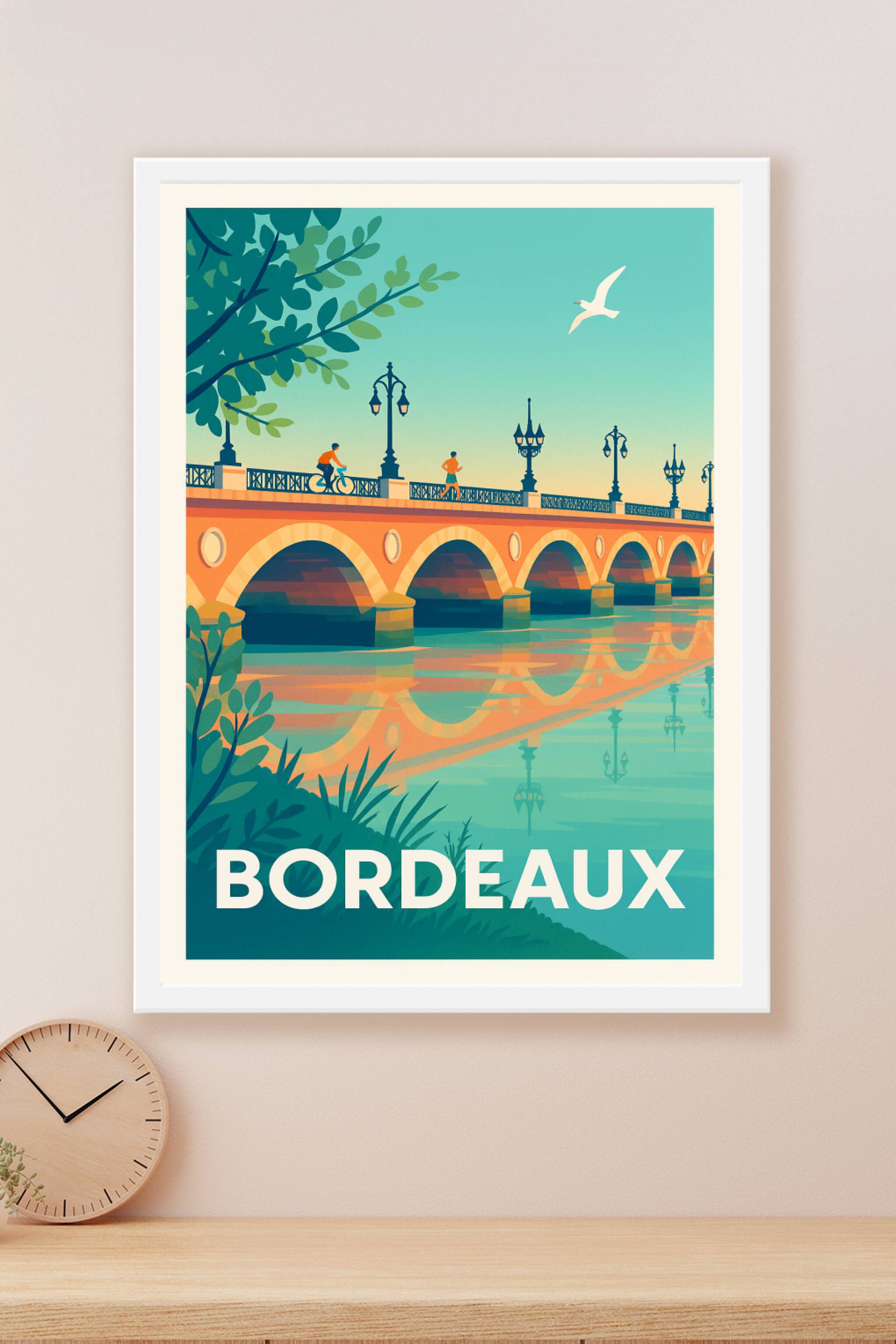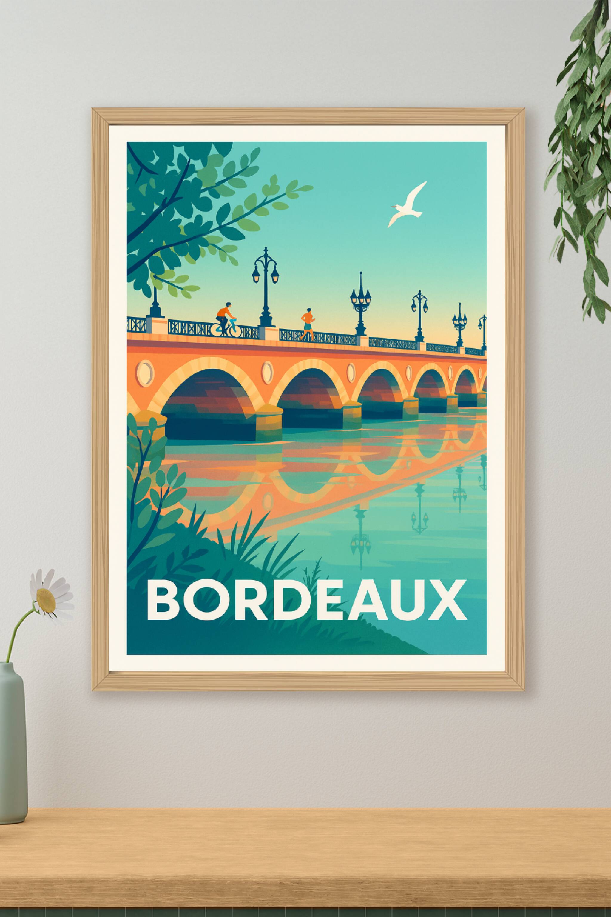 Laissez-vous séduire par l’élégance intemporelle de Bordeaux avec cette affiche illustrée du célèbre Pont de Pierre. Entre lumière dorée du matin e...