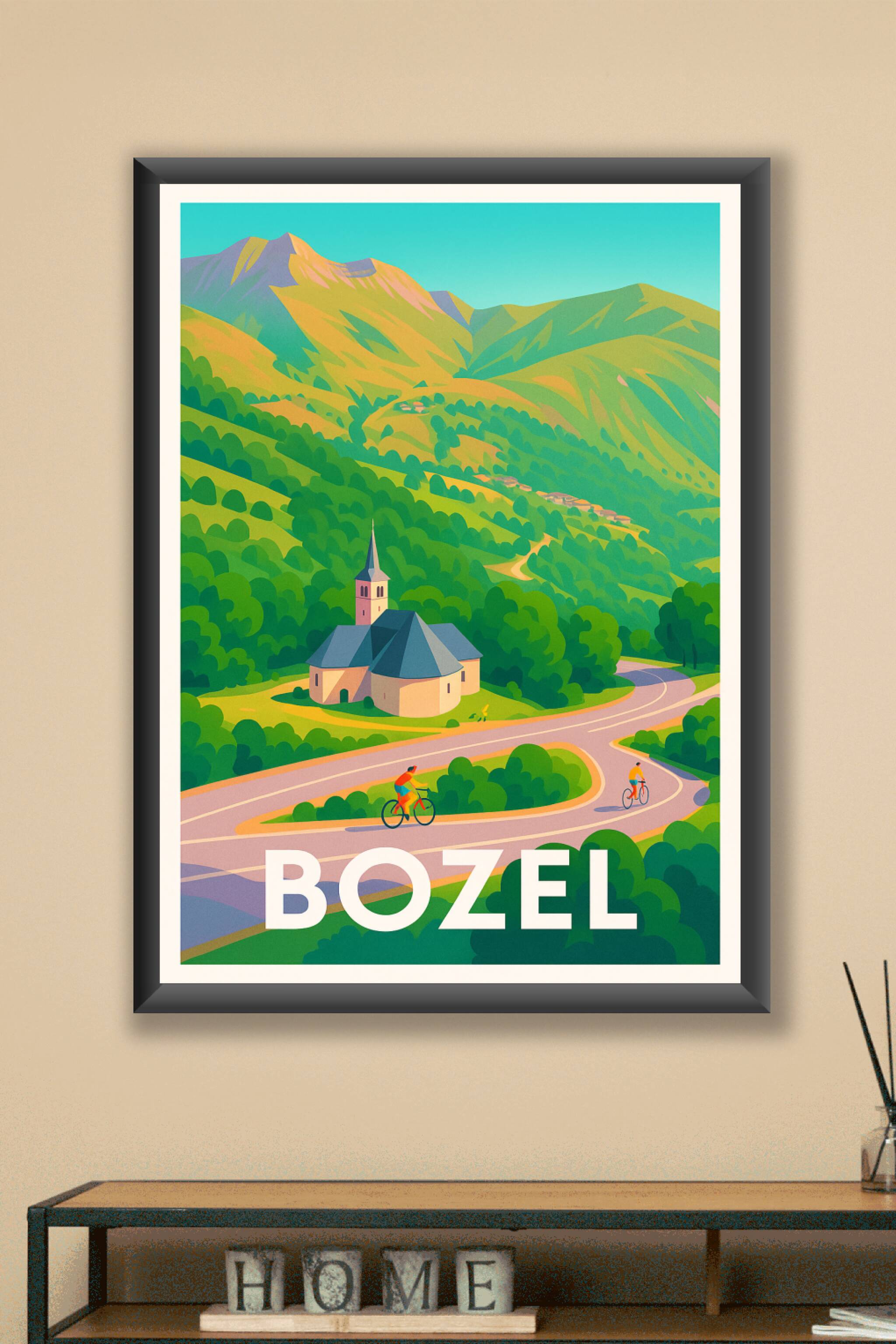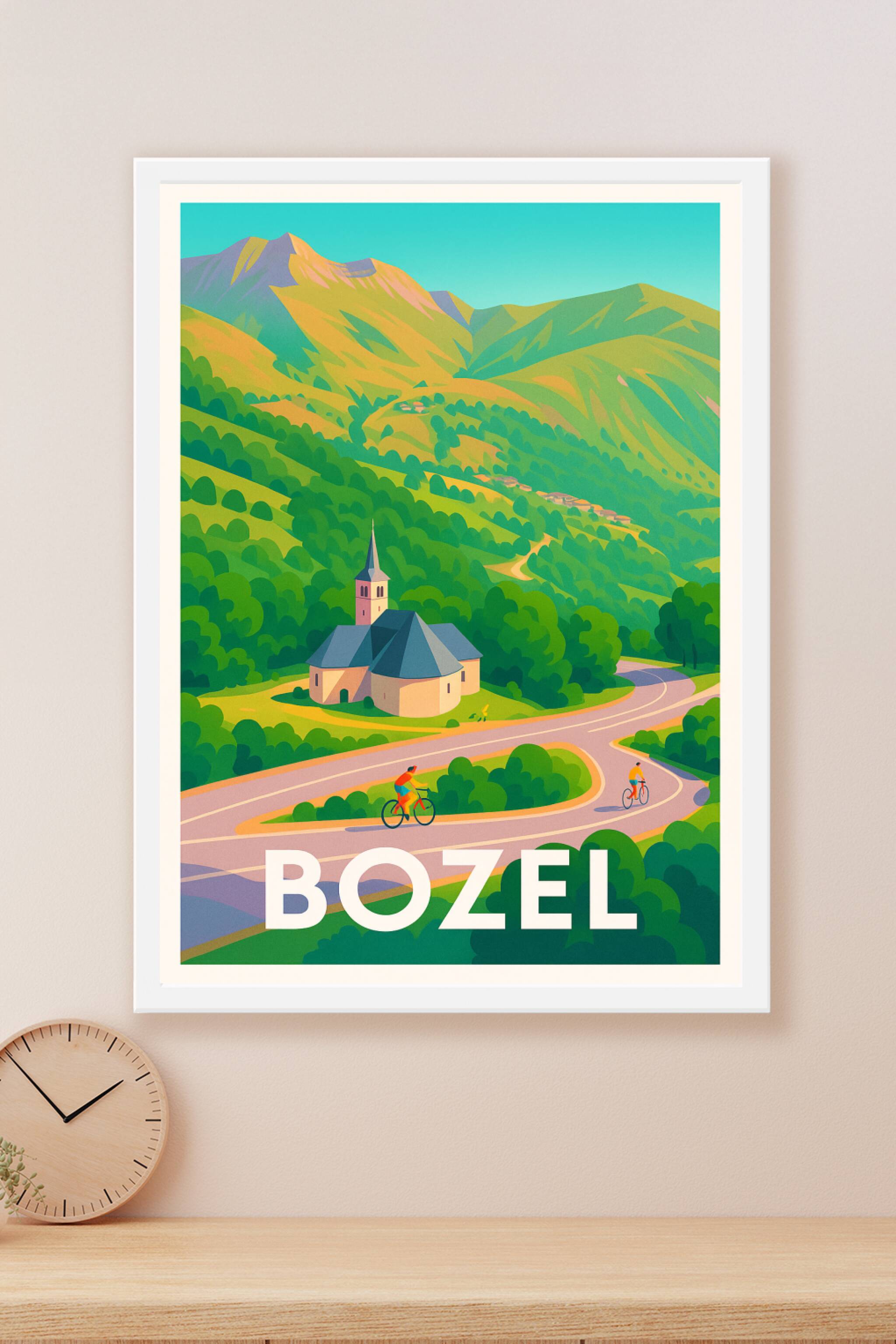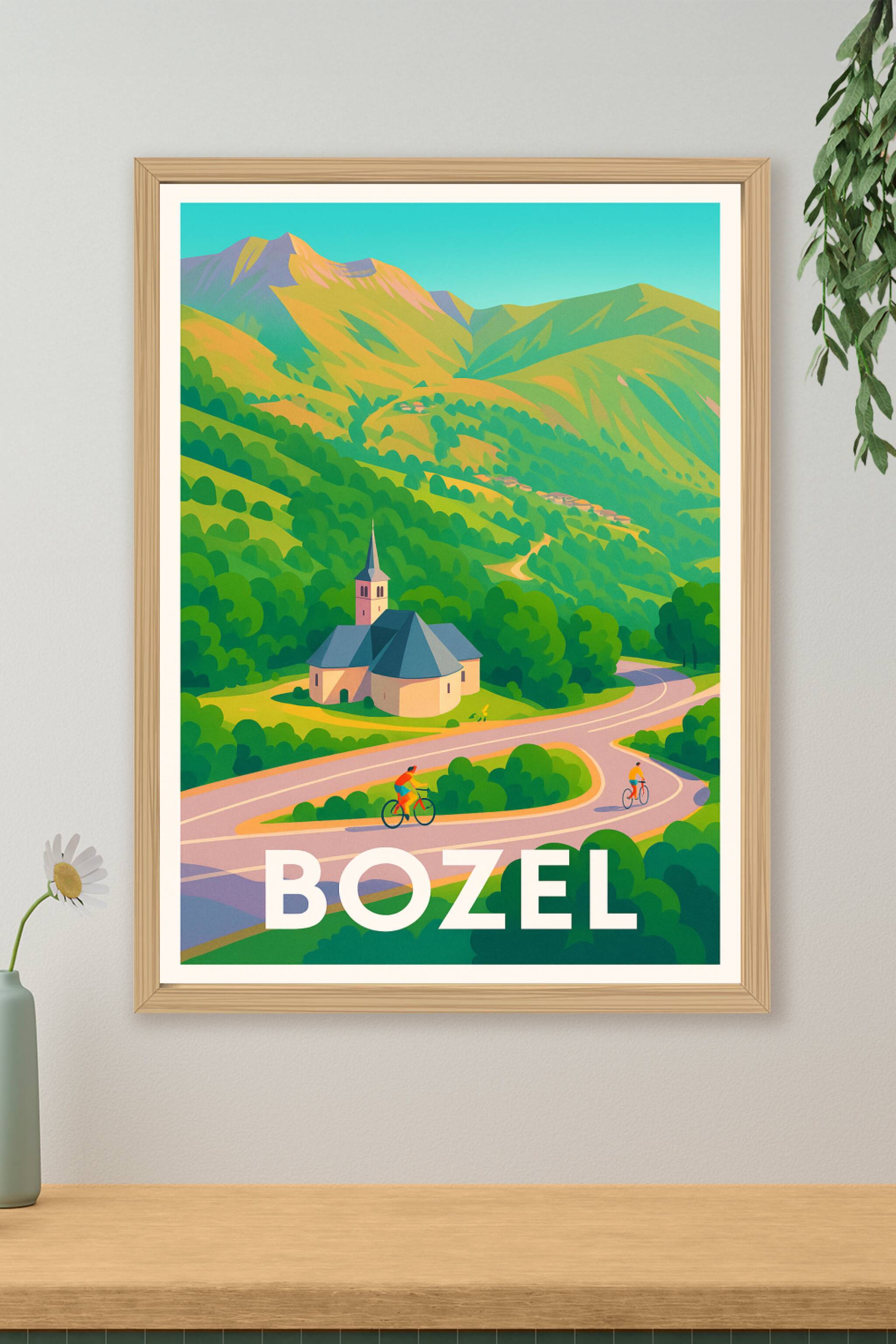 Découvrez l'atmosphère paisible et verdoyante de Bozel à travers ce poster illustré aux couleurs éclatantes et au style vintage. Cette affiche met ...