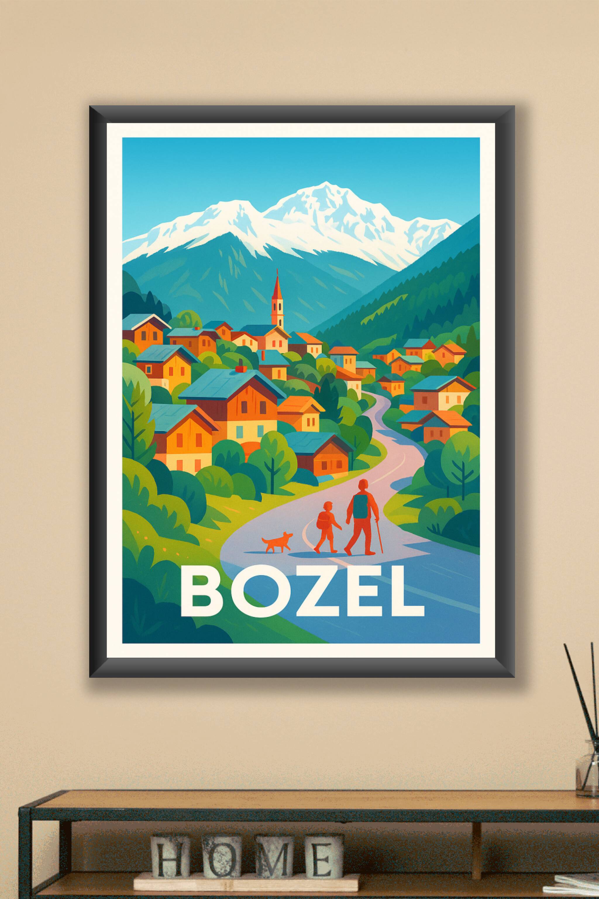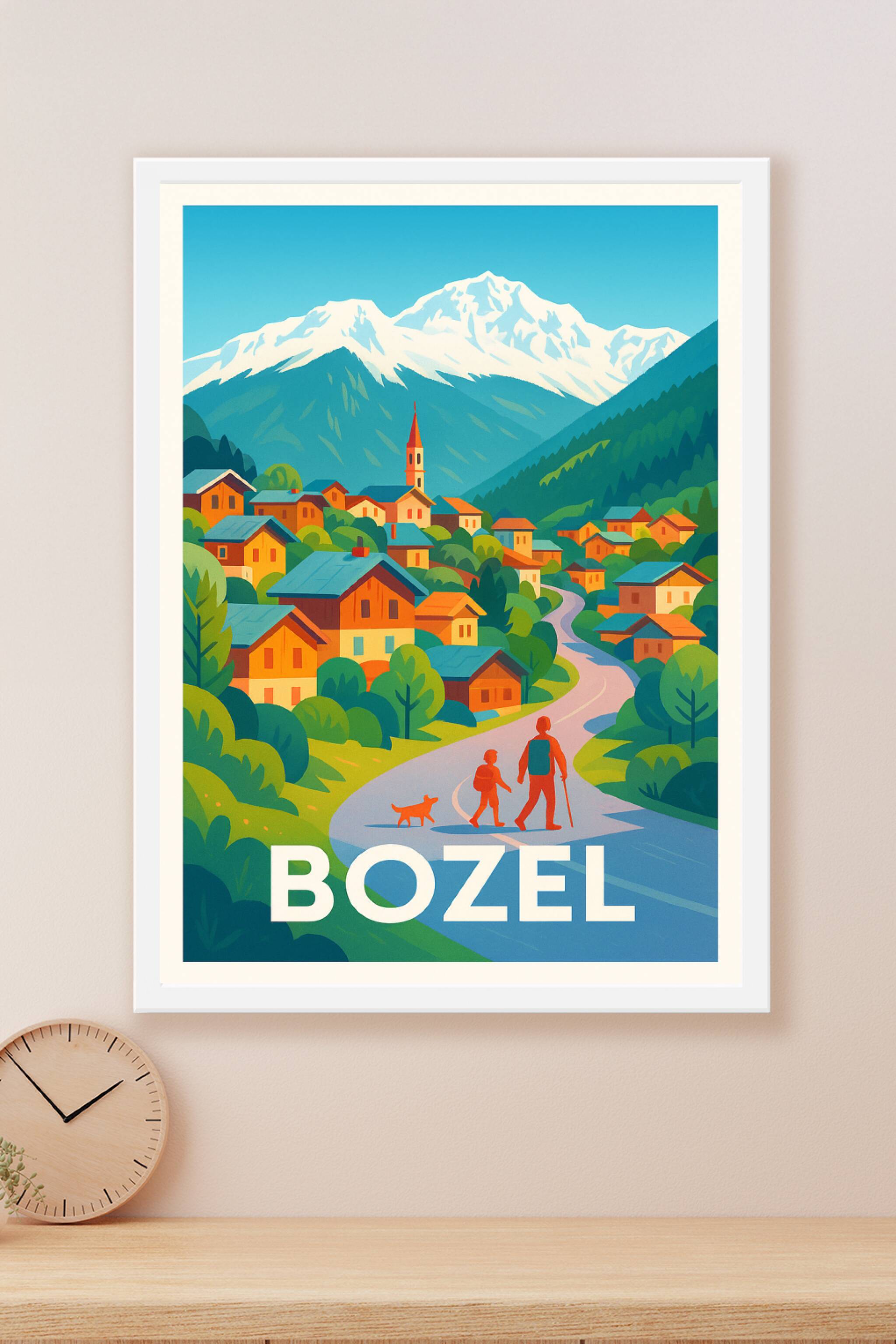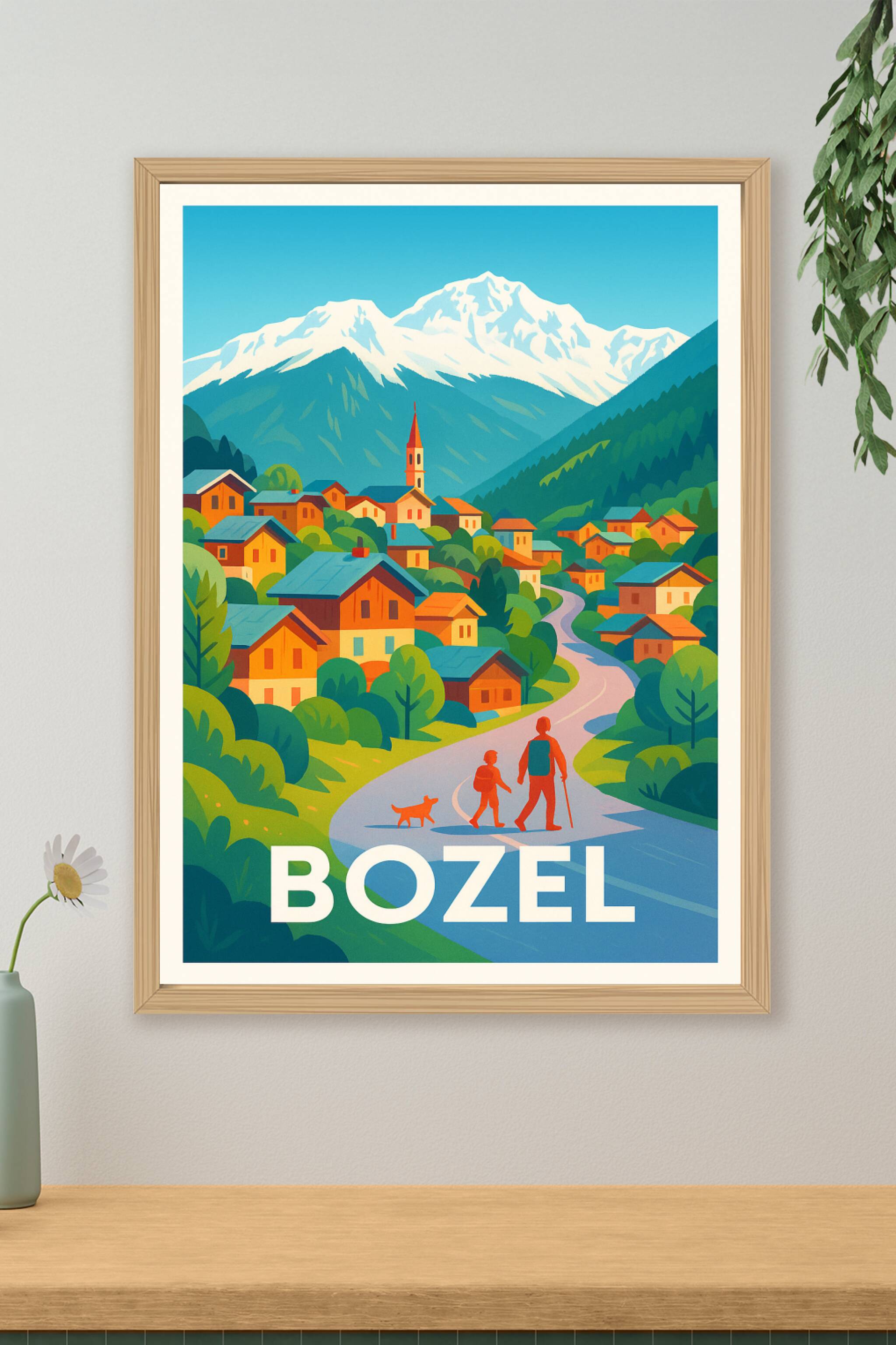 Découvrez l'envoûtante douceur de Bozel, un charmant village niché au cœur des montagnes, immortalisé dans cette affiche illustrée au style vibrant...