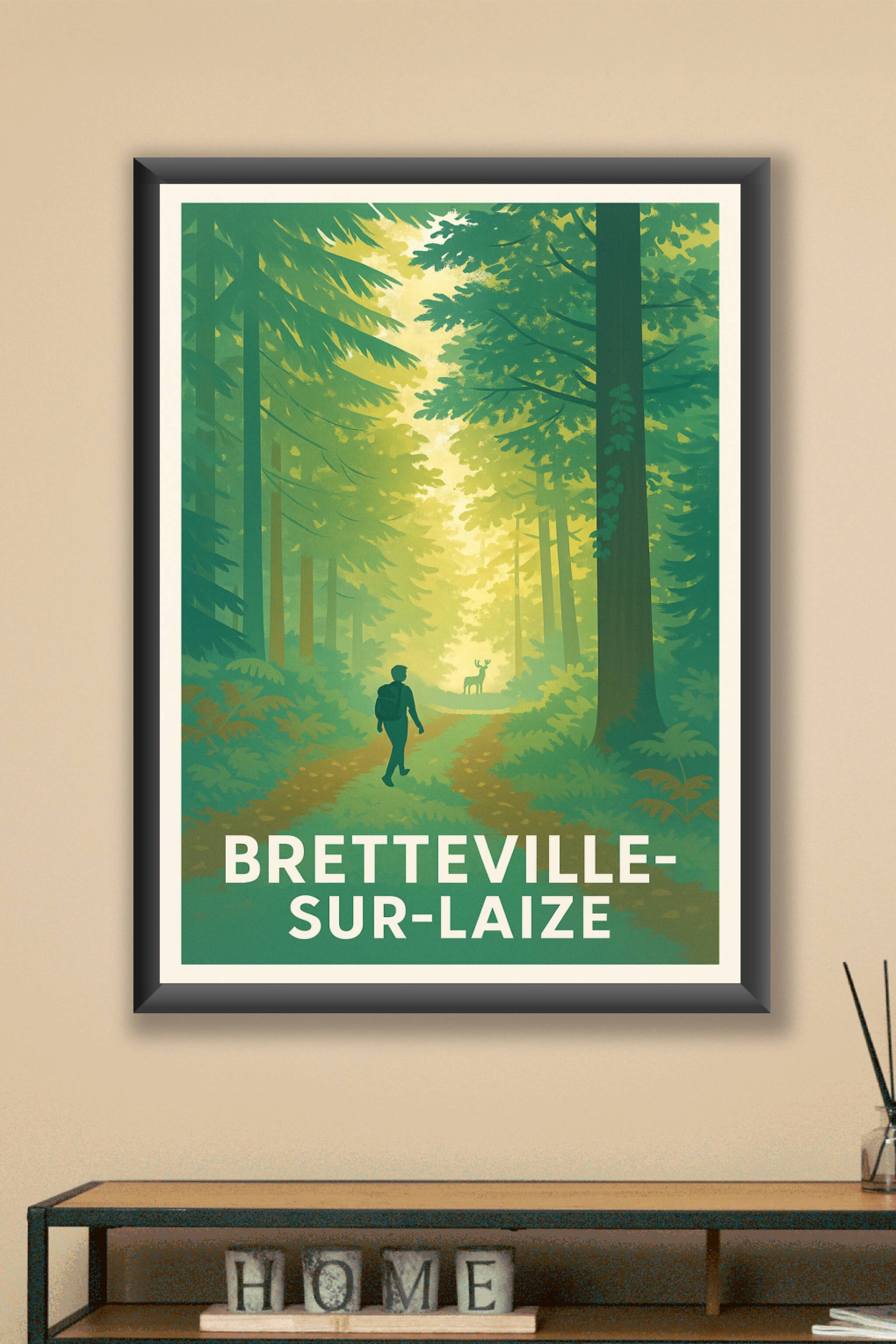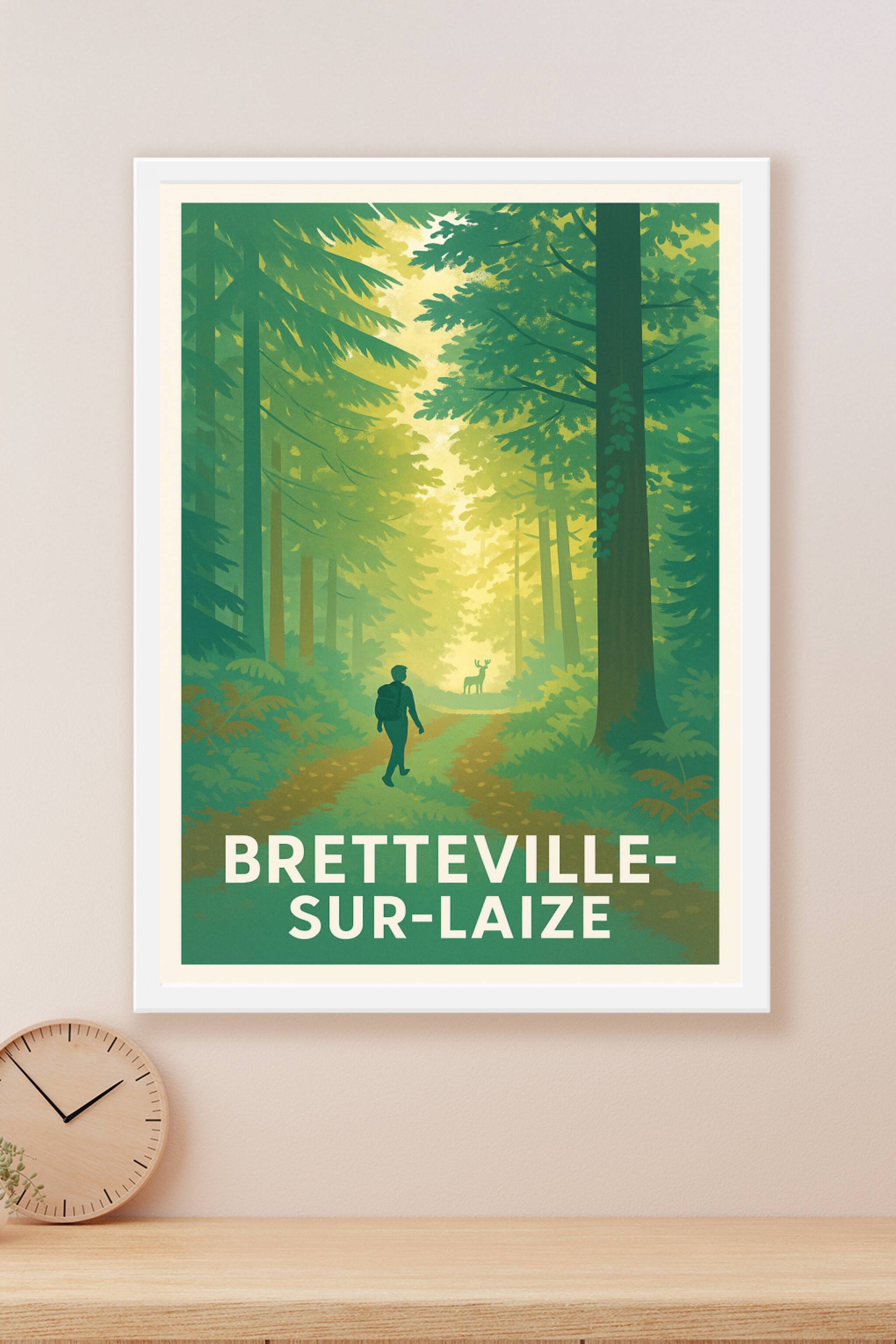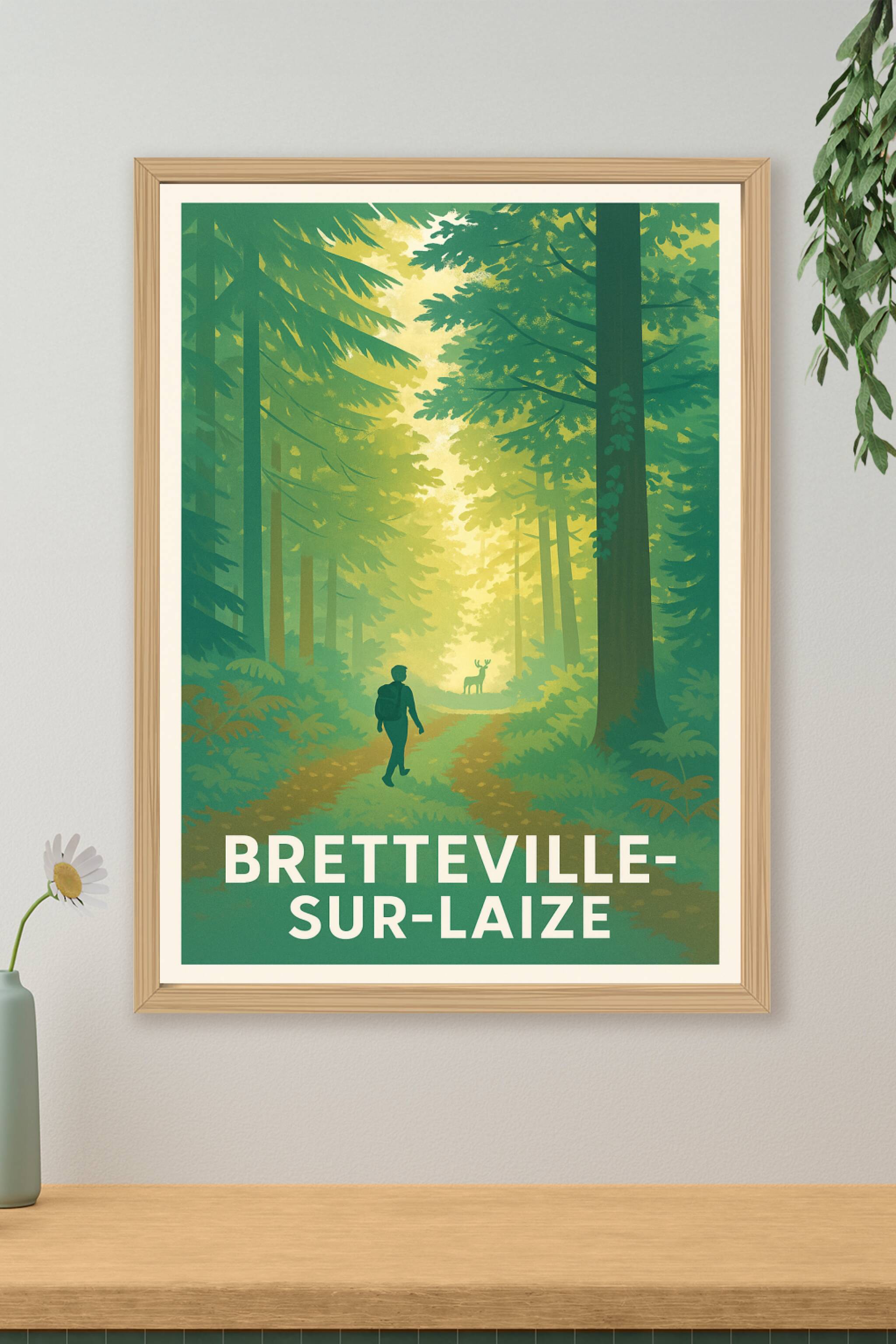 Découvrez la beauté paisible de Bretteville-sur-Laize à travers cette affiche illustrée qui capture une promenade en forêt baignée de lumière dorée...