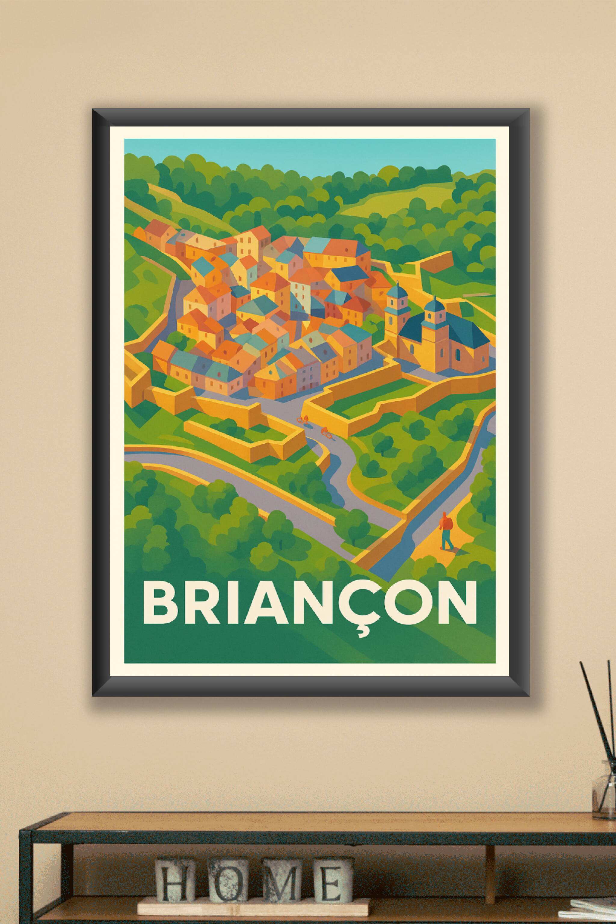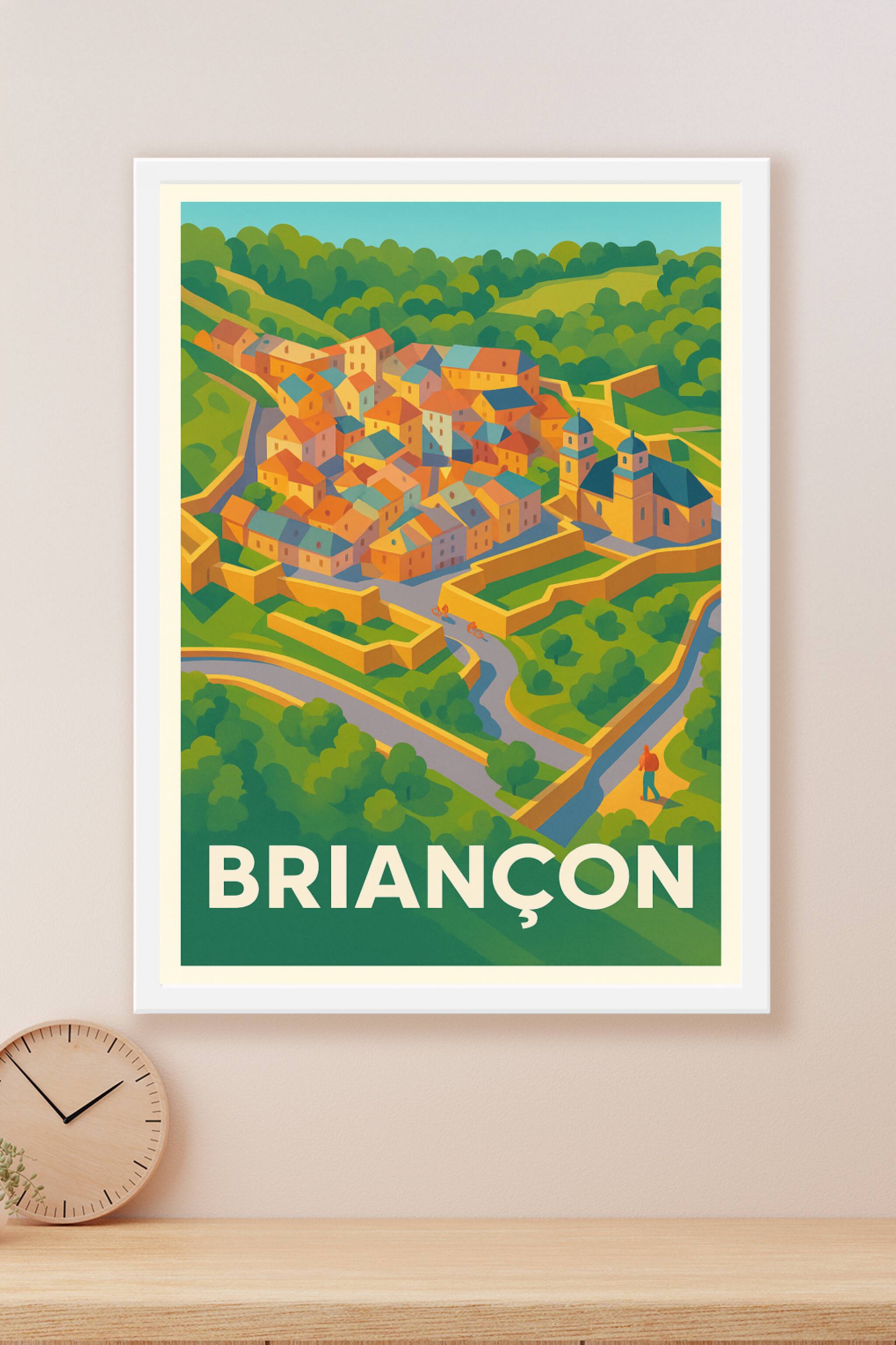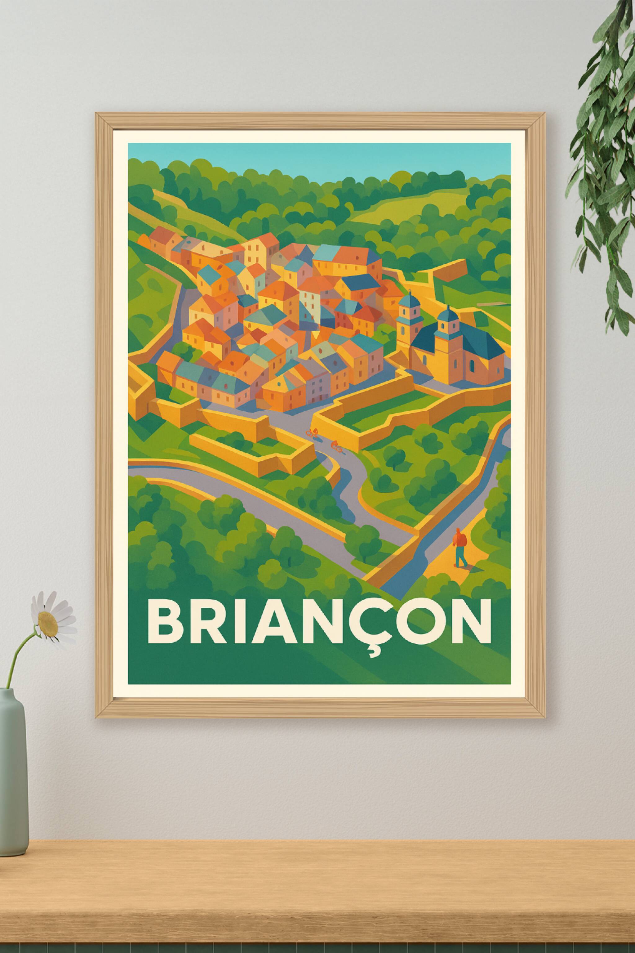 Découvrez la charmante citadelle de Briançon à travers cette affiche illustrée aux couleurs éclatantes et au style graphique unique. Ce poster met ...